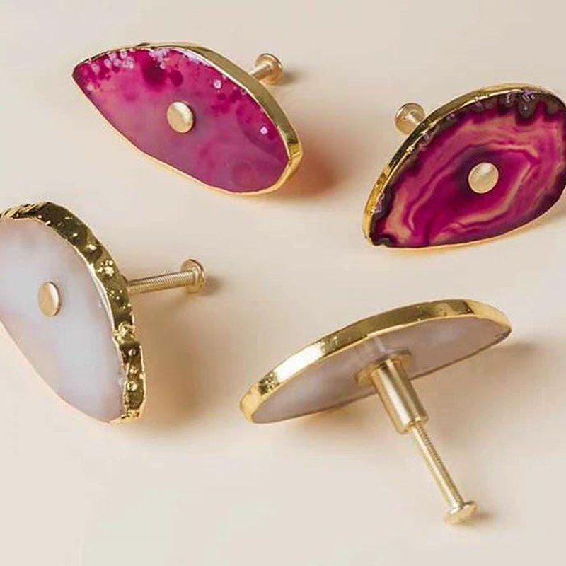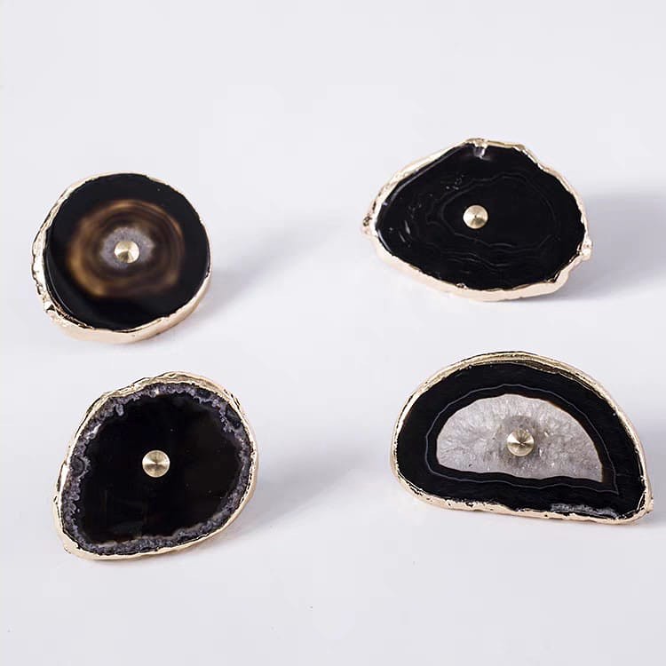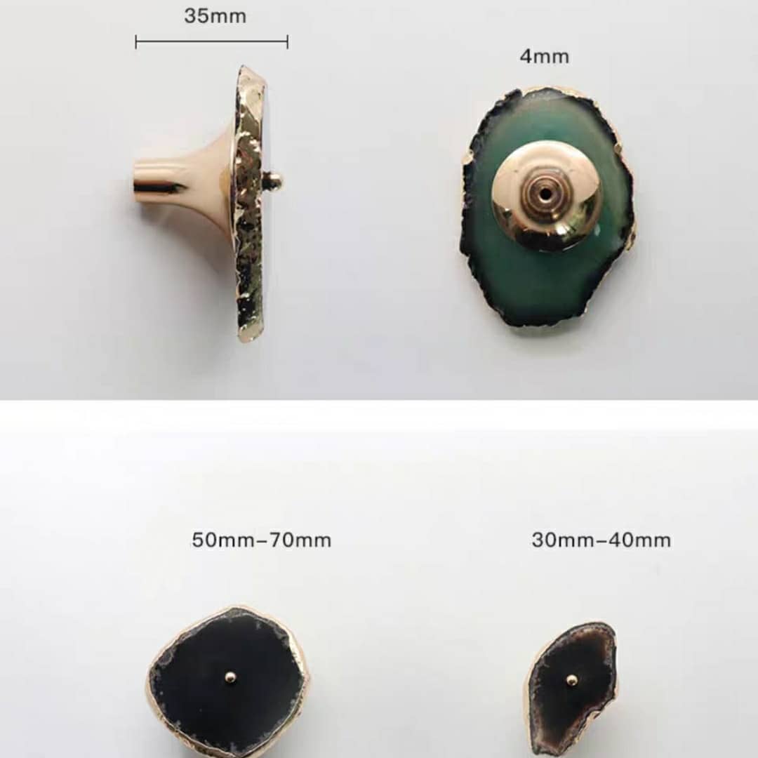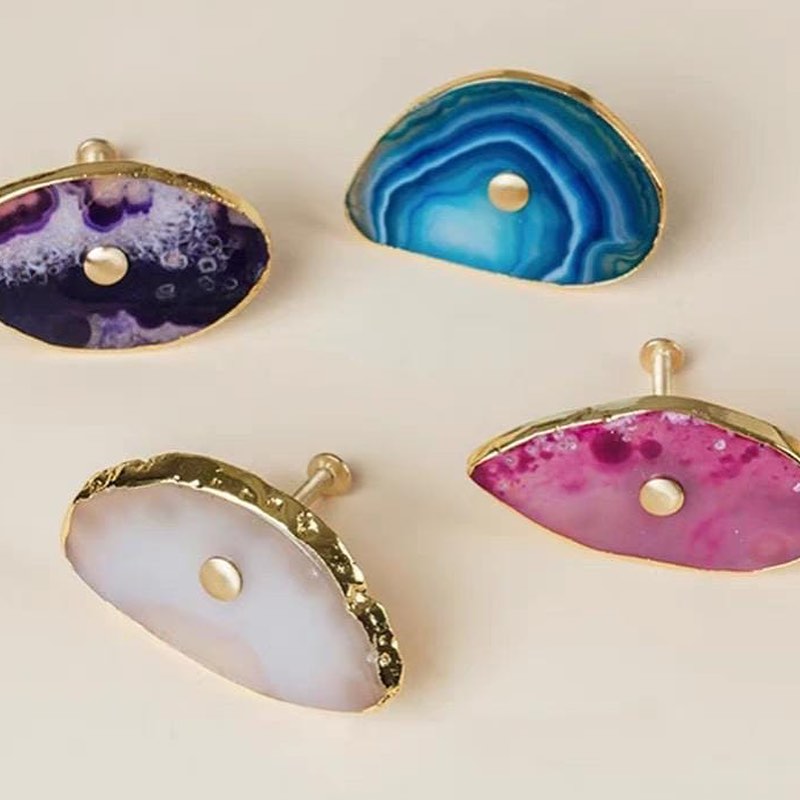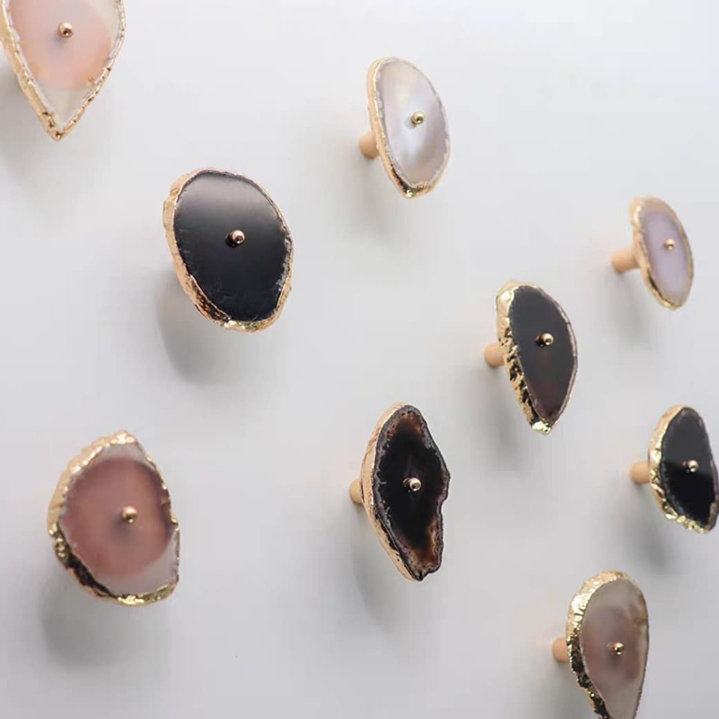 Посмотрите новым взглядом на ваши шкафы, тумбочки и т.д. Представьте, что вместо привычных ручек – ручки-красотульки. Впечатляет? Неповторимые мебельные ручки и одновременно крючки/держатели . Срезы настоящих полудрагоценных камней, с их уникальной фактурой, дополненные сусальным золотом, отлично украсят ваш интерьер. Идеальная полировка подарит регулярный нежно-тактильный контакт с самоцветами.