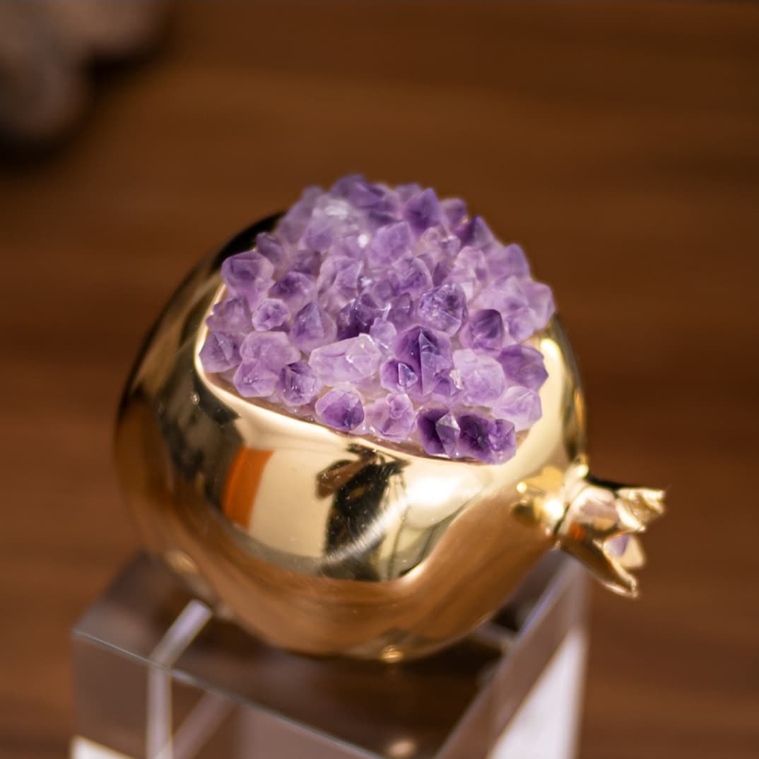 Очаровательные гранаты из благородной латуни с «зернами» из натуральных кристаллов аметиста. Яркий и позитивный символ жизни для многих народов. Шикарный декор для украшения личного пространства – домашнего и (или) рабочего.