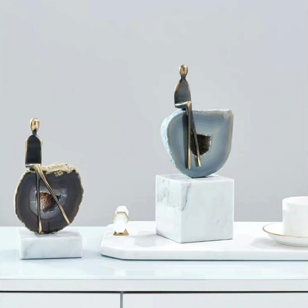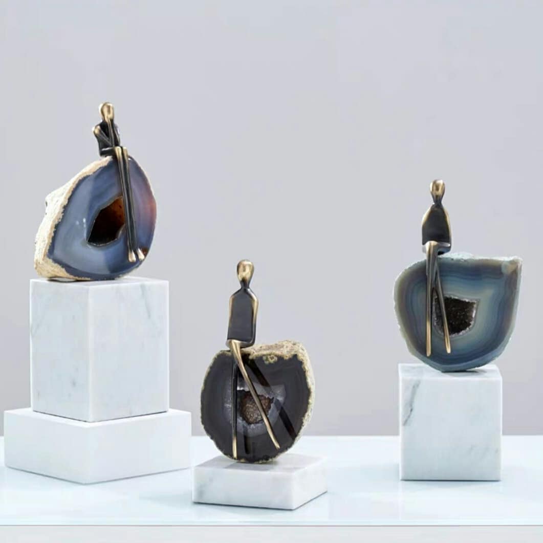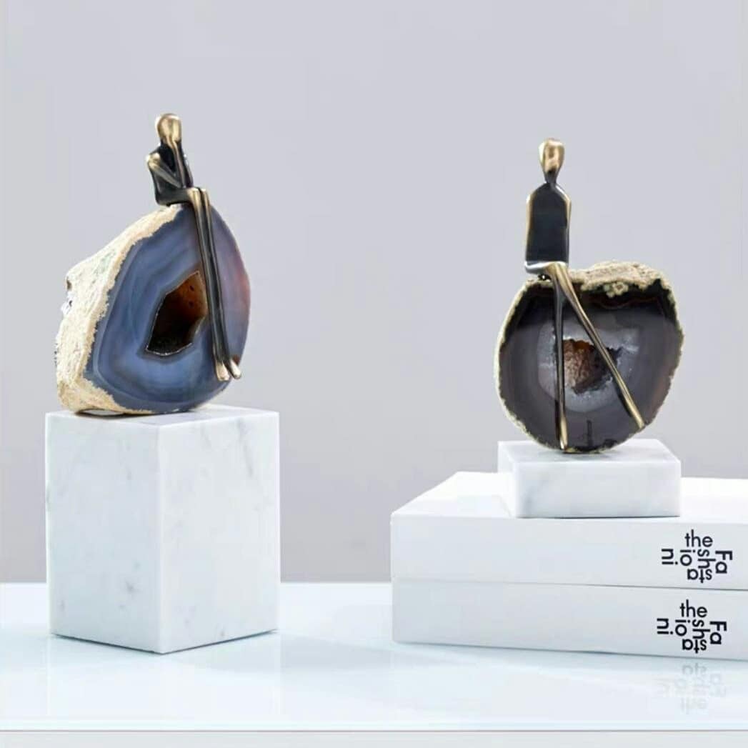 Задумчивые человеческие фигурки из бронзы, восседающие на друзах превосходного агата.