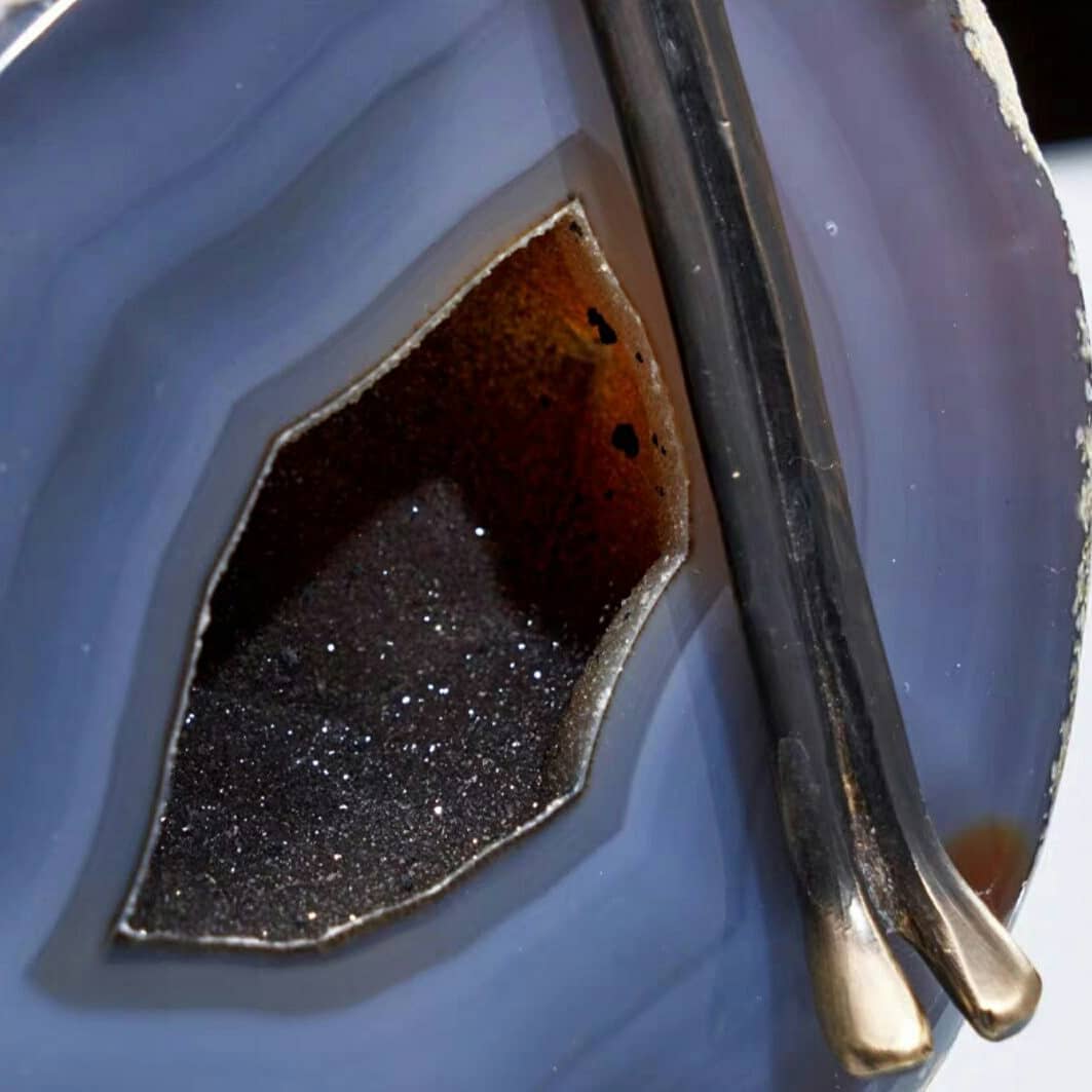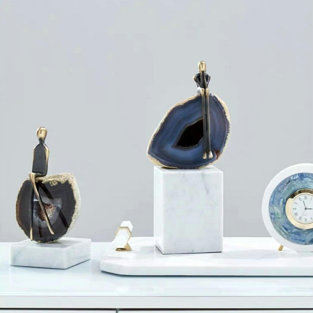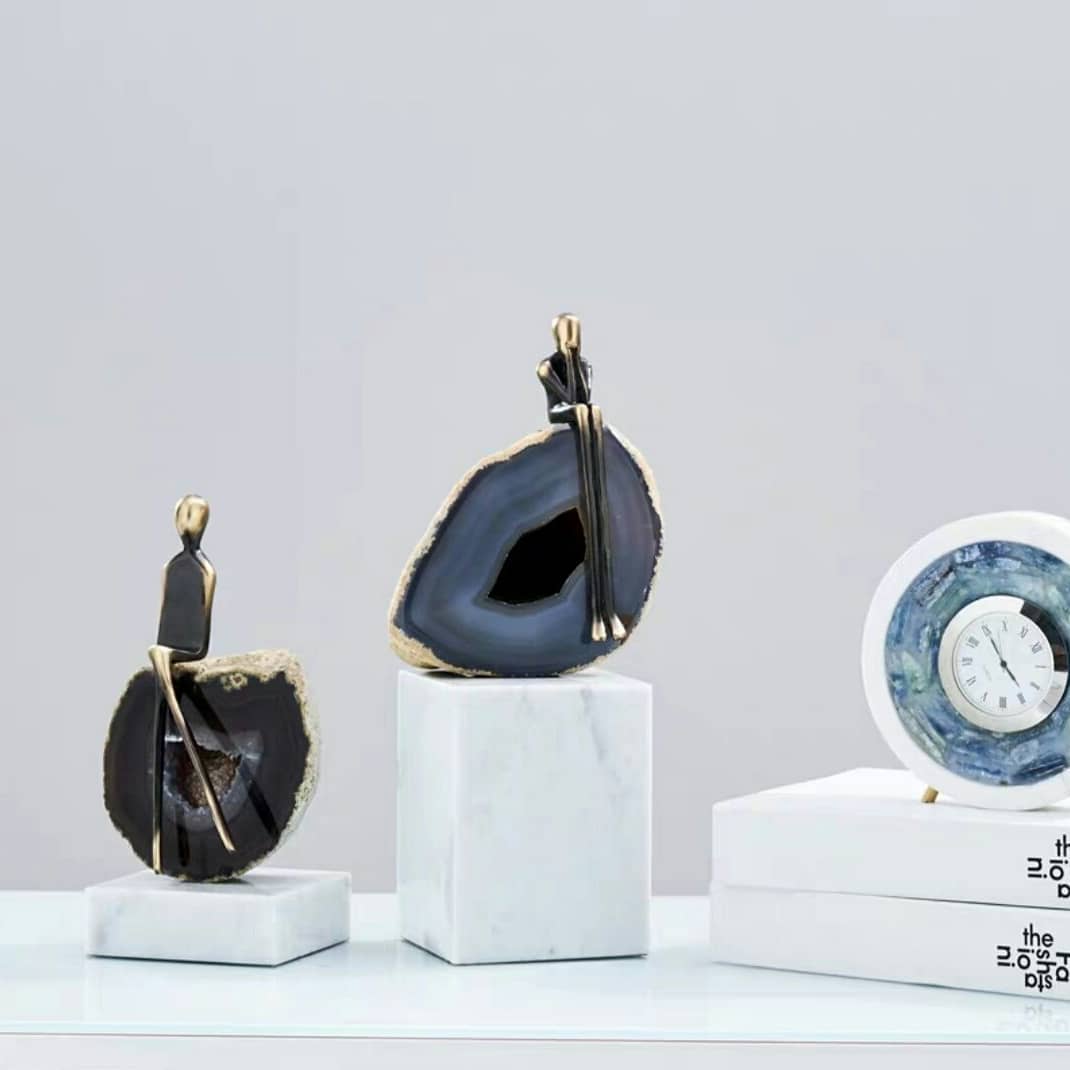 Задумчивые человеческие фигурки из бронзы, восседающие на друзах превосходного агата.