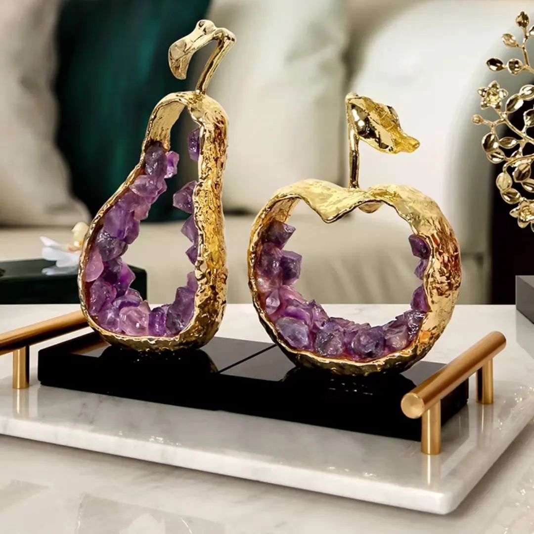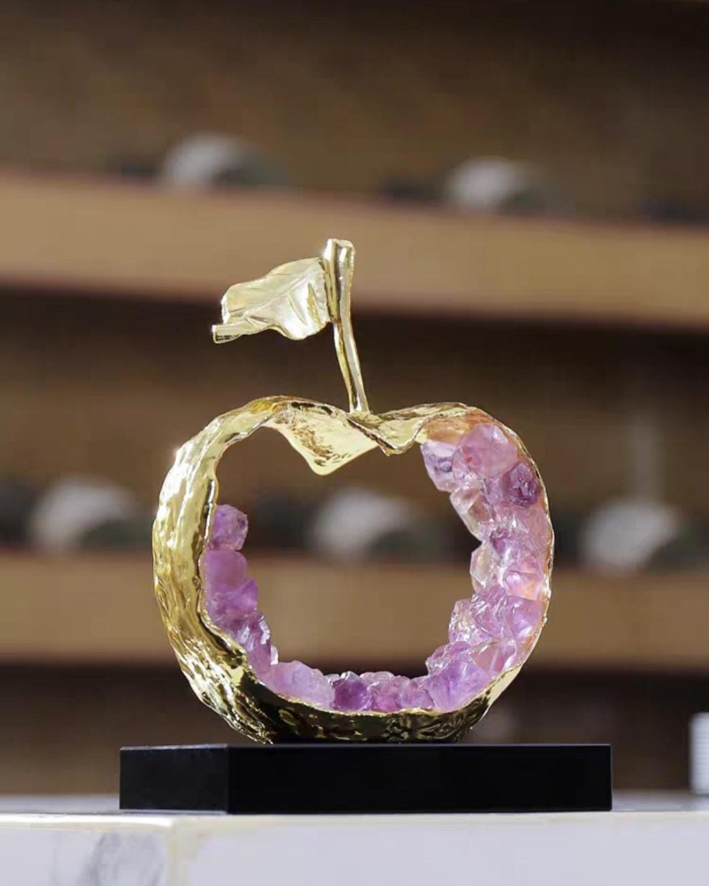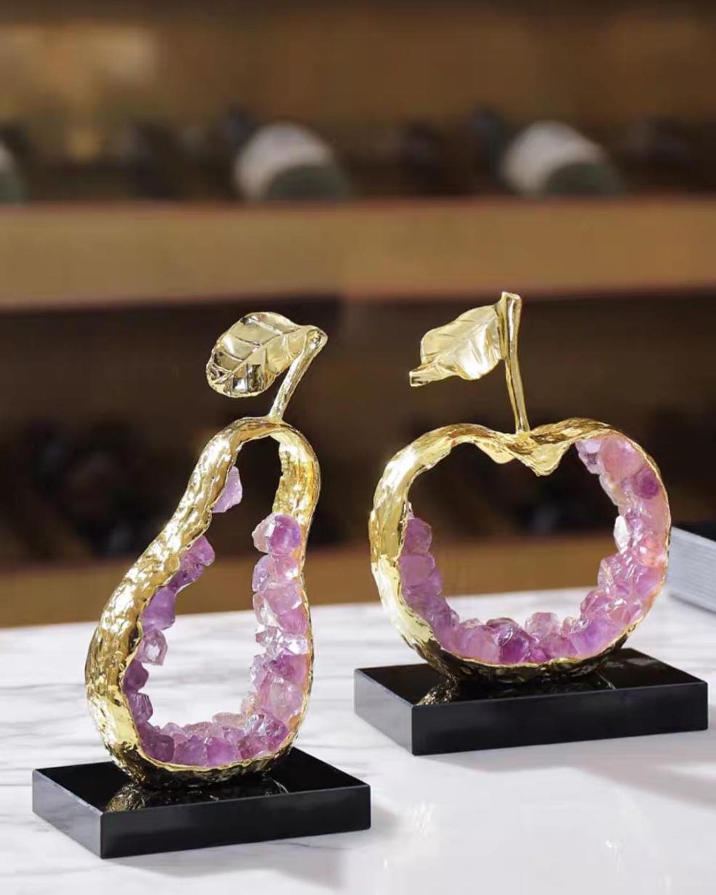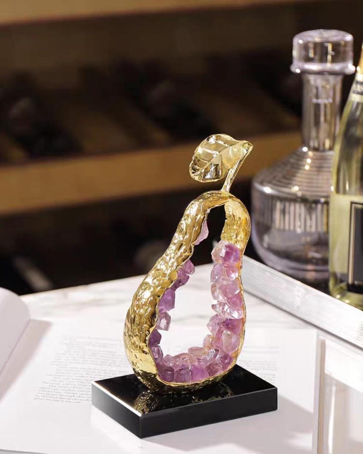 Очаровательный «фруктовый» декор Monsterior Gems! Изящное решение для стильного украшения современного, яркого интерьера – домашнего и (или) делового, коммерческого. Специально обработанная руда, отборные кристаллы аметиста, подставка – натуральный мрамор.