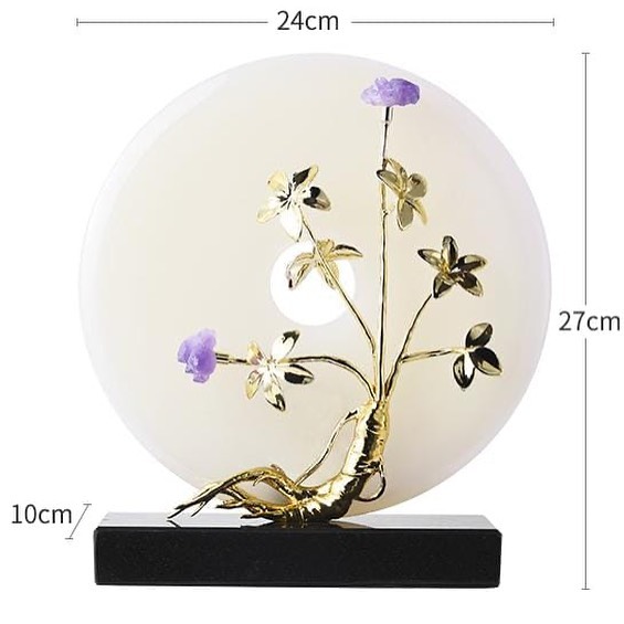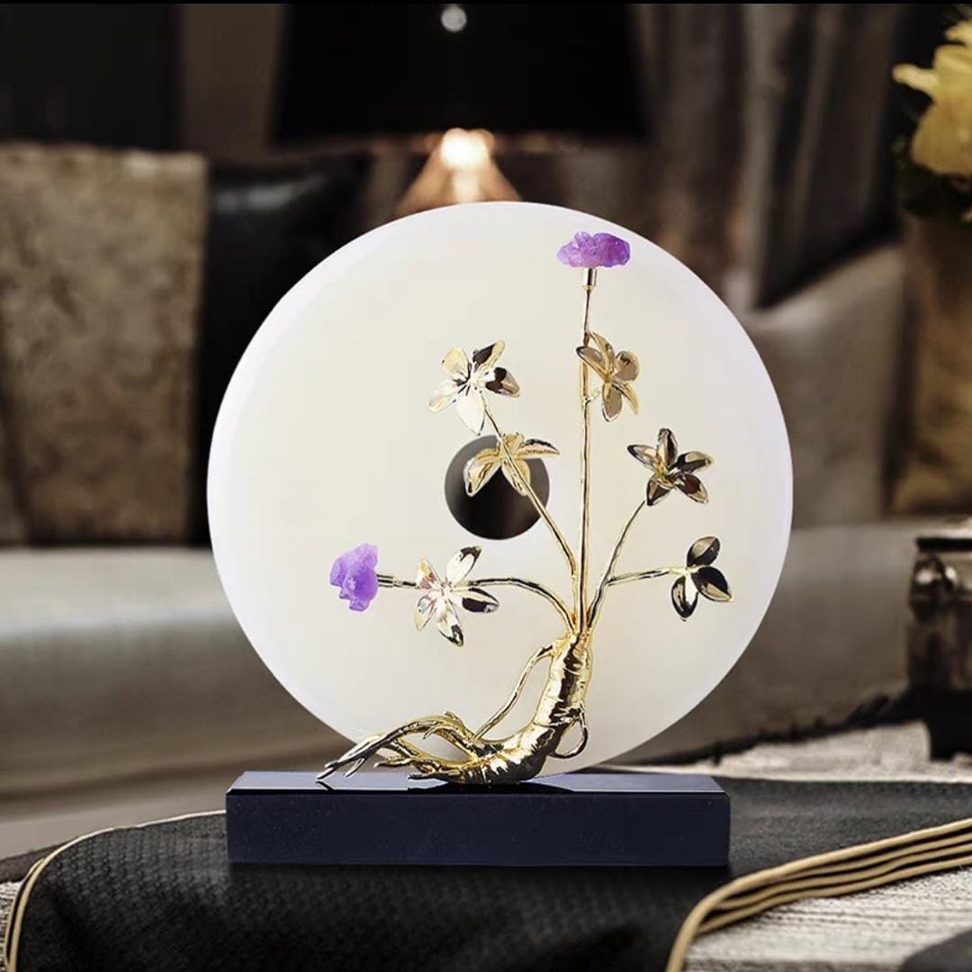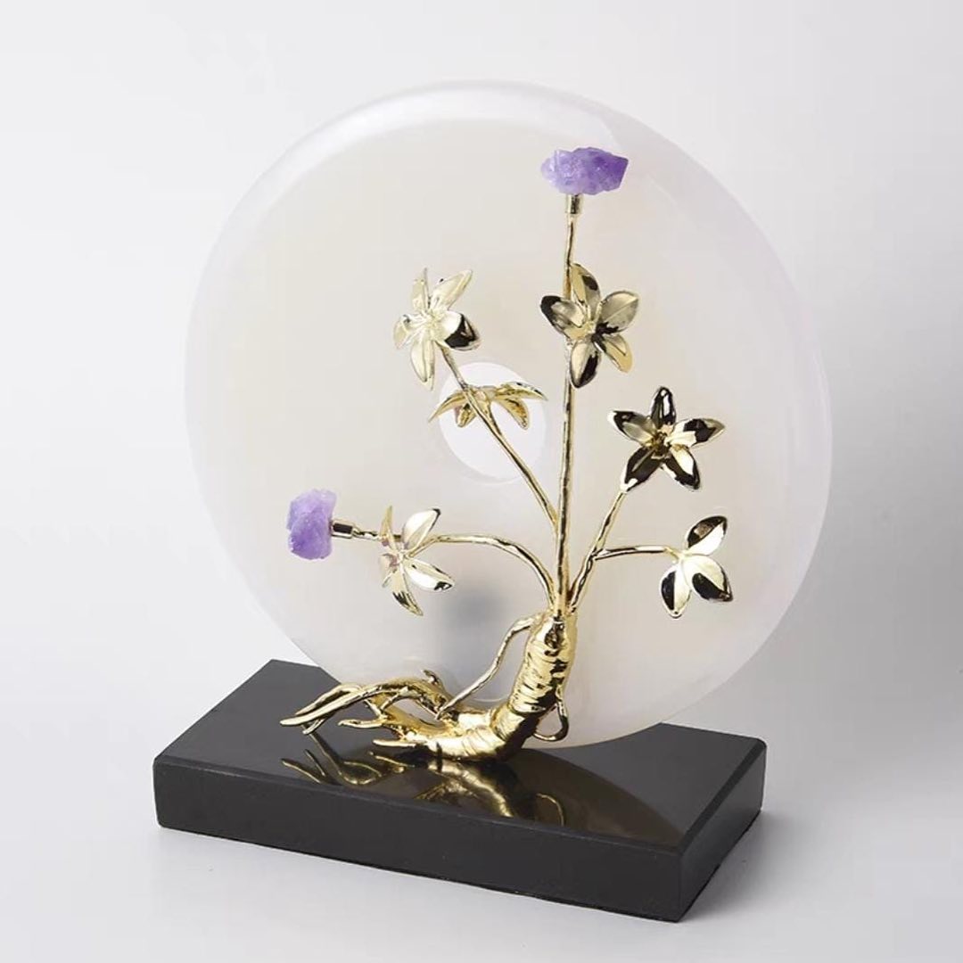 Легендарный предмет силы и одновременно – роскошный декор для украшения вашей гостиной, спальни или кабинета. Диск/кольцо суйсеки из натурального нефрита, благородной латуни и аметиста. Очаровательная вариация с изящным «женьшенем». Считается, что суйсеки обладает мощными и позитивными сакральными, защитными и медитационными функциями.