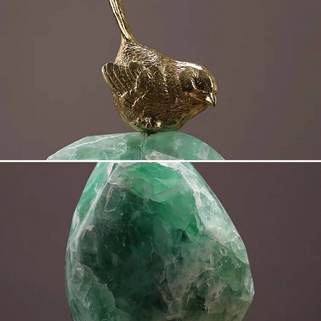 Очаровательные птички из благородной латуни, на отборном флюорите. Шикарный и полезный декор для вашего интерьера – домашнего и (или) делового. Считается, что фигурки птичек способствуют оперативному появлению добрых и долгожданных весточек, а флюорит обладает отменными защитными свойствами. Красота, к которой рекомендуется при необходимости обращаться, с вопросами вроде: «Где письмо, птичка? Где сообщение, а?».