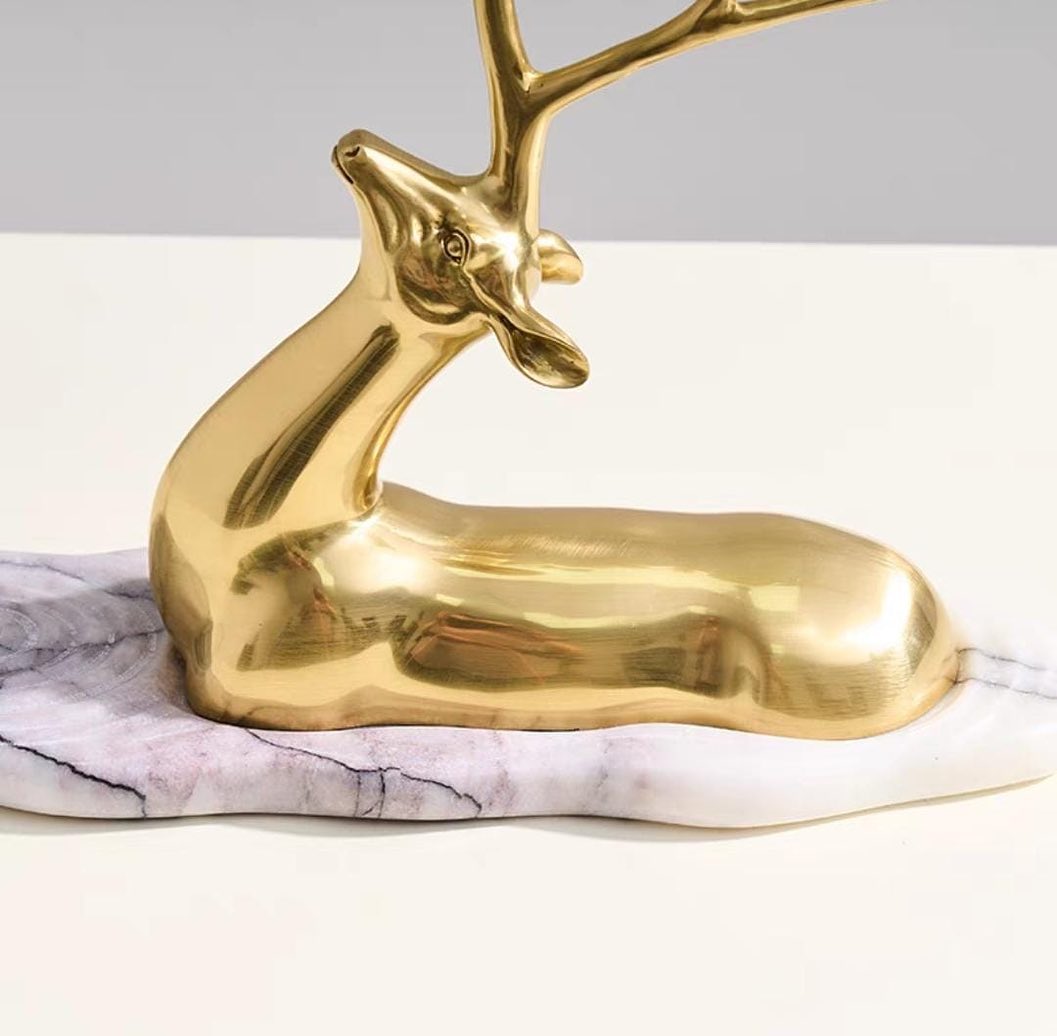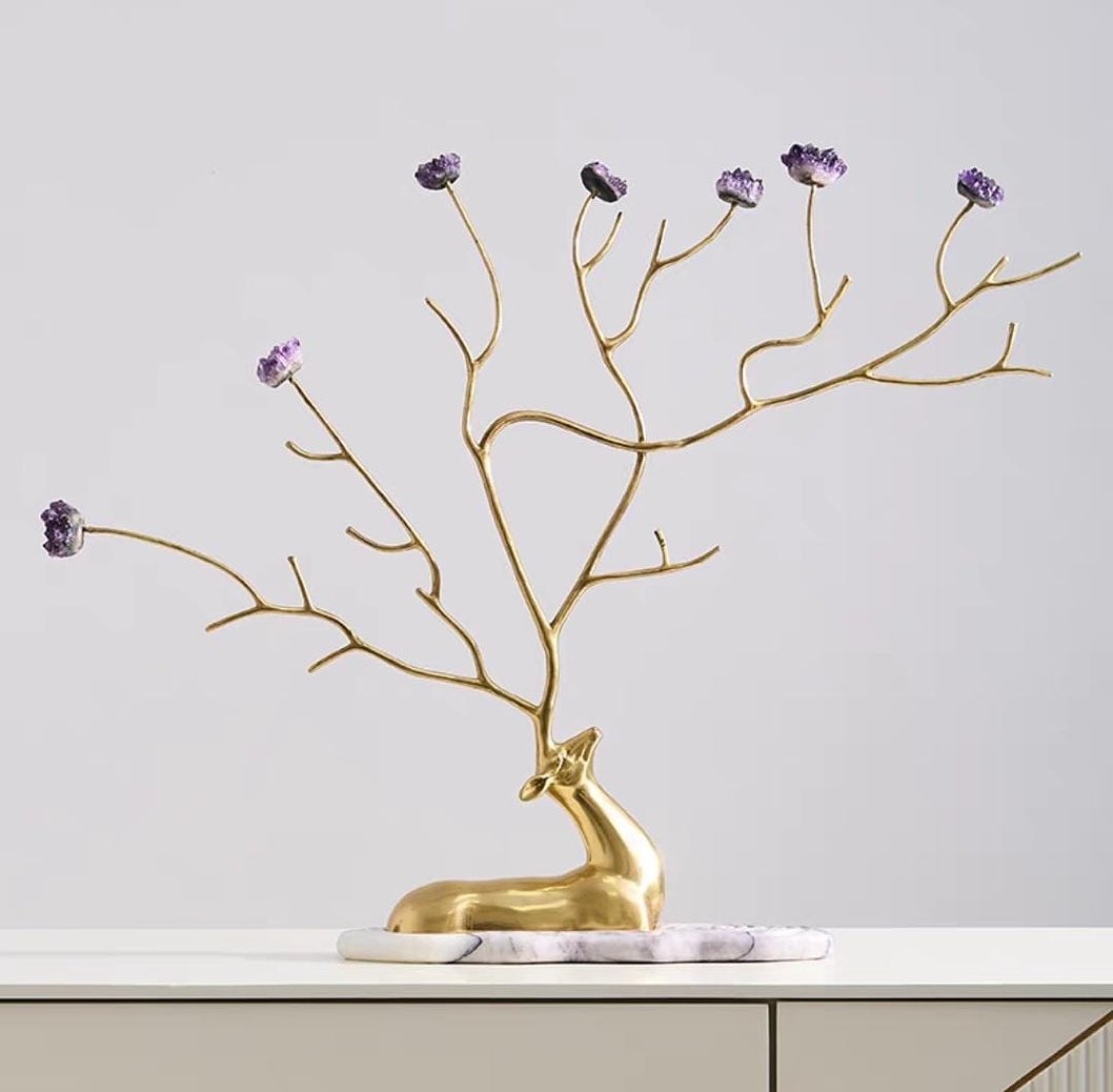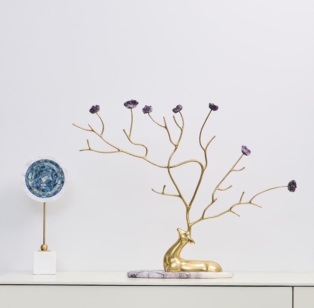Красивое решение от Monsterior Gems для вашего интерьера. Очаровательный олень с роскошными рогами, которые больше похожи на мировое древо. Позитивный символизм и классное сочетание блестящей благородной латуни, натурального мрамора и кристаллов отборного аметиста. Отлично подходит для хранения любимых, часто используемых украшений – они сделают этот декор ещё прекраснее!