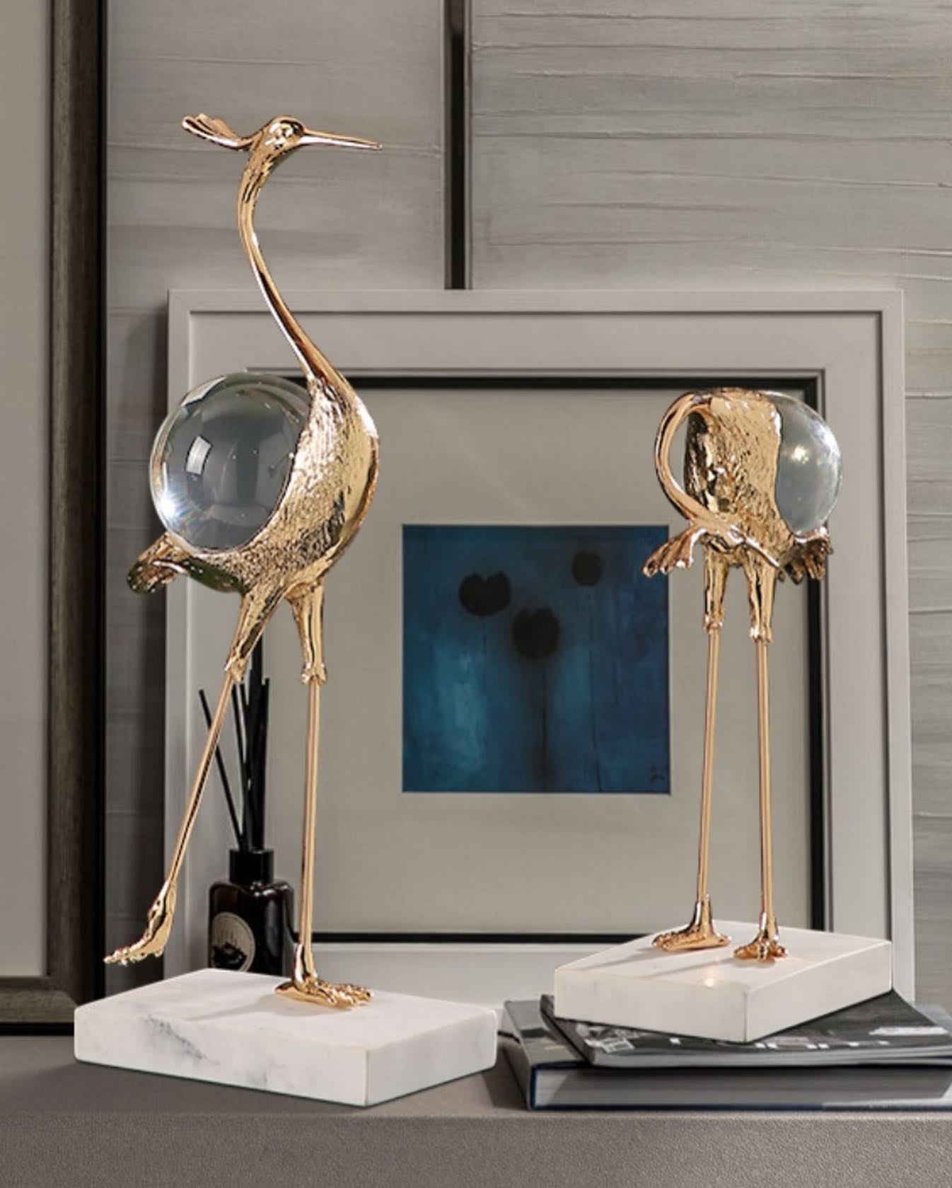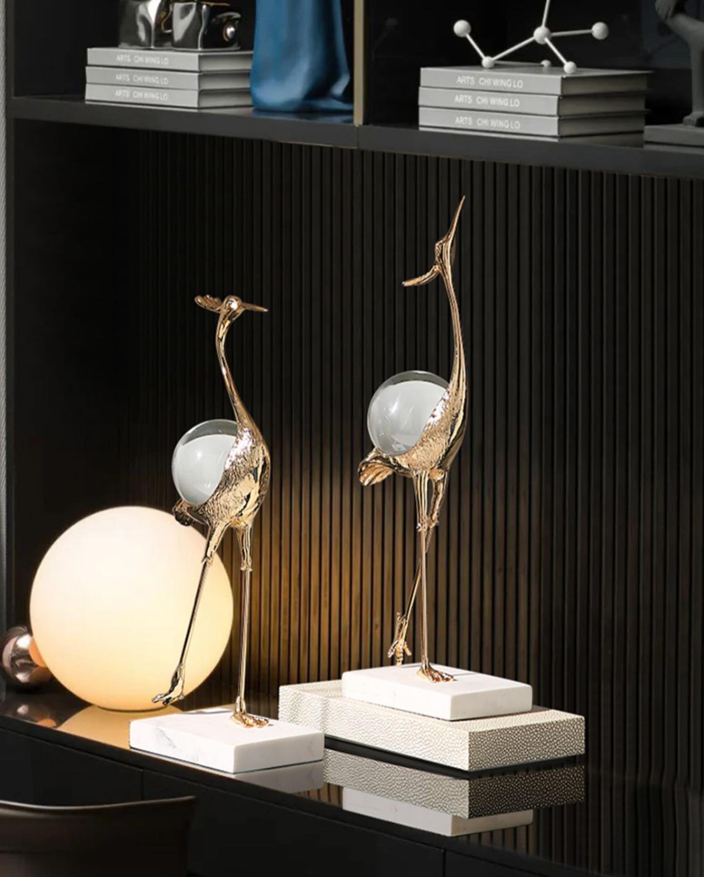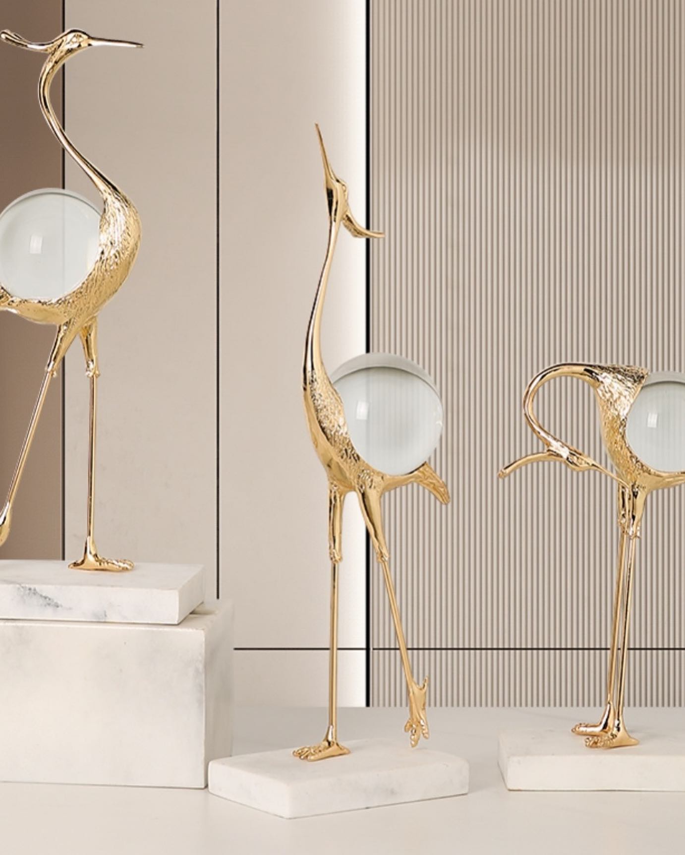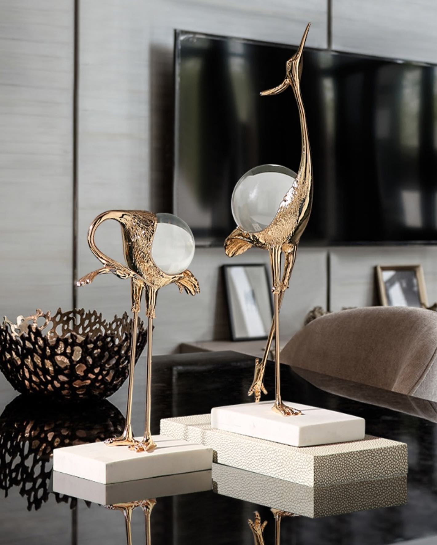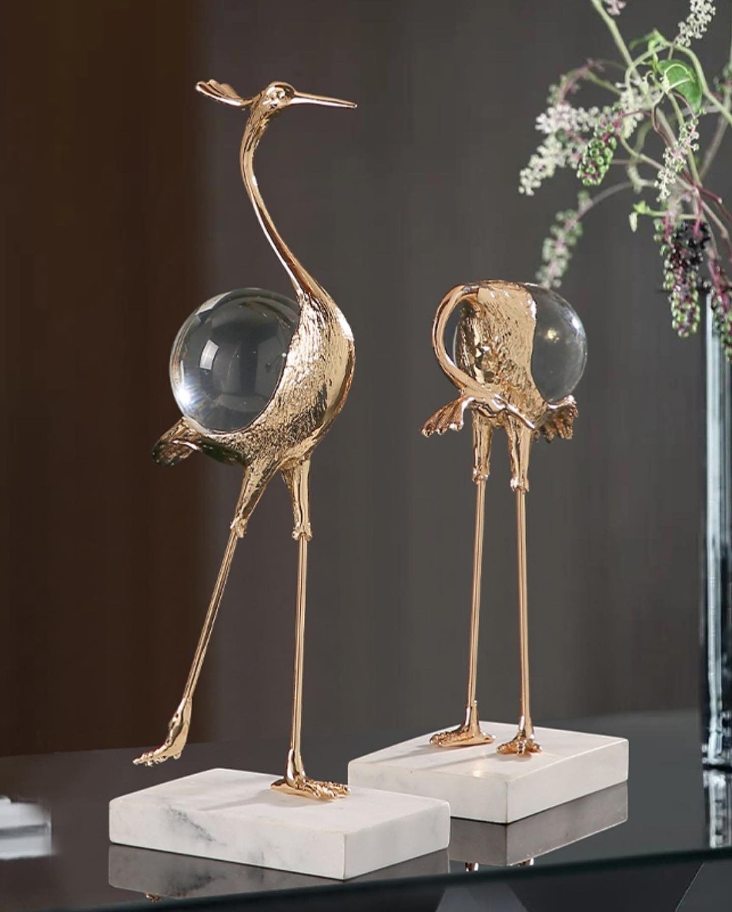 Изящные цапли Monsterior Gems из благородной латуни, с шаром из чистейшего хрусталя. Роскошное и оригинальное украшение для современного, статусного интерьера – домашнего и (или) делового.