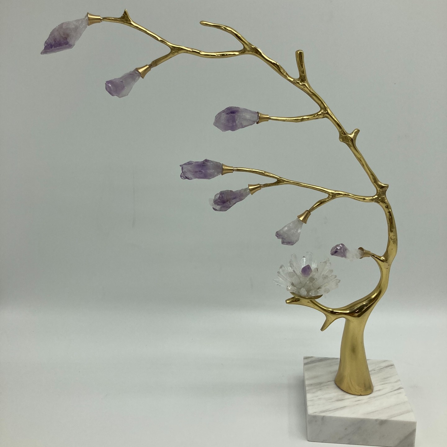 Статуэтка Ветка из латуни с аметистами и горным хрусталем на подставке