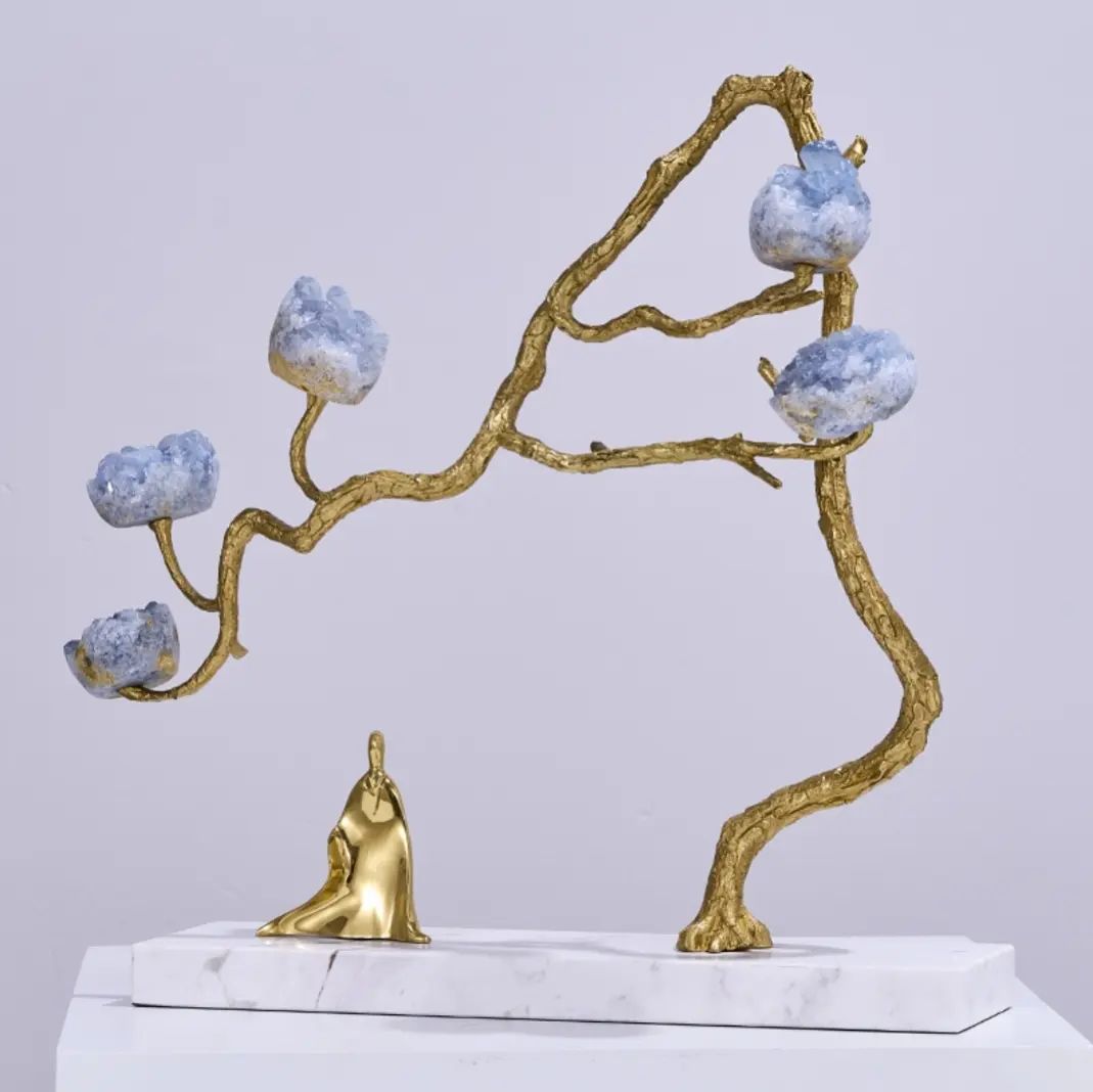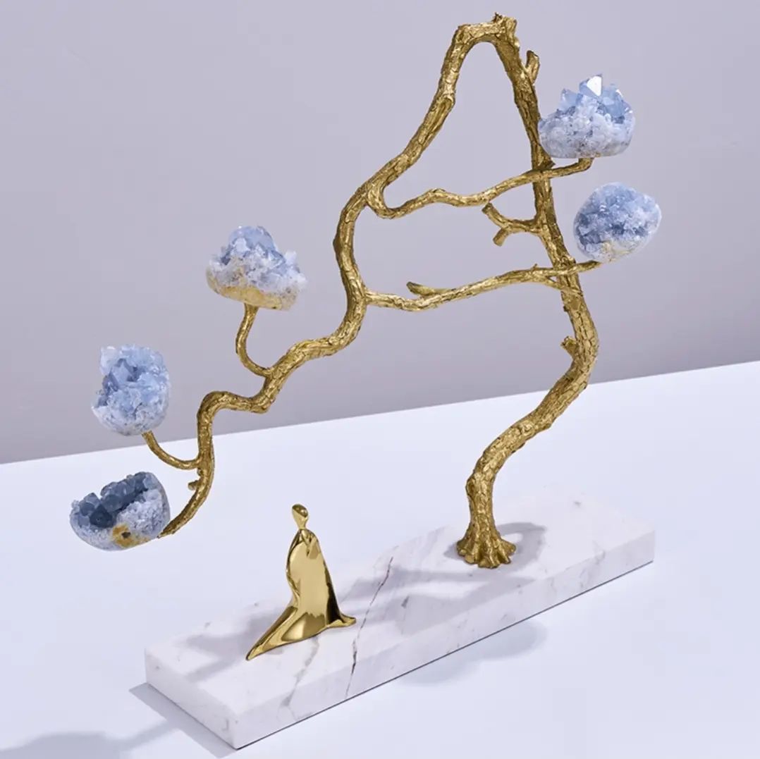 Статуэтка Дерево из латуни с самоцветами, человек на подставке из мрамора