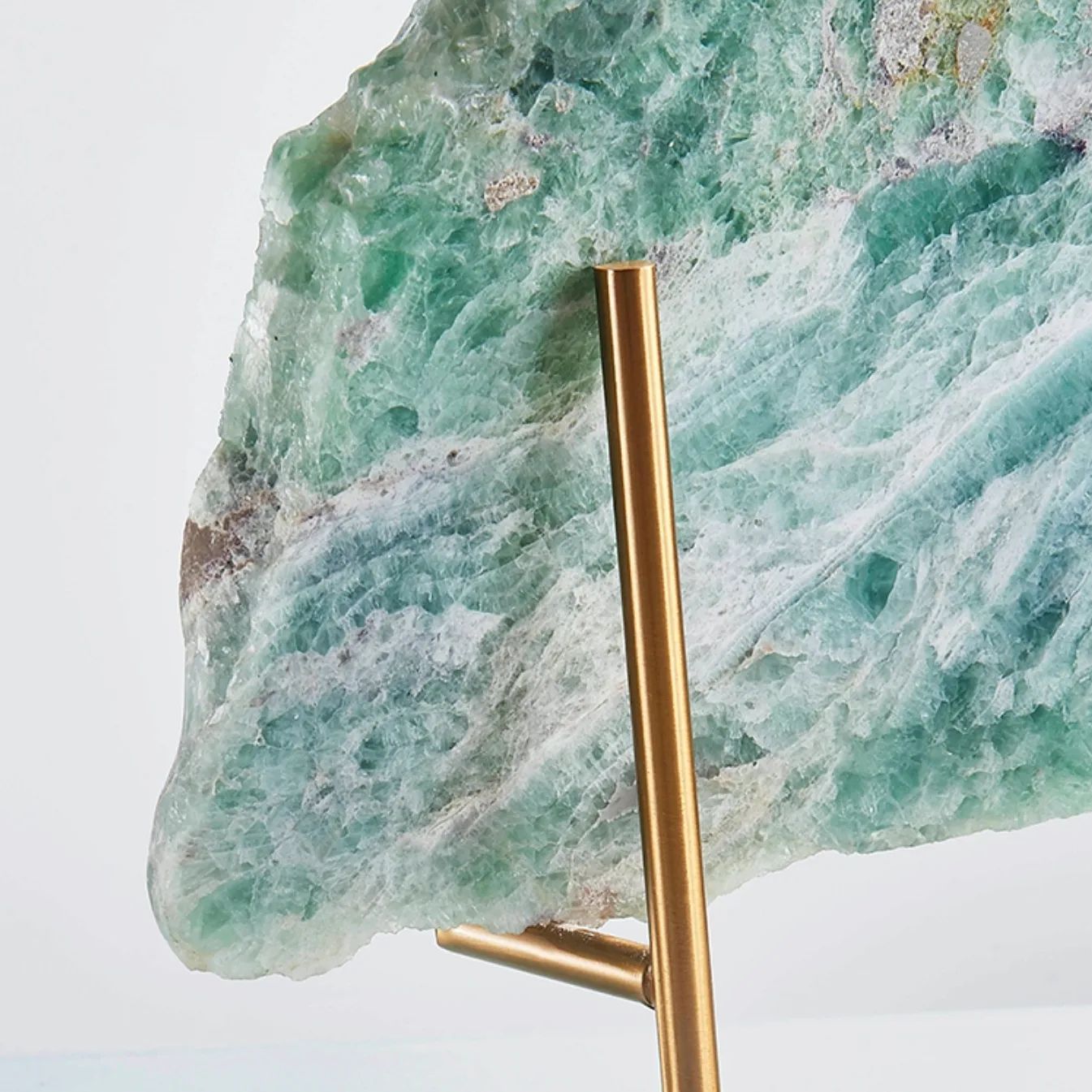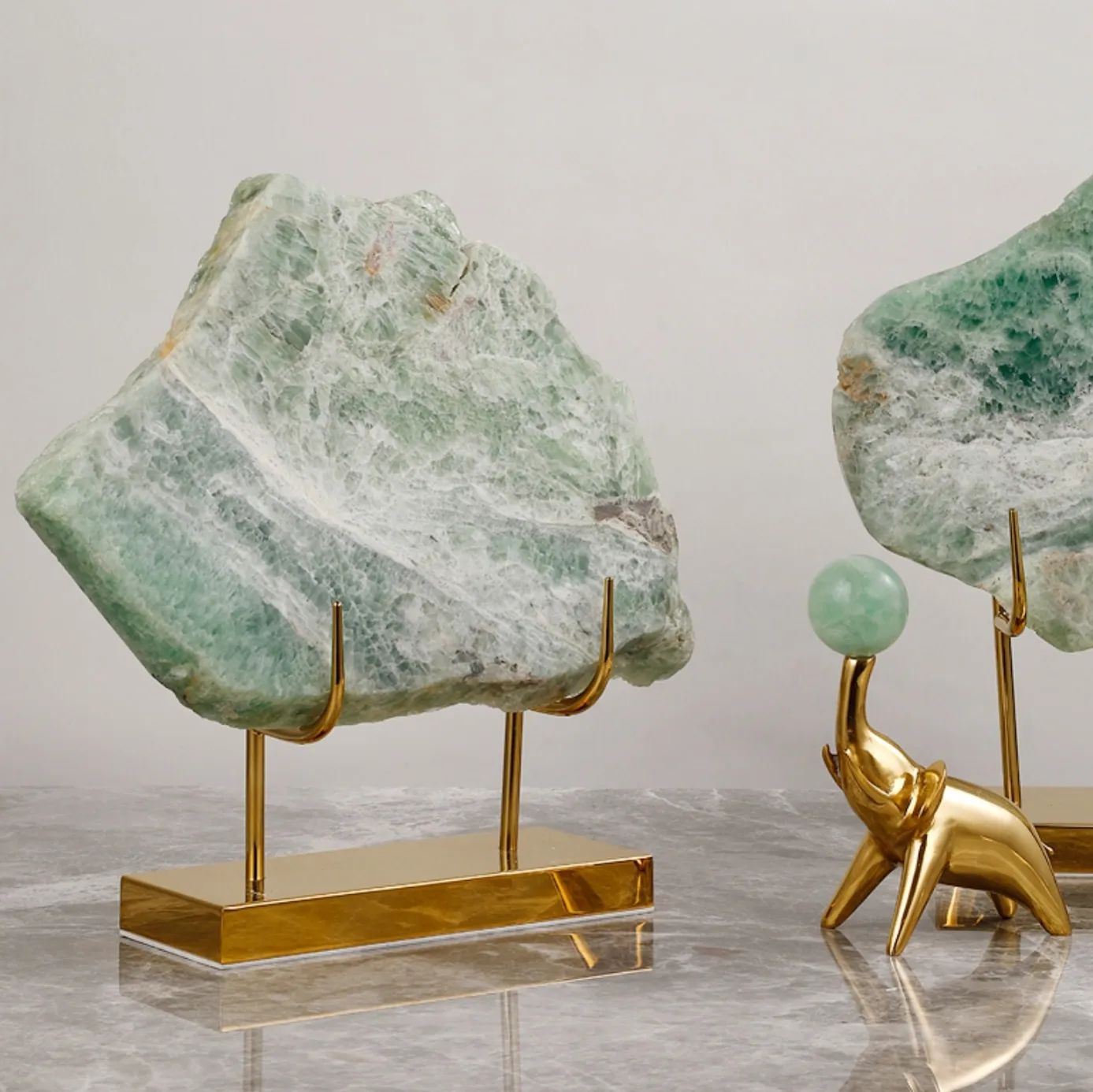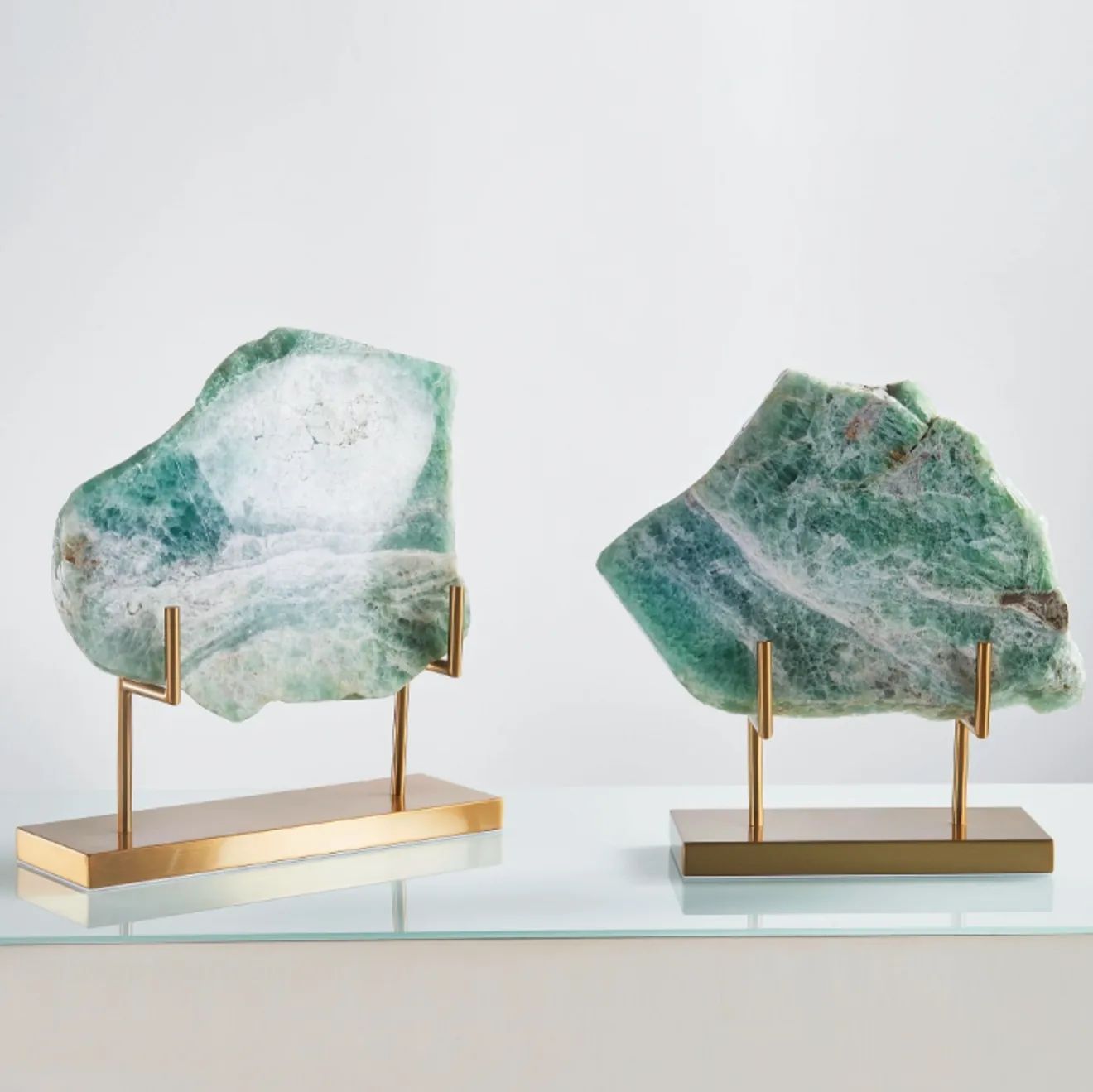 Очаровательные кристаллы флюорита на изящных латунных подставках. Стильный декор Monsterior Gems, который качественно украсит современный интерьер – домашний и (или) деловой. Добавьте позитивной магии камня в ваше личное пространство.