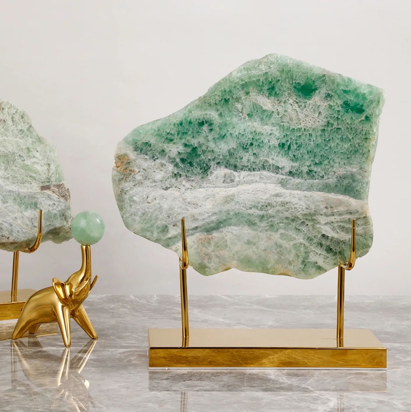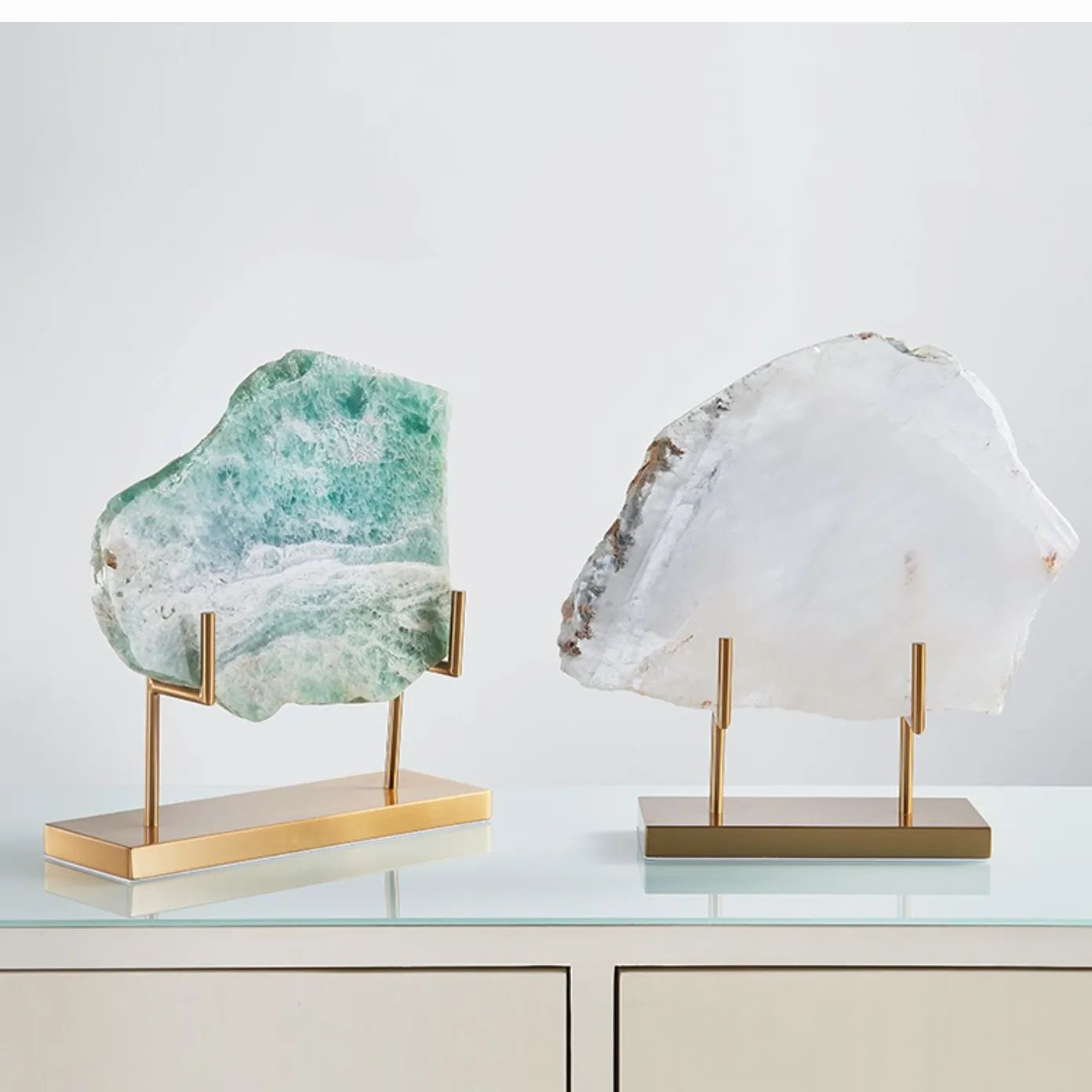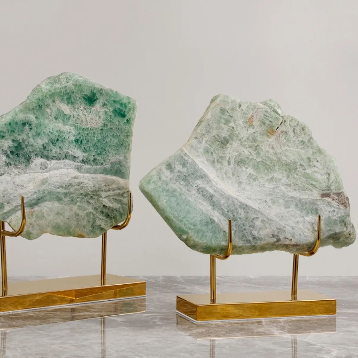 Очаровательные кристаллы флюорита на изящных латунных подставках. Стильный декор Monsterior Gems, который качественно украсит современный интерьер – домашний и (или) деловой. Добавьте позитивной магии камня в ваше личное пространство.