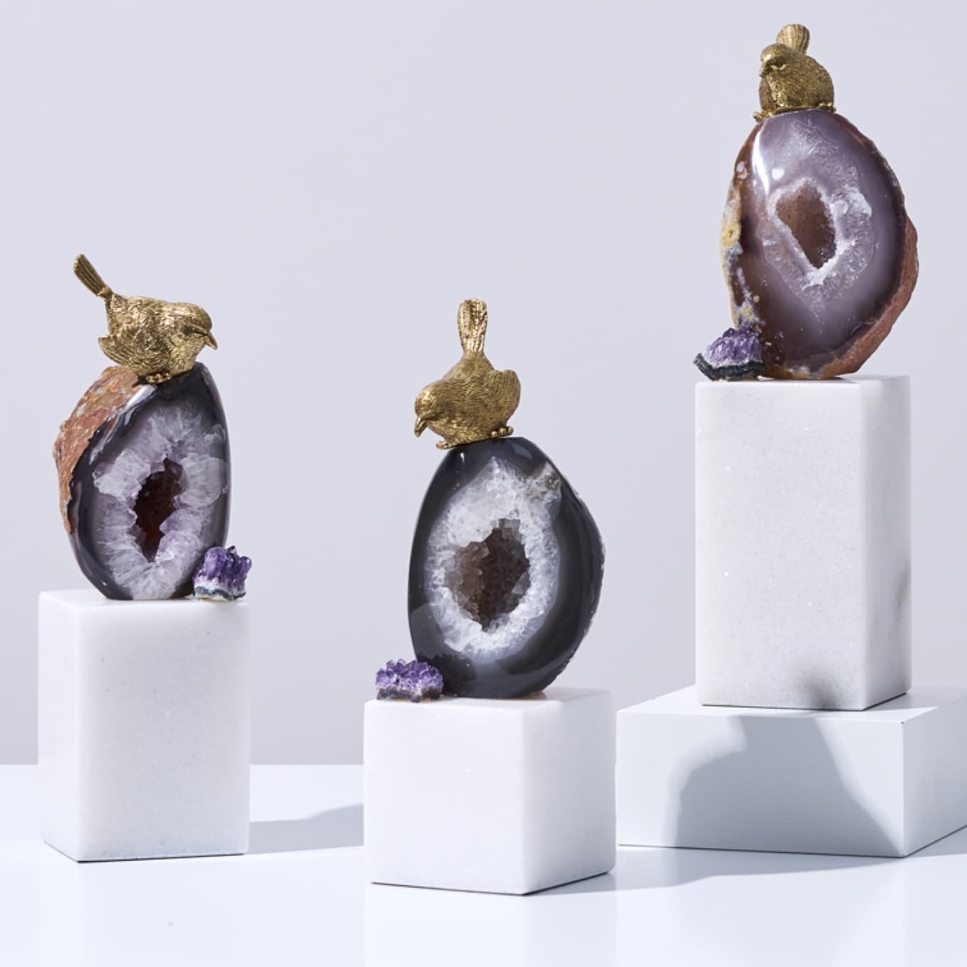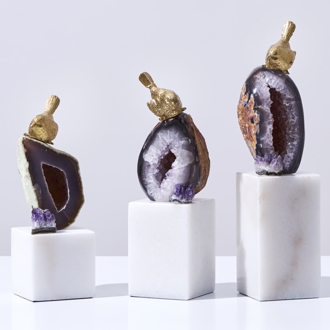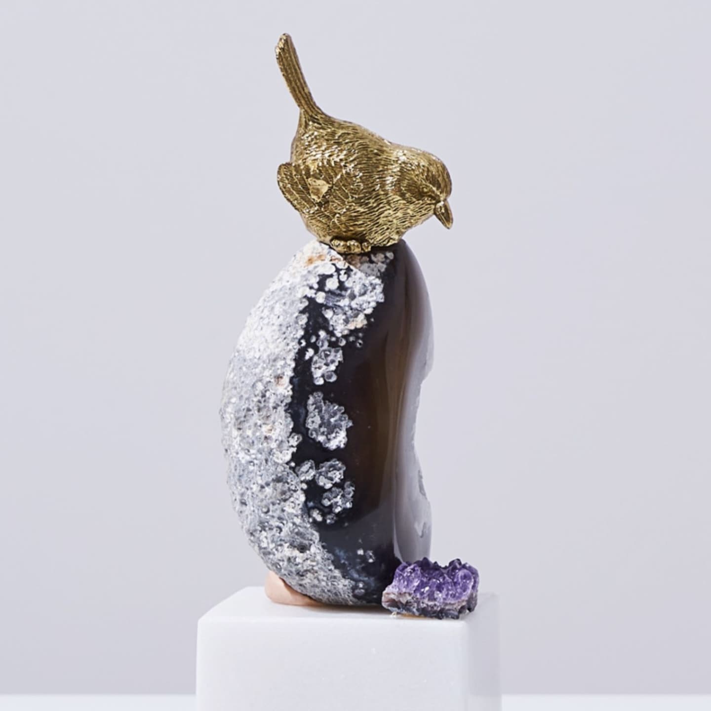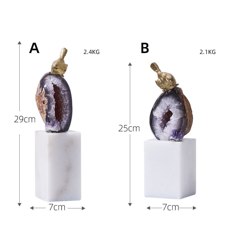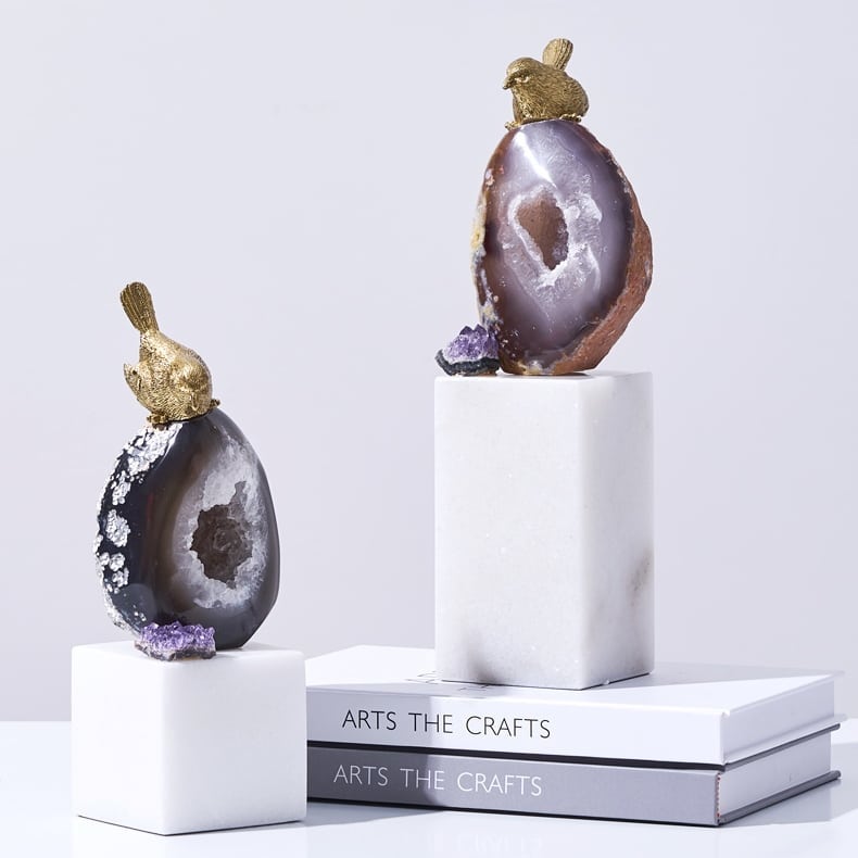 Классные латунные птички, очаровательные жеоды фиолетового агата и подставка из натурального мрамора. И всё это – роскошный декор Monsterior Gems! Отличное украшение для вашего личного пространства и шикарный подарок любимым и близким людям. К жеодам, к слову, у людей издревле было особое отношение – считалось, что они обладают мощными позитивными свойствами. А птички всегда считались «почтальонами», которые приносят весточки.