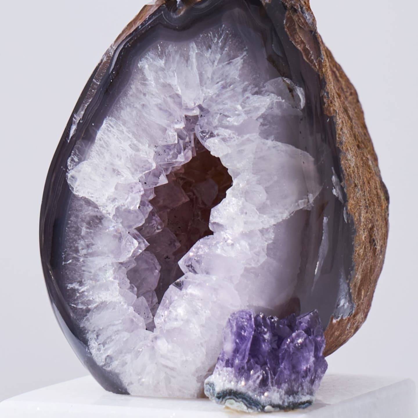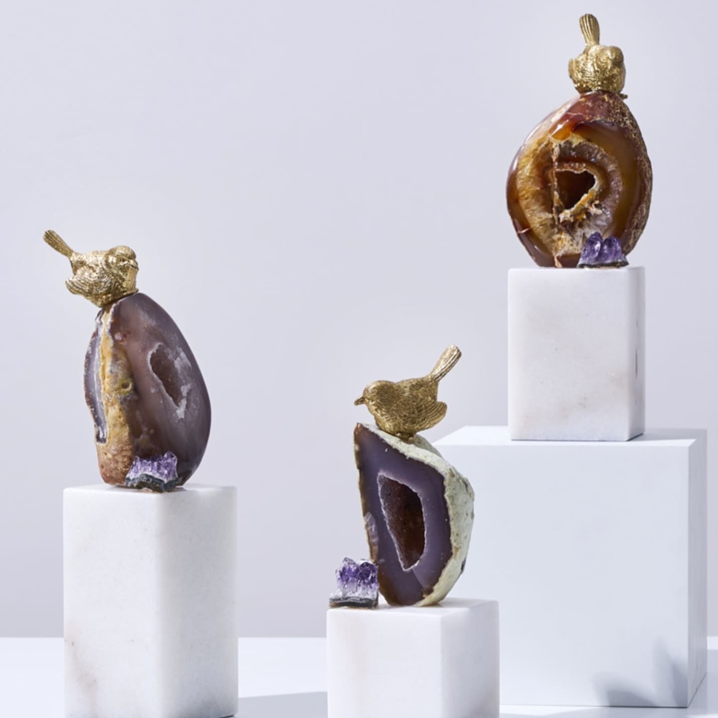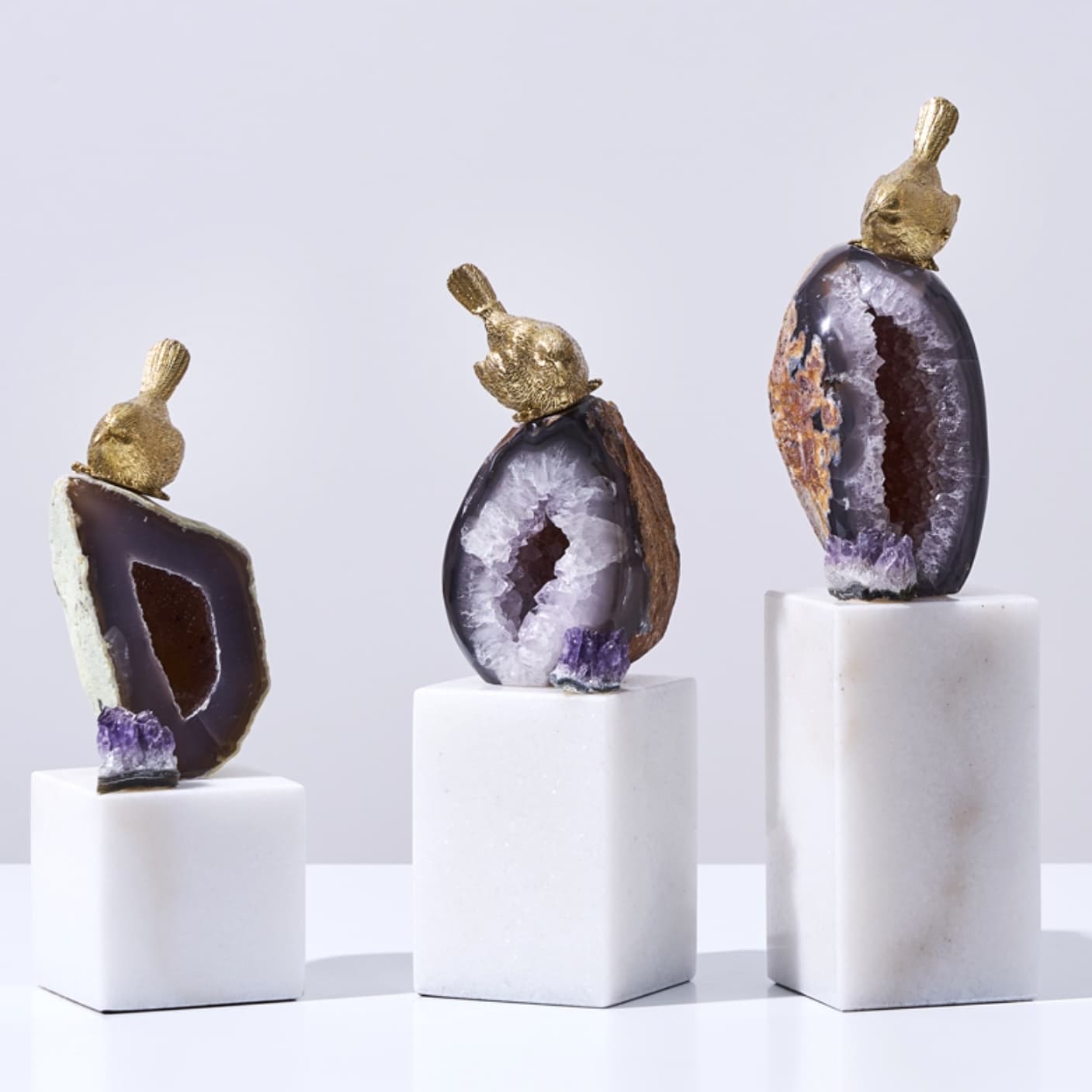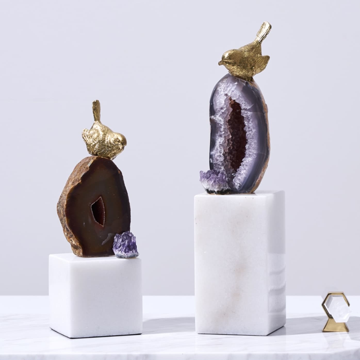 Классные латунные птички, очаровательные жеоды фиолетового агата и подставка из натурального мрамора. И всё это – роскошный декор Monsterior Gems! Отличное украшение для вашего личного пространства и шикарный подарок любимым и близким людям. К жеодам, к слову, у людей издревле было особое отношение – считалось, что они обладают мощными позитивными свойствами. А птички всегда считались «почтальонами», которые приносят весточки.