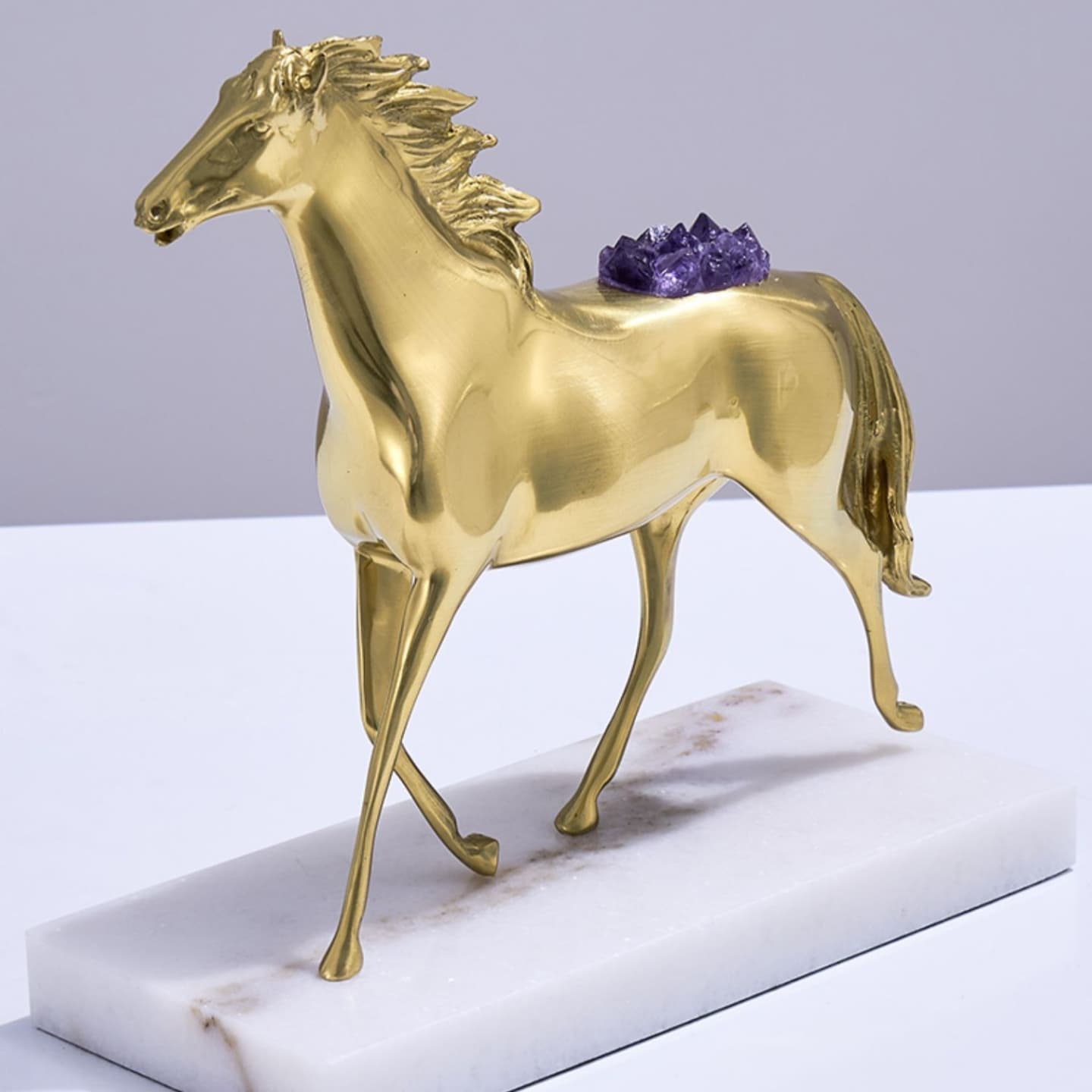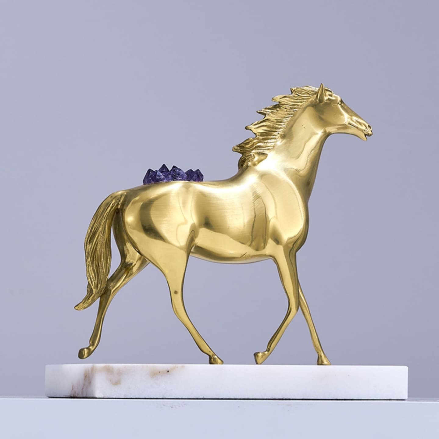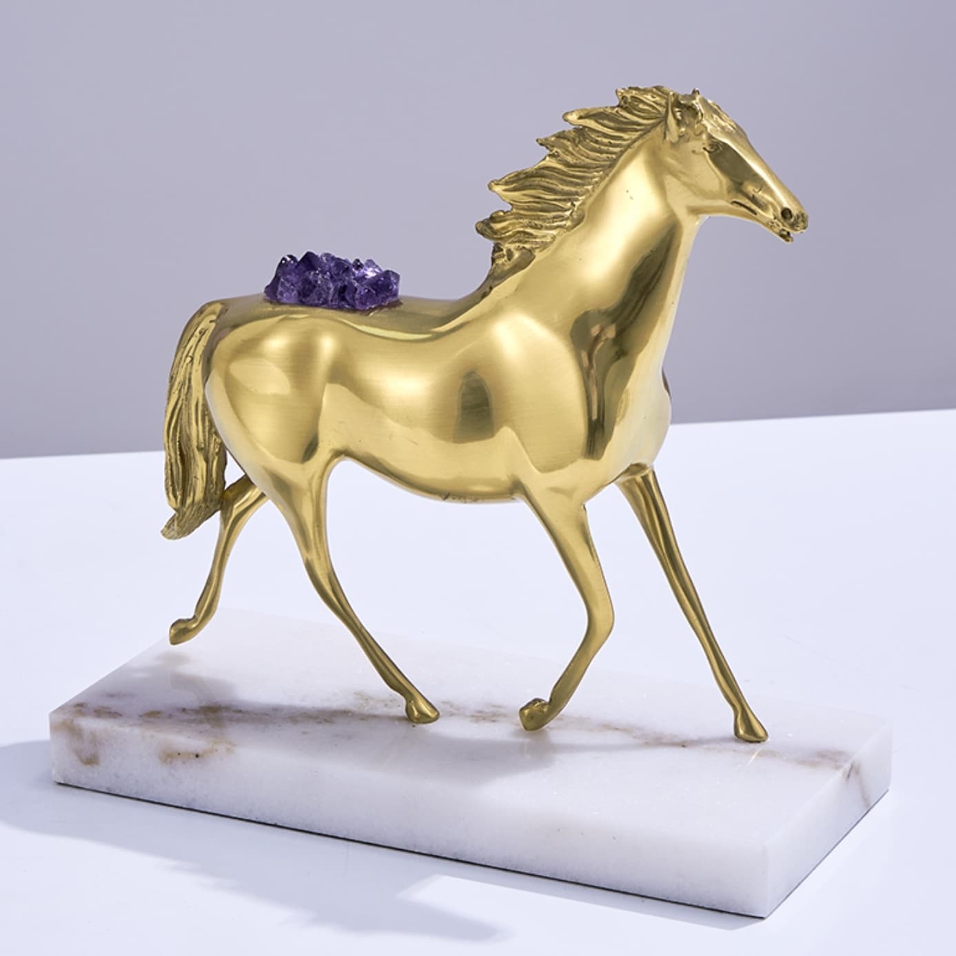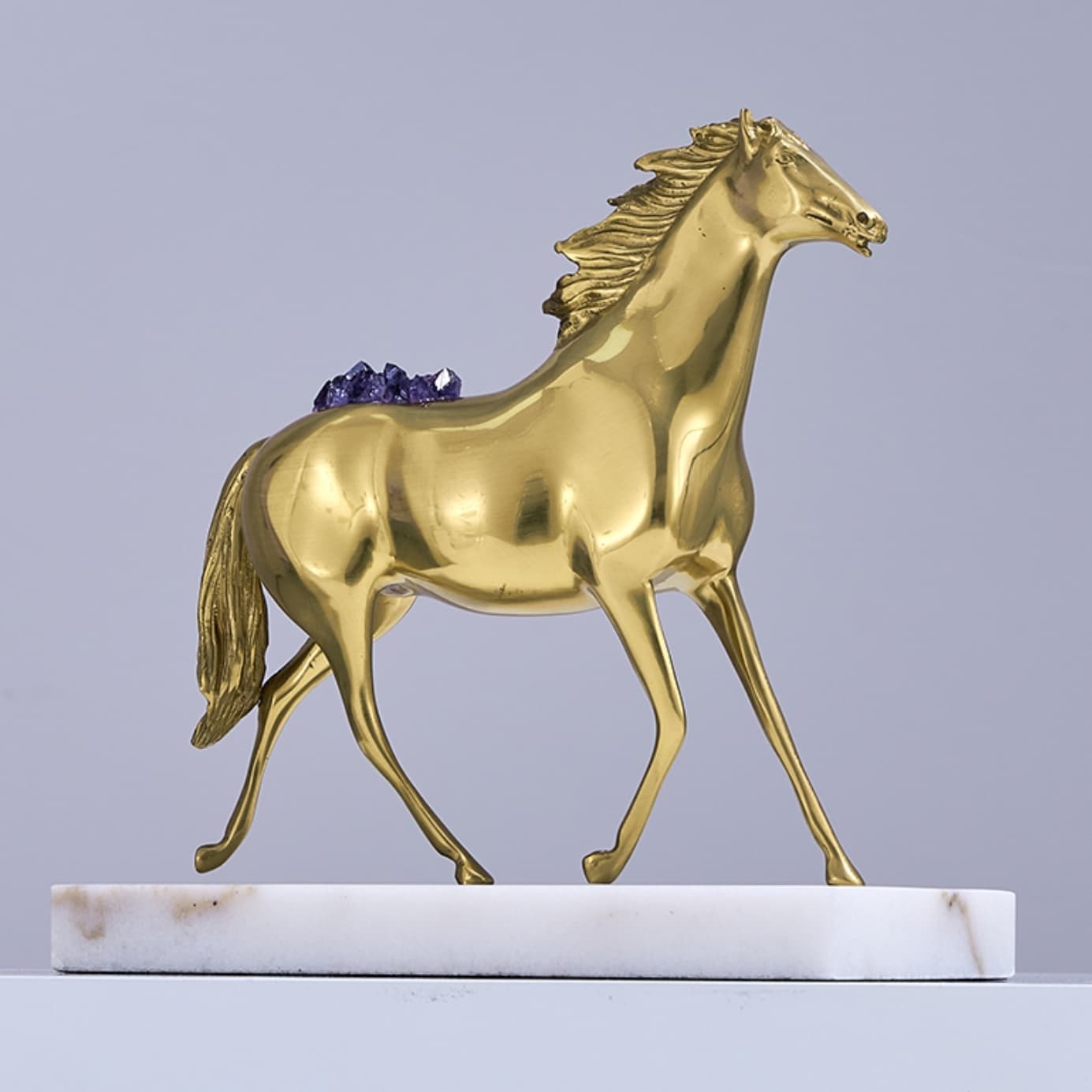 Очаровательная лошадка – классный декор для стильного интерьера! Изящная, благородная красота из благородной латуни, отборных кристаллов аметиста, подставка из натурального мрамора. Отличное решение для вашего личного пространства – домашнего и (или) делового.