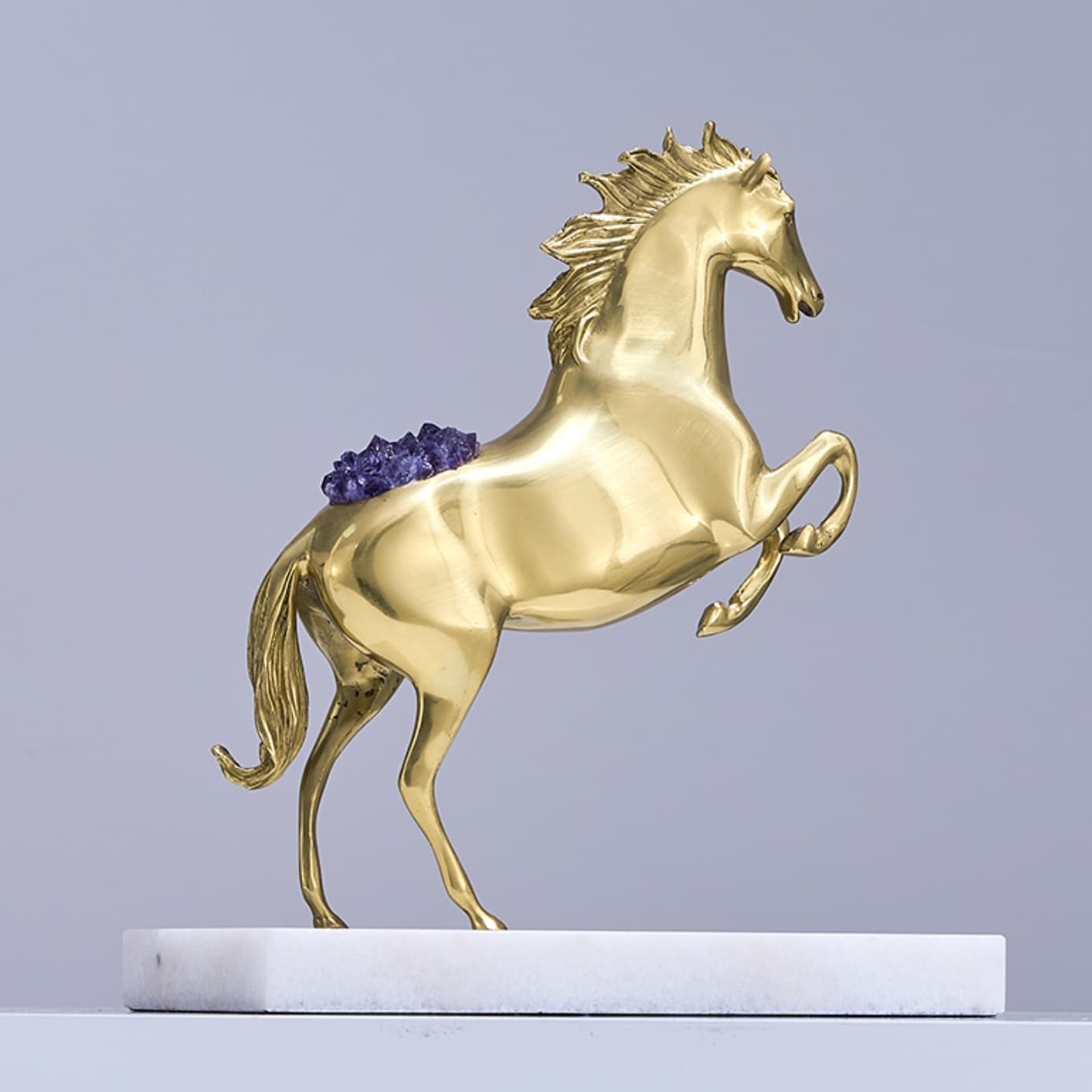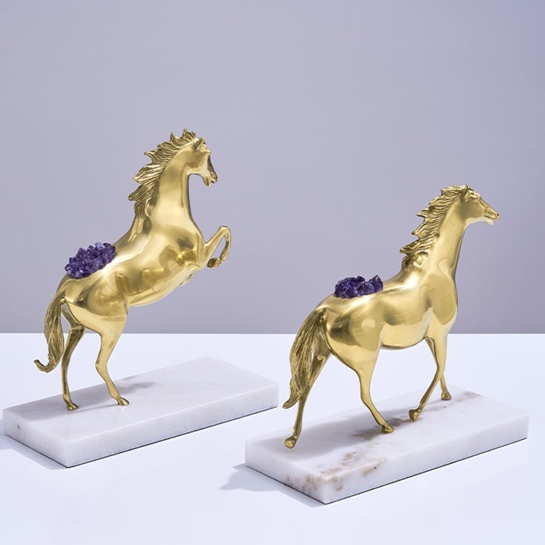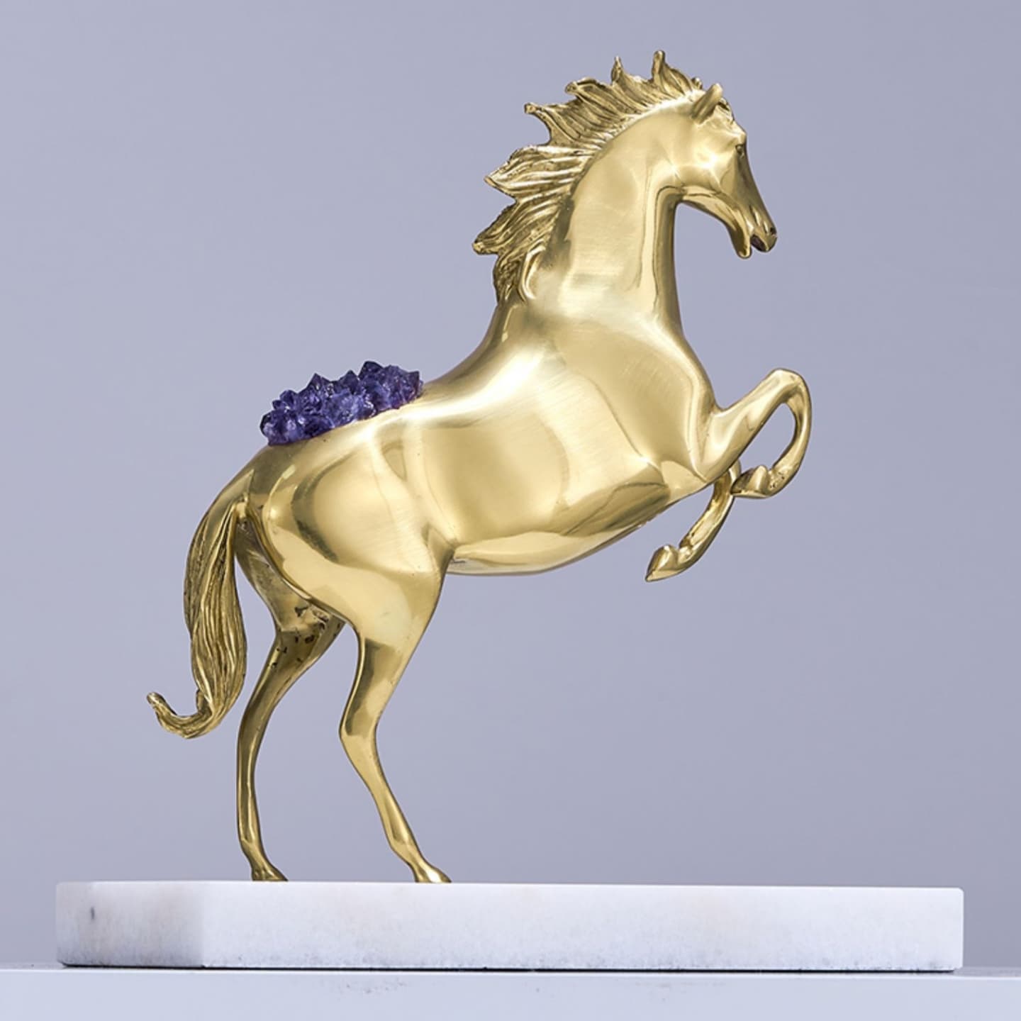 Очаровательная лошадка – классный декор для стильного интерьера! Изящная, благородная красота из благородной латуни, отборных кристаллов аметиста, подставка из натурального мрамора. Отличное решение для вашего личного пространства – домашнего и (или) делового.