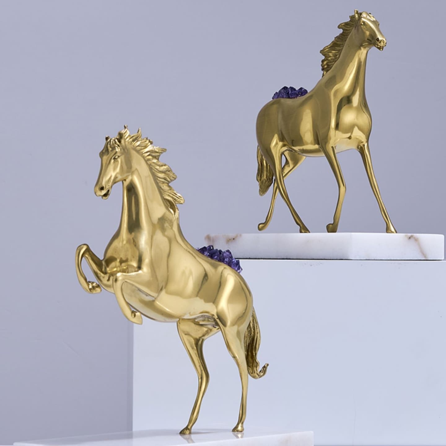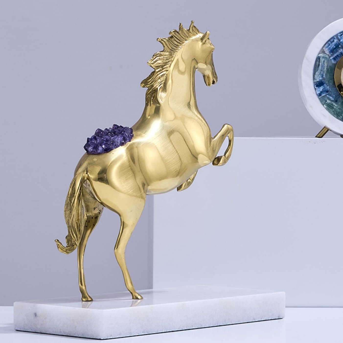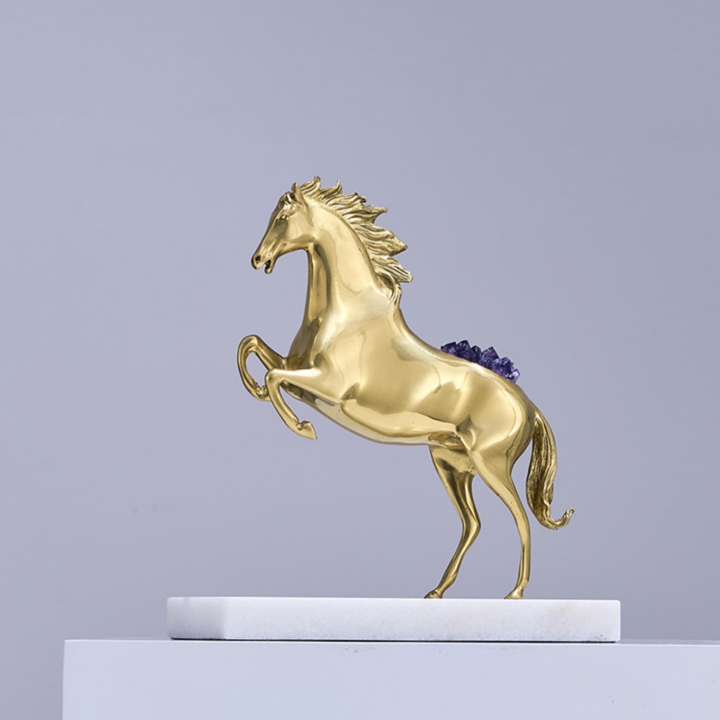 Очаровательная лошадка – классный декор для стильного интерьера! Изящная, благородная красота из благородной латуни, отборных кристаллов аметиста, подставка из натурального мрамора. Отличное решение для вашего личного пространства – домашнего и (или) делового.