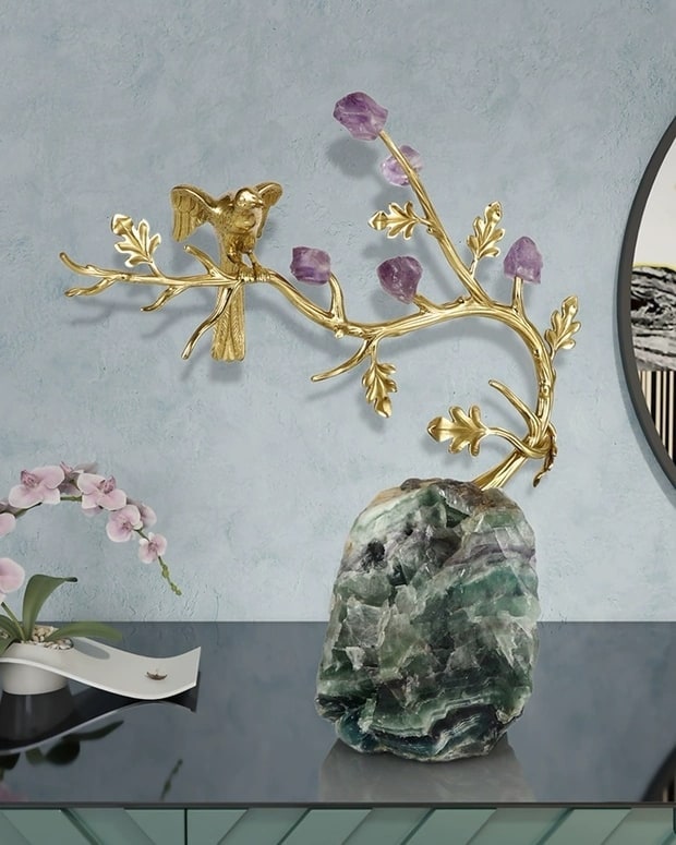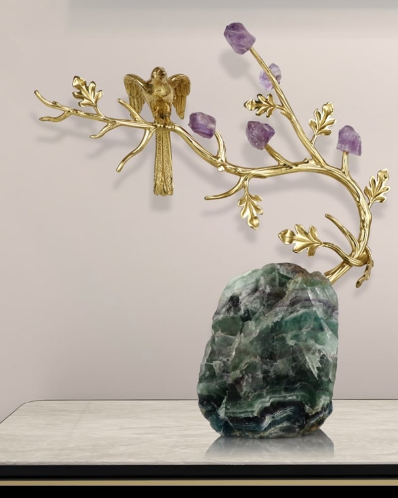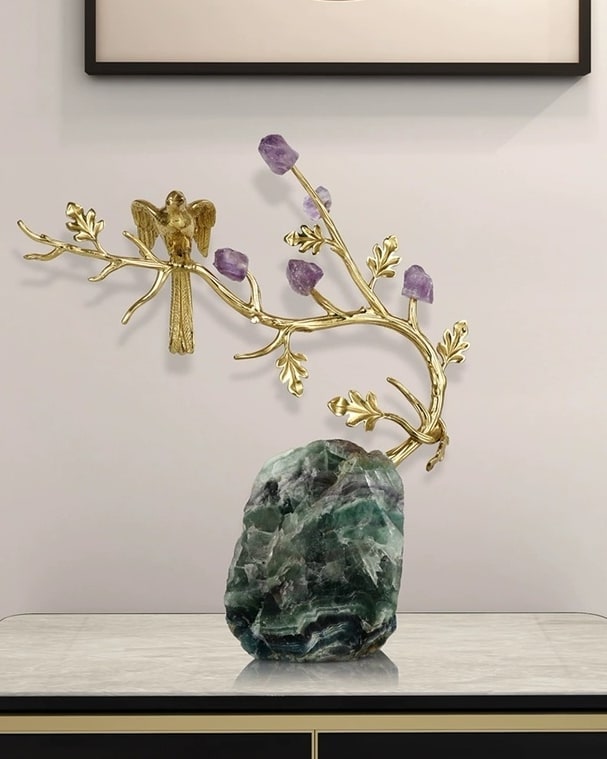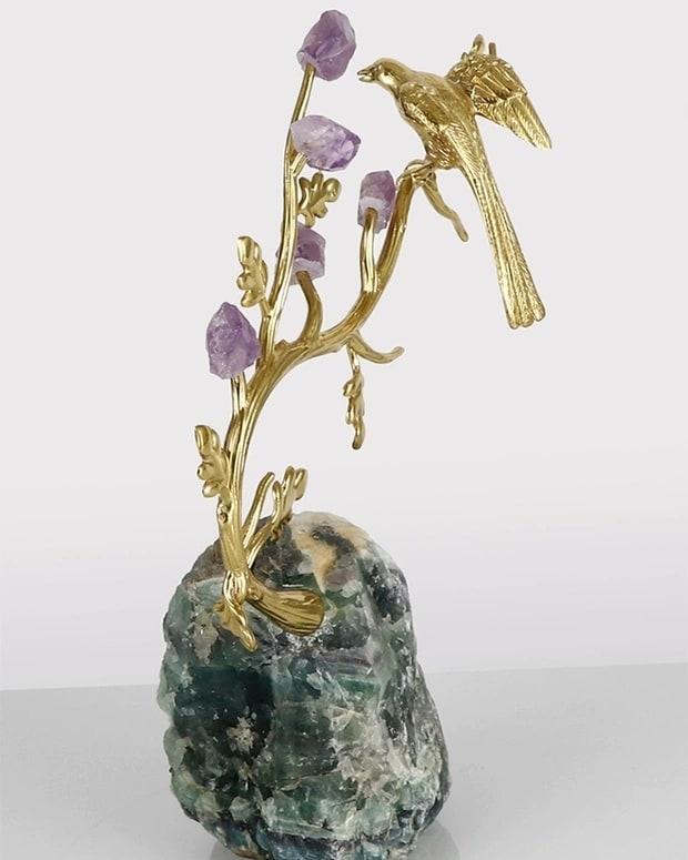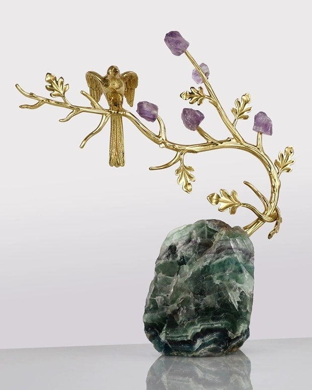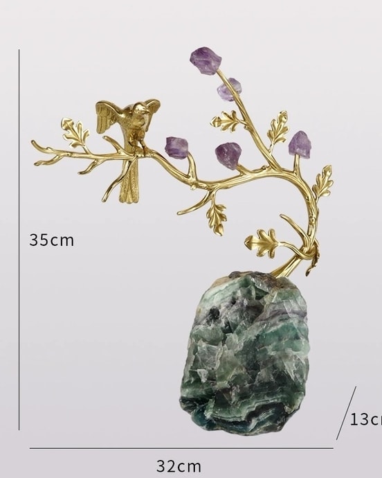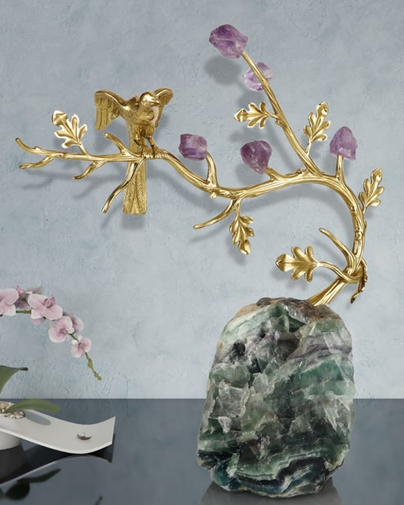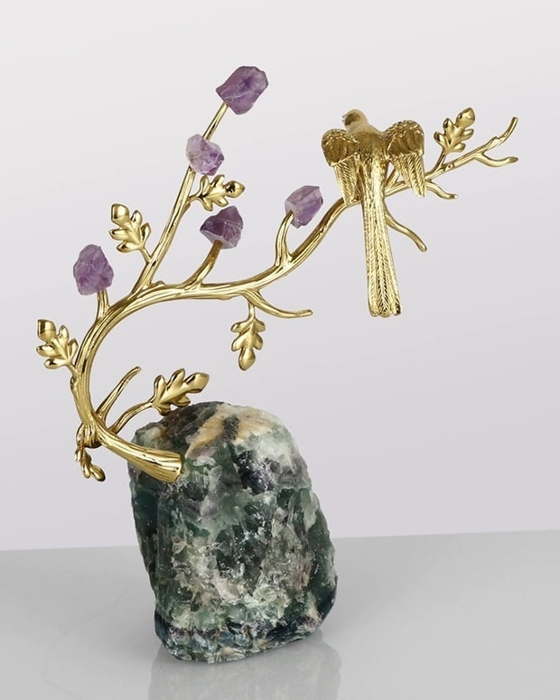 Волшебный декор для стильного современного интерьера! Роскошная птица Счастья на древе из благородной латуни, отборных кристаллов аметиста. Мировую гору символизирует натуральный флюорит. Красивый, со смыслом, декор. Считается, что он приносит удачу во всех начинаниях, гармонизирует жизнь, дарит спокойствие.