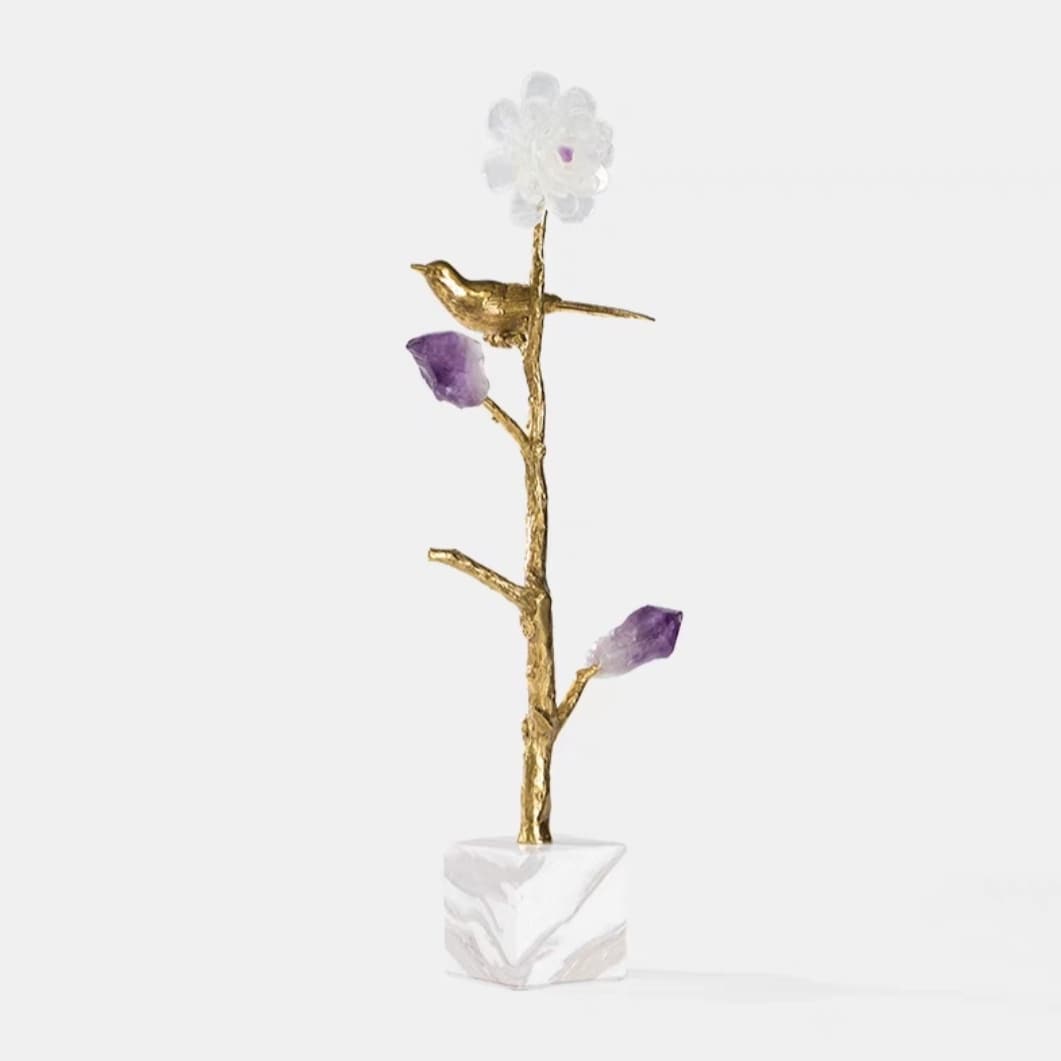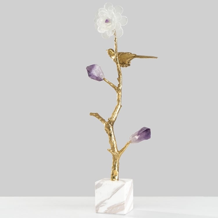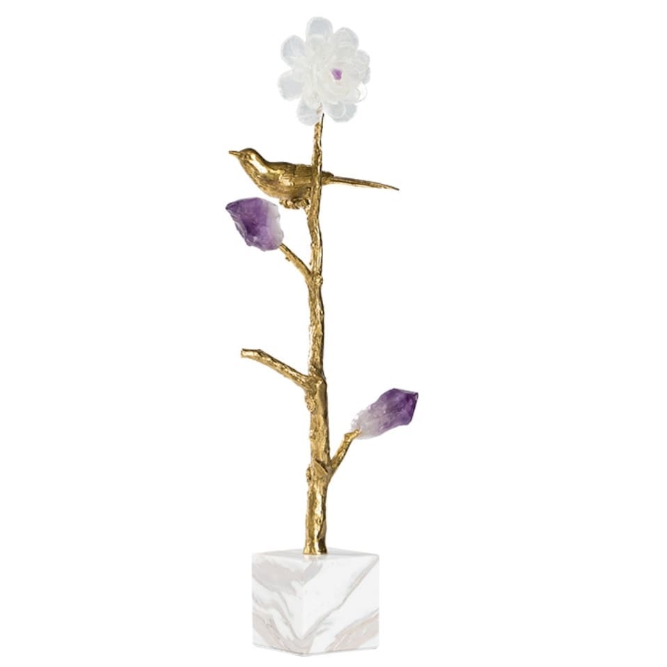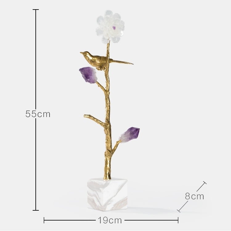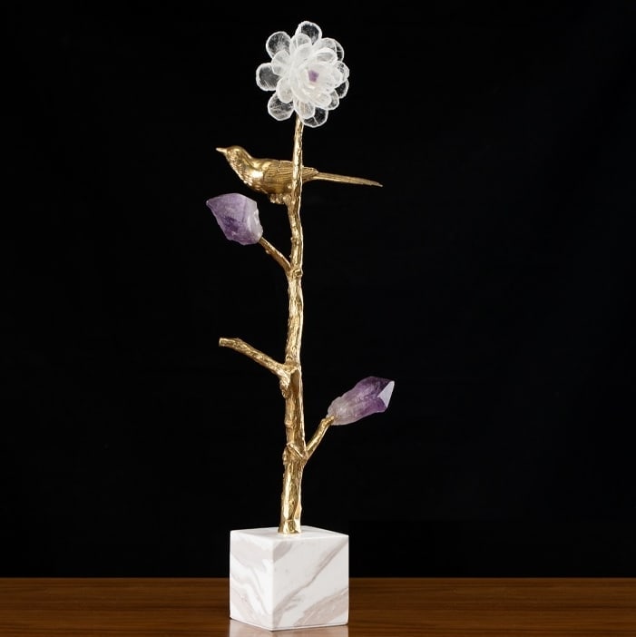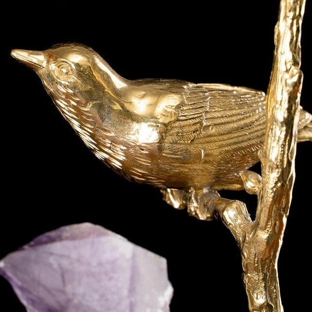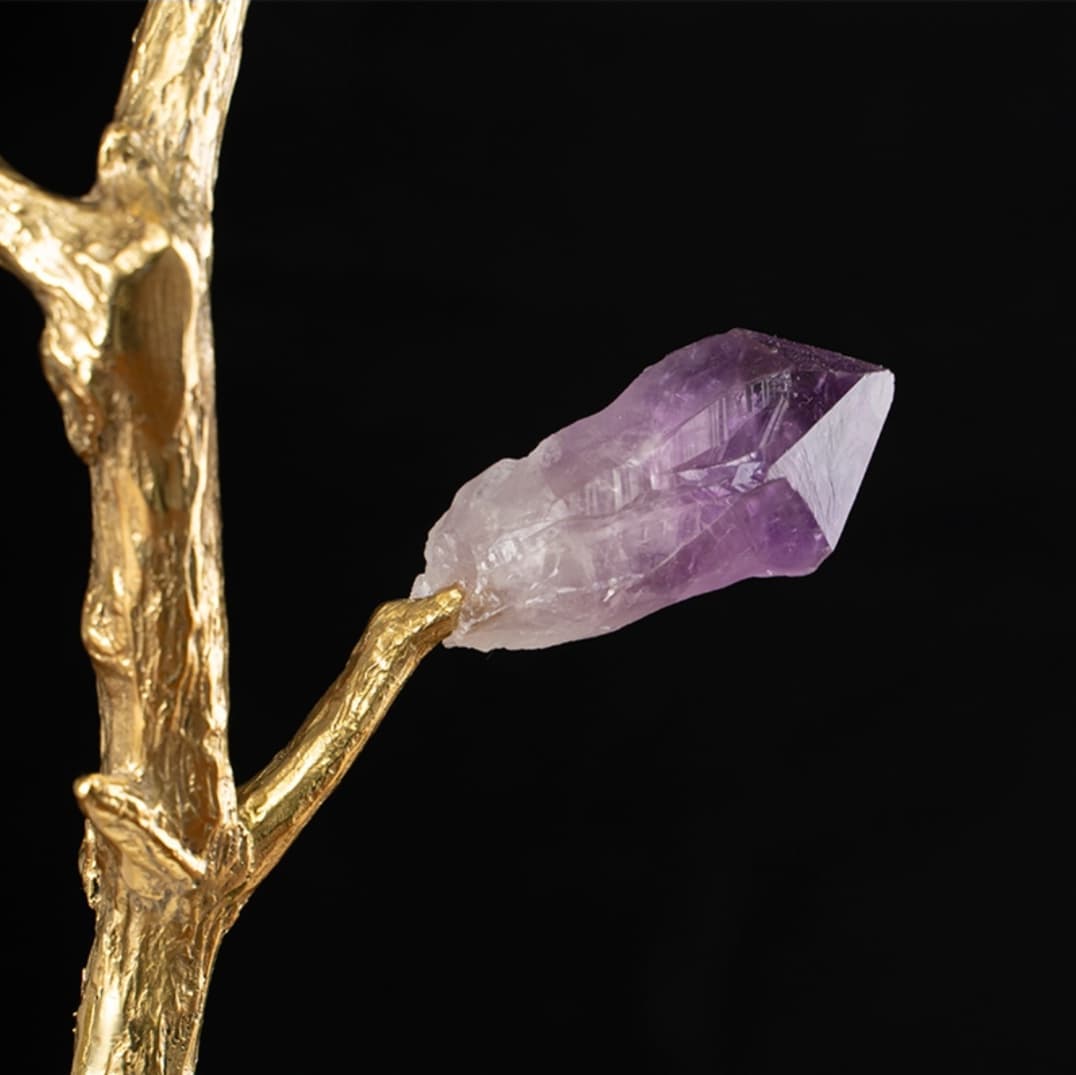 Стильный, прекрасный декор с глубоким символизмом, для истинных ценителей минимализма. Благородная латунь и натуральные кристаллы аметиста, кварца. Стилизованное мировое древо с мифологическое птичкой, которая передает весточки от земли – к небу, а от неба – к земле. Классное, уникальное украшение для вашего личного пространства – домашнего и (или) делового.