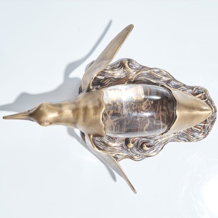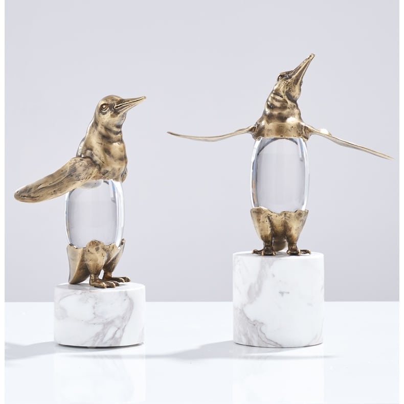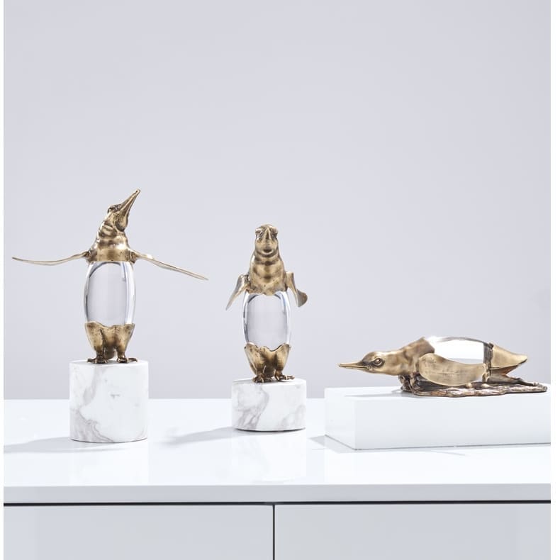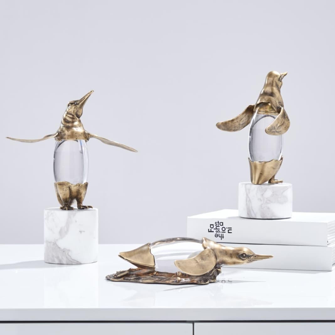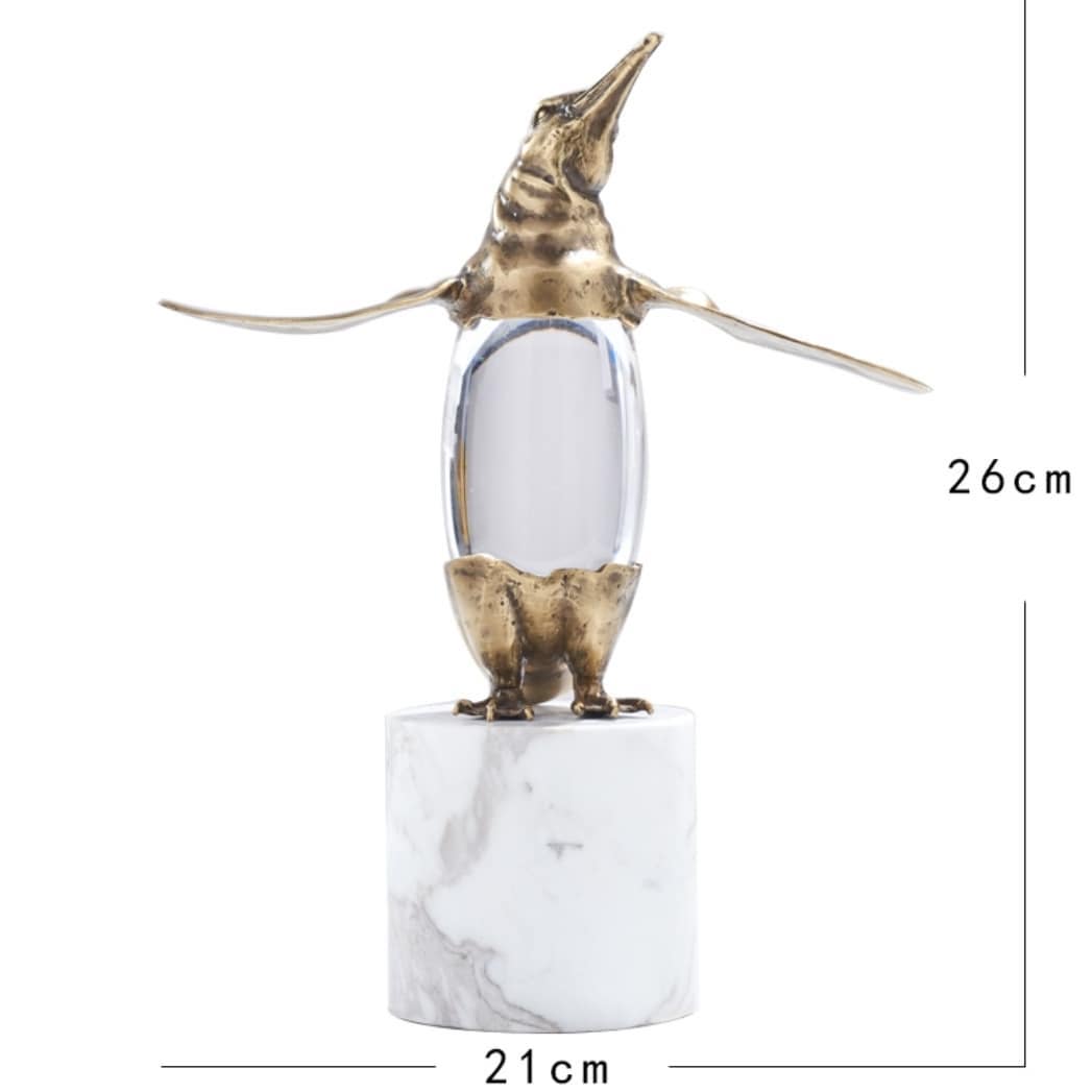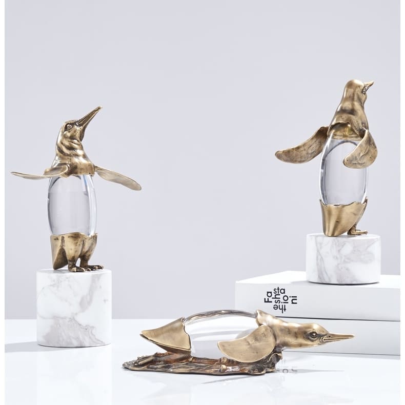 Классные пингвины из благородной латуни, с хрустальным пузиком, на подставочке из натурального мрамора. Прекрасное украшение для домашнего и (или) делового интерьера. Пингвины словно бы говорят: «Ну, бывает и так, и что теперь? Расслабься!». Очень полезный, стильный декор. Иногда полезно посмотреть на мир через «пузико» пингвина или же насладиться невероятной красотой преломленных солнечных лучей, когда они достигают пингвинов.
