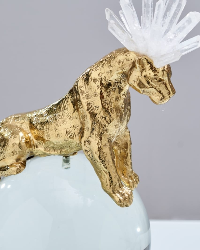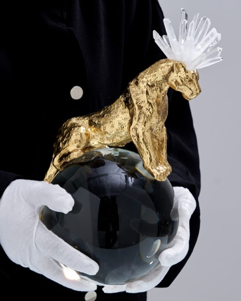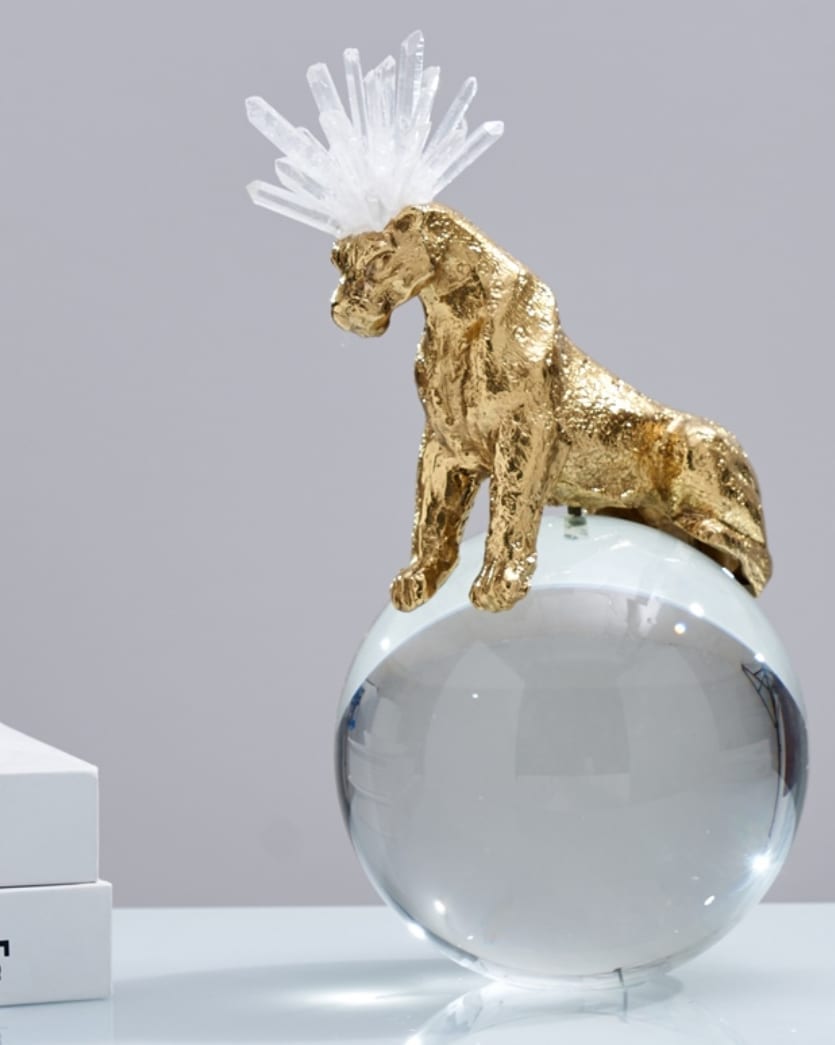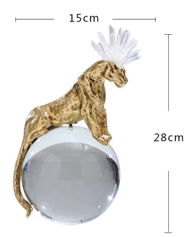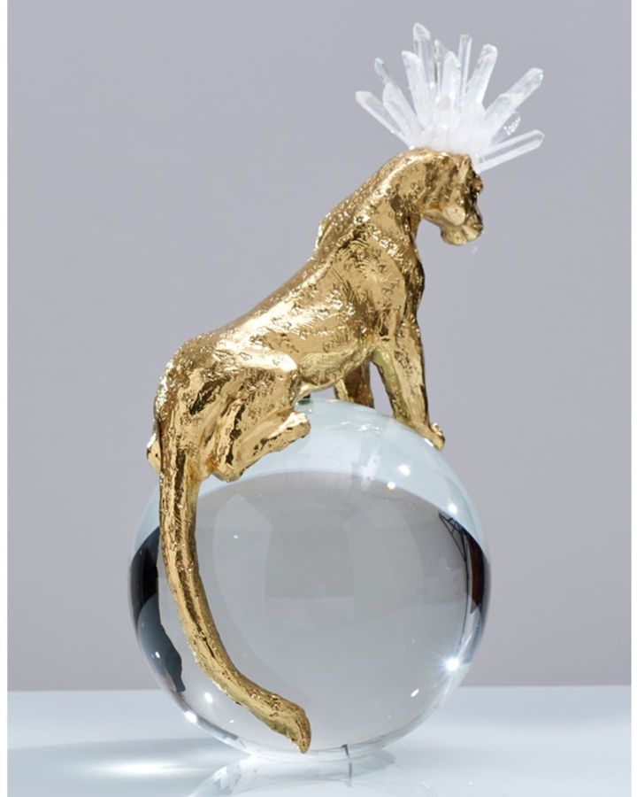 Роскошный хрустальный шар, украшенный фигурой величественного фэнтезийного леопарда из благородной латуни и отборных кристаллов горного хрусталя. Яркий декор, который отлично впишется в домашний и (или) деловой интерьер. Красота, которая поможет развить, при желании, мантические способности. Знание будущего сейчас особенно актуально.