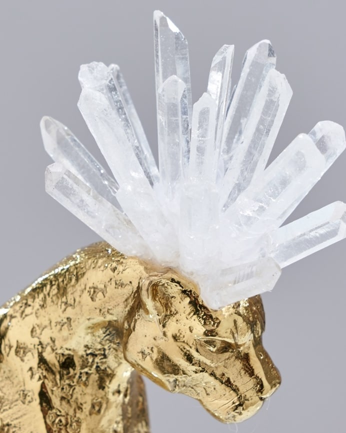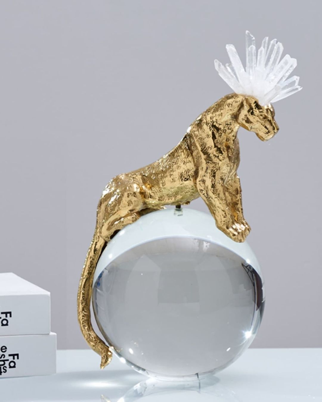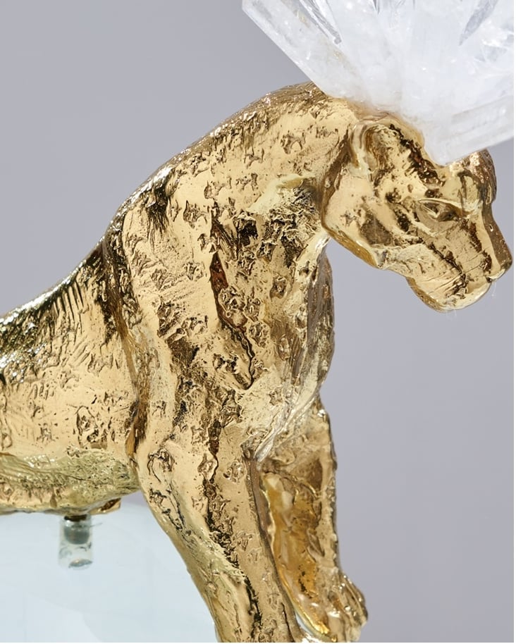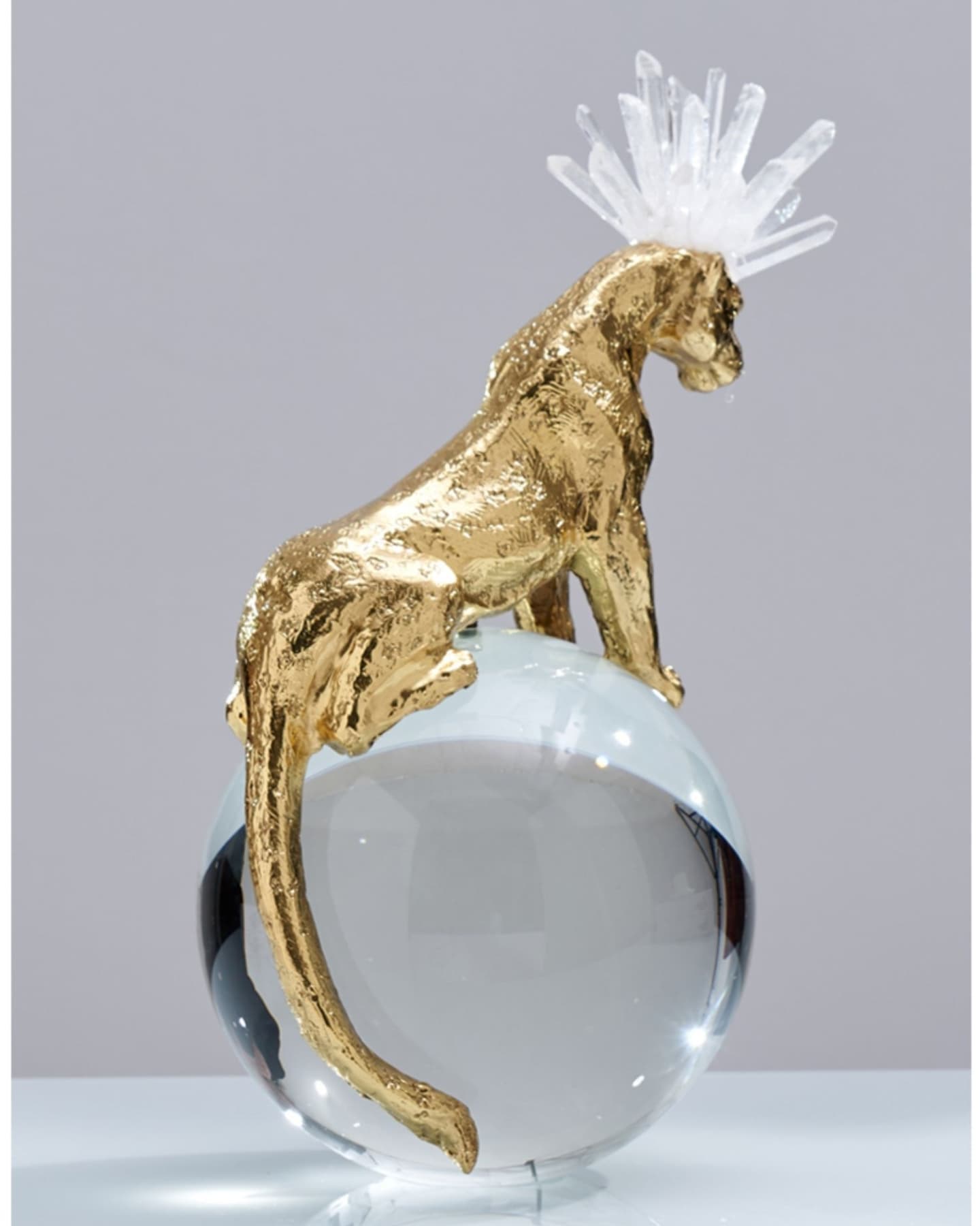Роскошный хрустальный шар, украшенный фигурой величественного фэнтезийного леопарда из благородной латуни и отборных кристаллов горного хрусталя. Яркий декор, который отлично впишется в домашний и (или) деловой интерьер. Красота, которая поможет развить, при желании, мантические способности. Знание будущего сейчас особенно актуально.