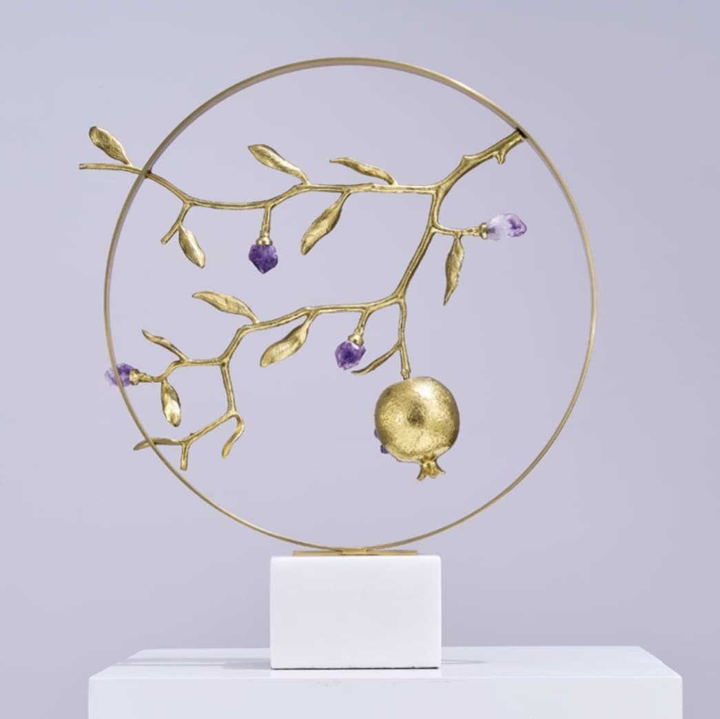 Прекрасно-изящная веточка граната, стилизованная под ловца снов, только изготовленная из благородной латуни, отборных кристаллов натурального аметиста и белоснежного мрамора. Мощный и действенный, позитивный символизм верности, преданности, силы и любви. Отличное, шикарное решения для современного, стильного интерьера – домашнего и (или) делового.