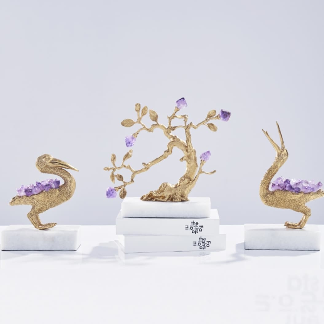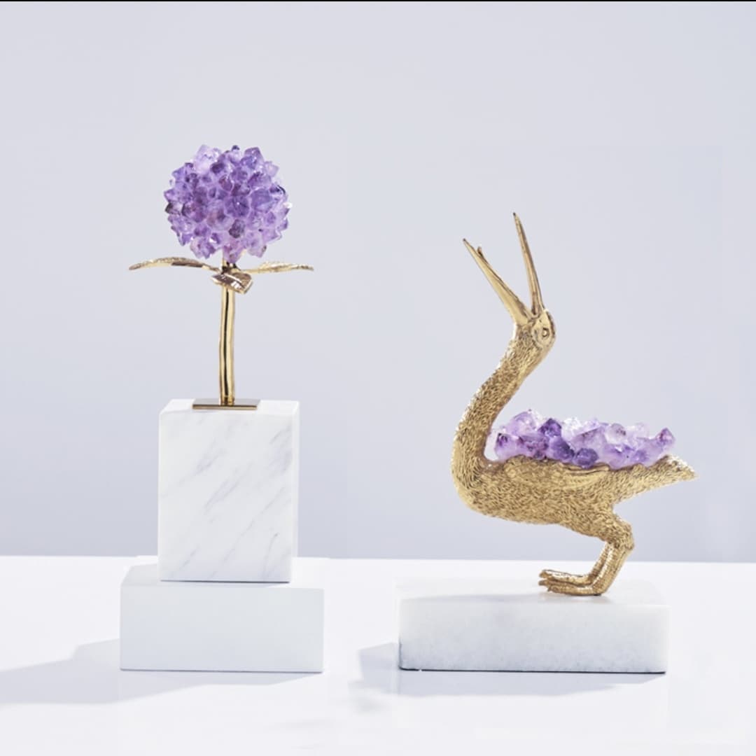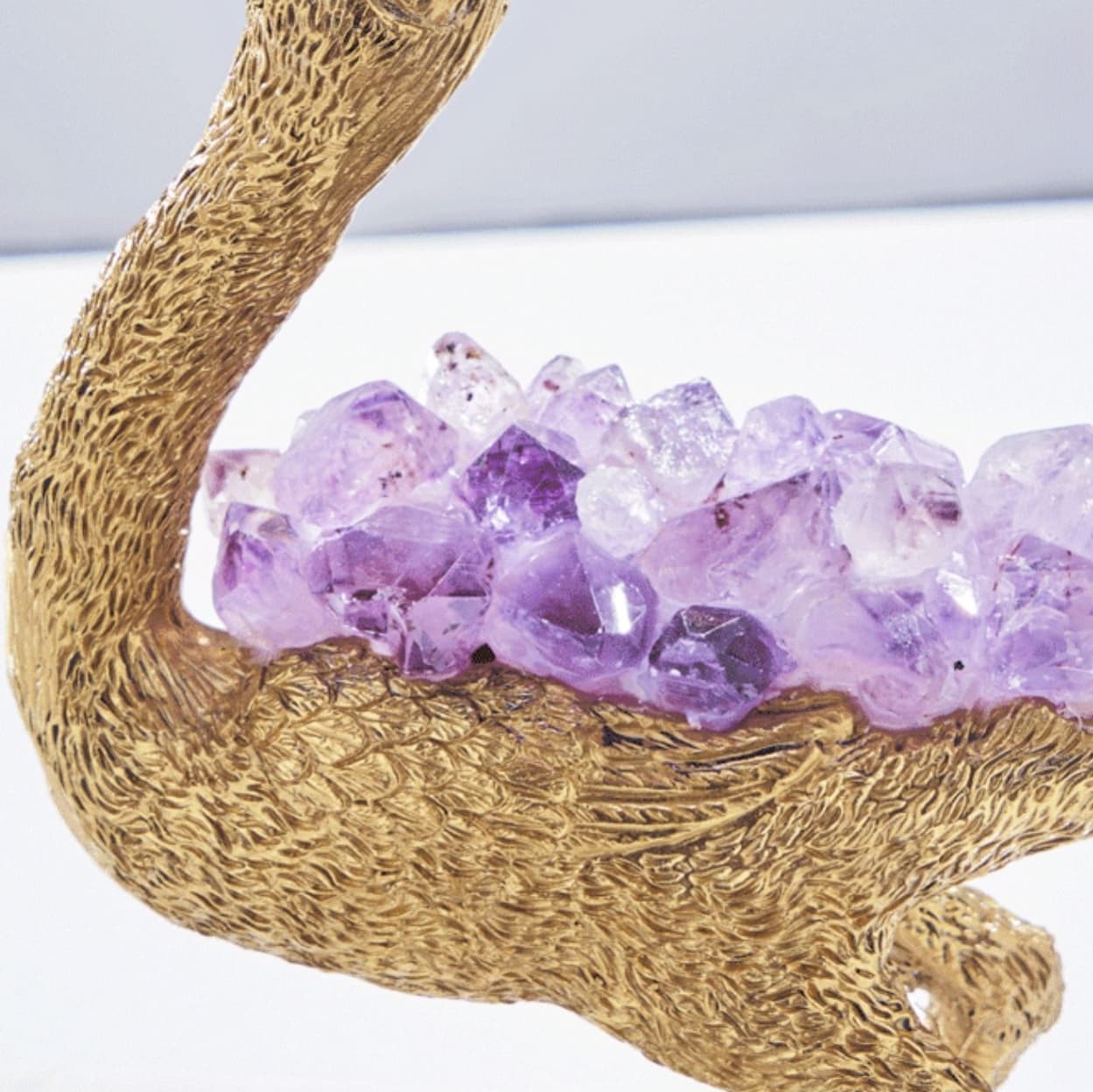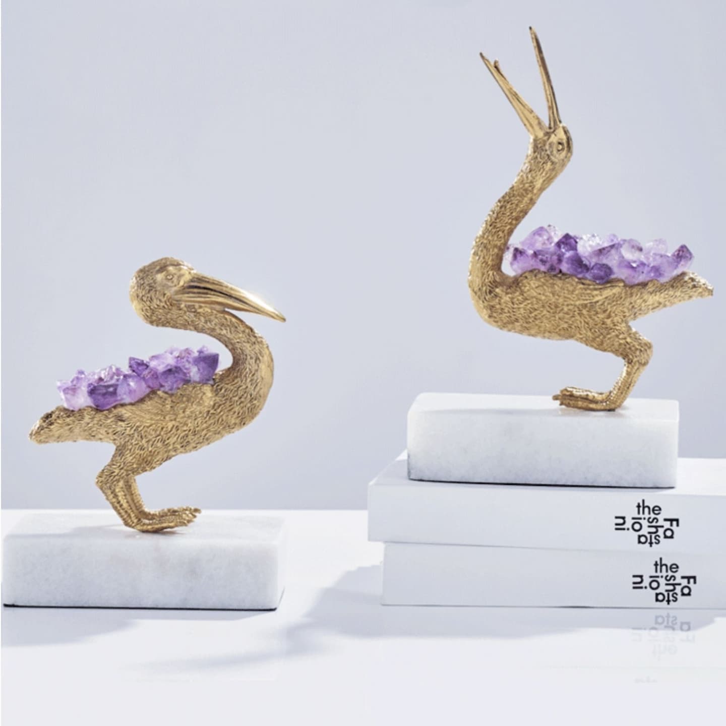 Очаровательные пеликанчики из латуни и отборных кристаллов аметиста. Подставка – натуральный, белоснежный мрамор. Позитивный символизм родительской любви, благородства и милосердия. Красивое и яркое решение для современного, статусного интерьера – домашнего и (или) делового.