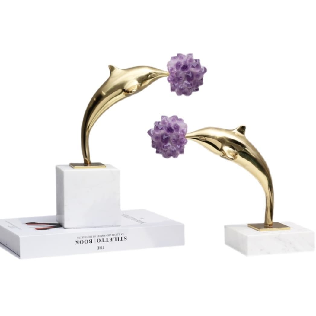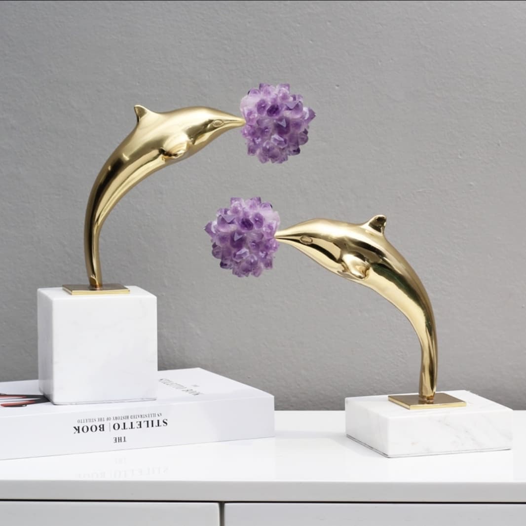 Очаровательные дельфины с «мячиками» из отборных кристаллов аметиста или горного хрусталя – на выбор. Позитивная красота, которая отлично впишется в домашний и (или) деловой интерьер. Мощный символизм свободолюбия, радости, благородства, любви к морю – в частности, и к водной стихии – в целом! Роскошный декор для хорошего настроения в любую погоду, в любое время года.