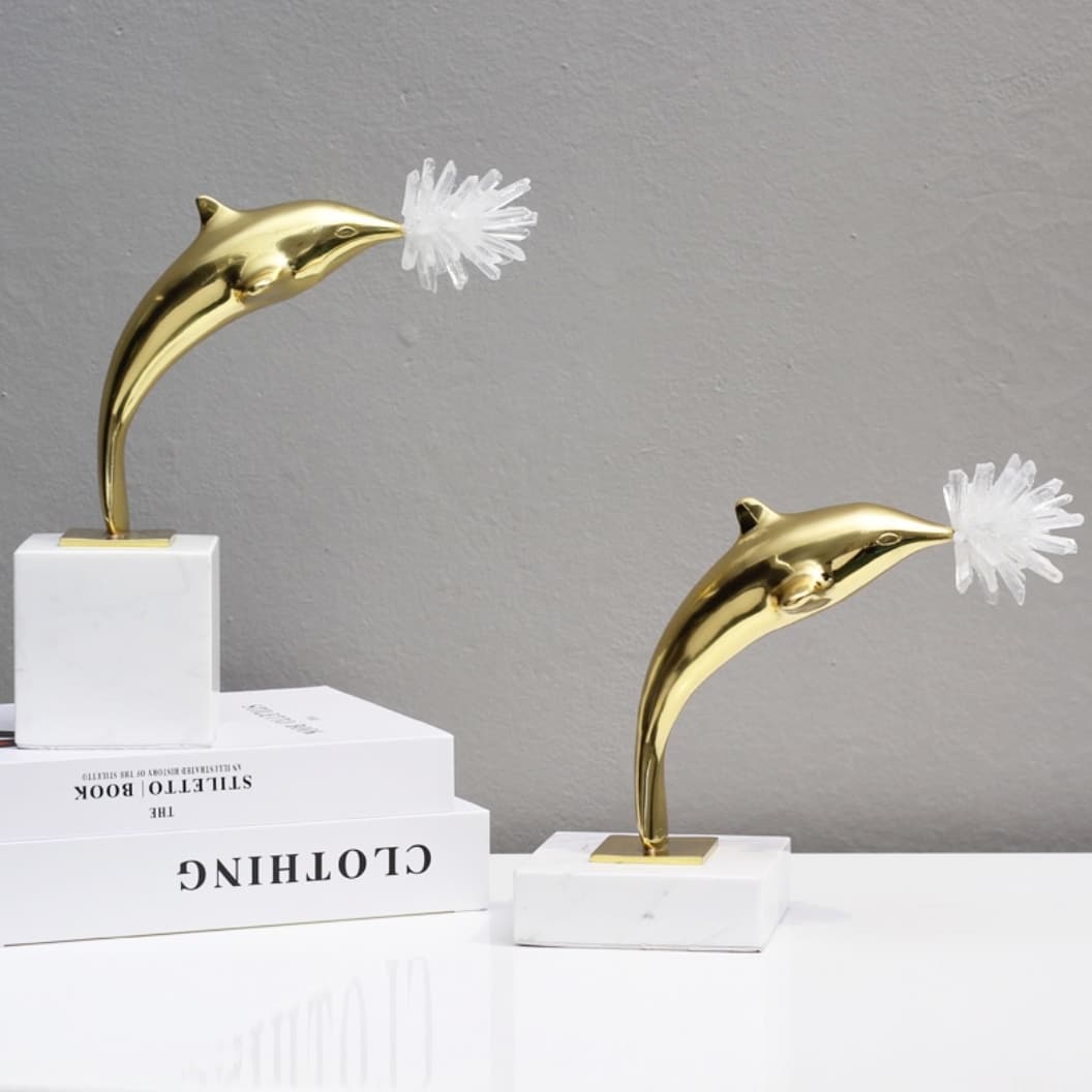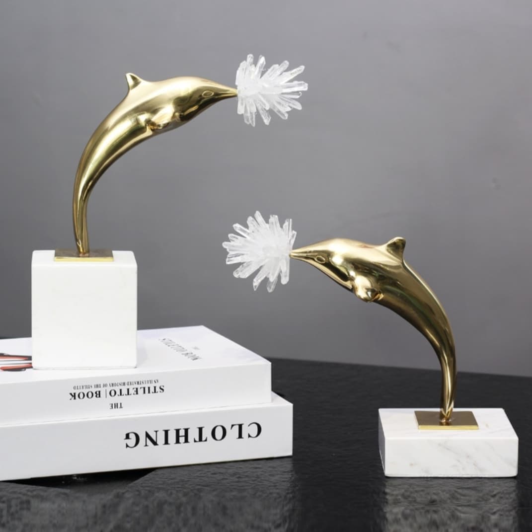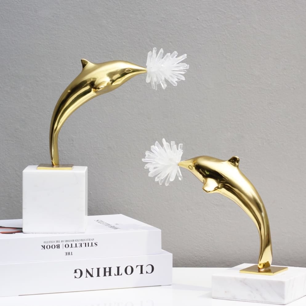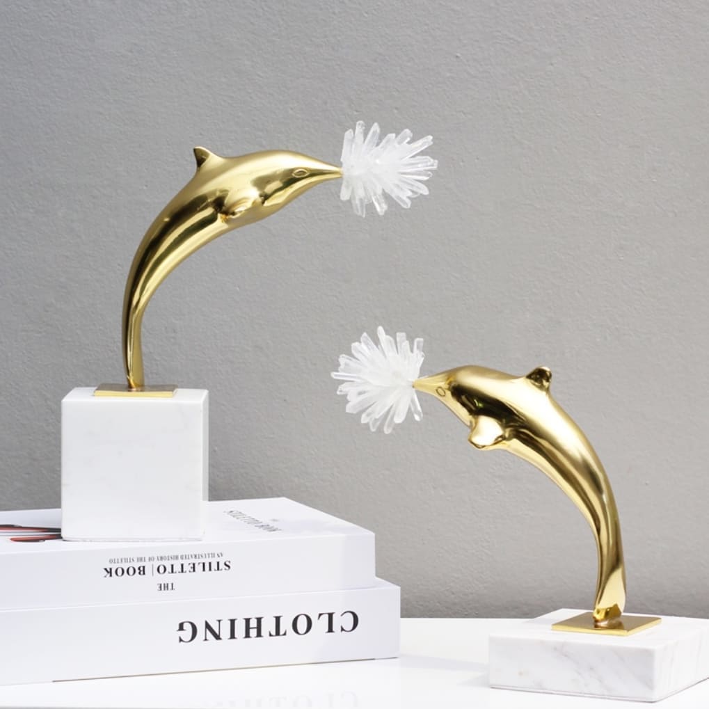 Очаровательные дельфины с «мячиками» из отборных кристаллов аметиста или горного хрусталя – на выбор. Позитивная красота, которая отлично впишется в домашний и (или) деловой интерьер. Мощный символизм свободолюбия, радости, благородства, любви к морю – в частности, и к водной стихии – в целом! Роскошный декор для хорошего настроения в любую погоду, в любое время года.