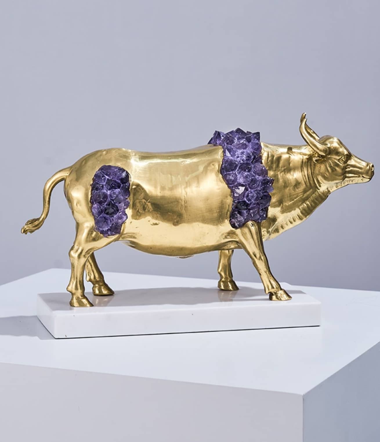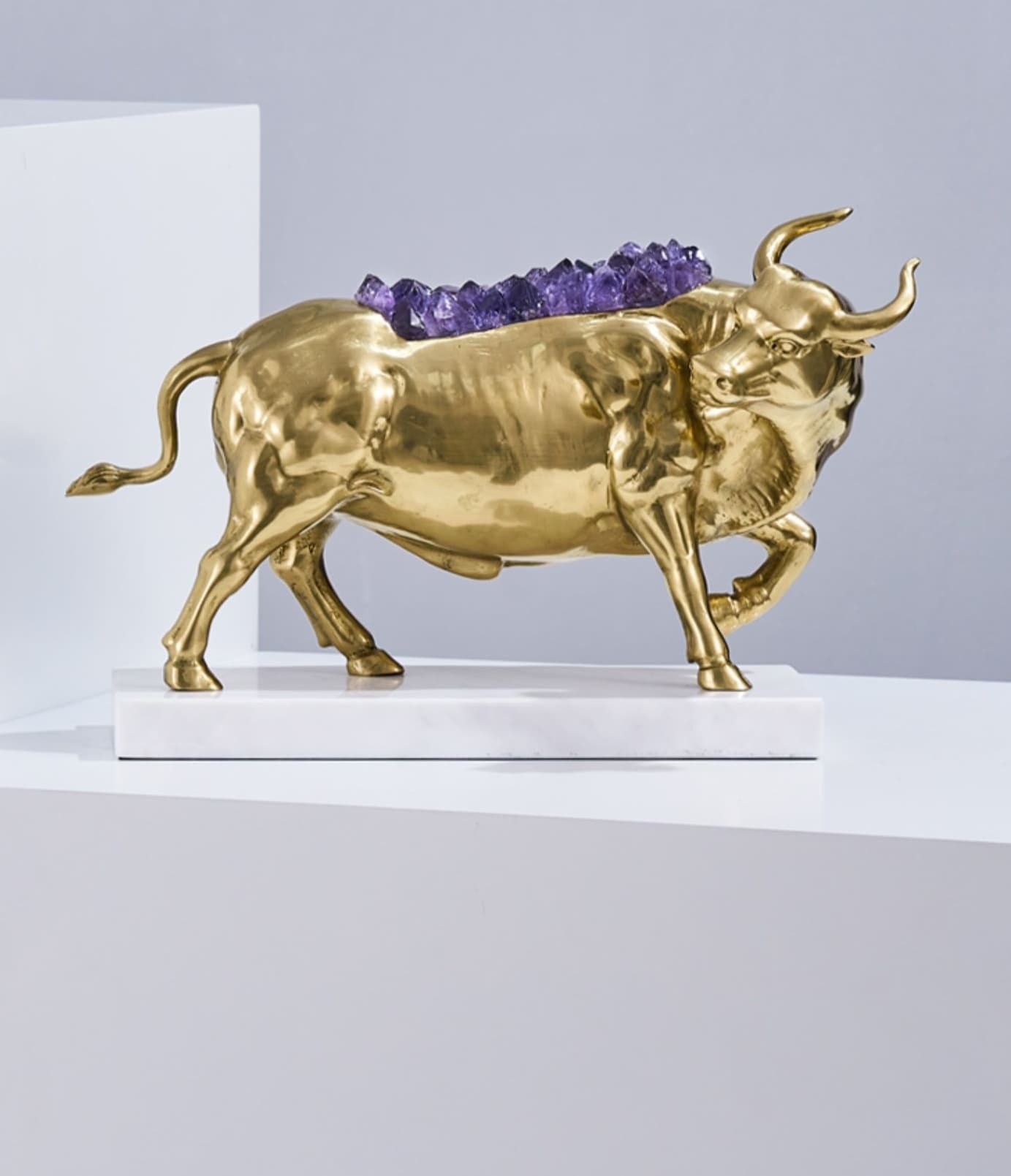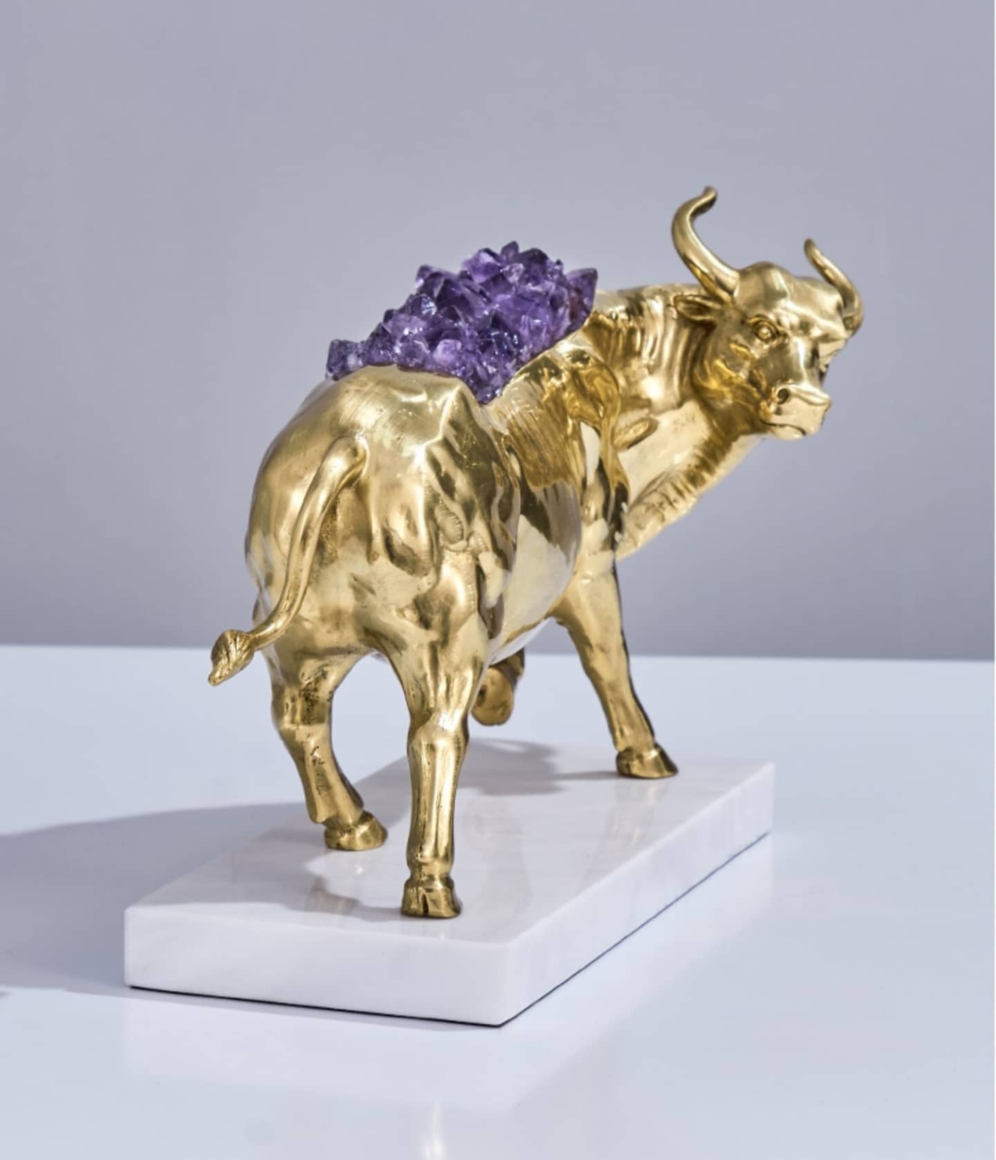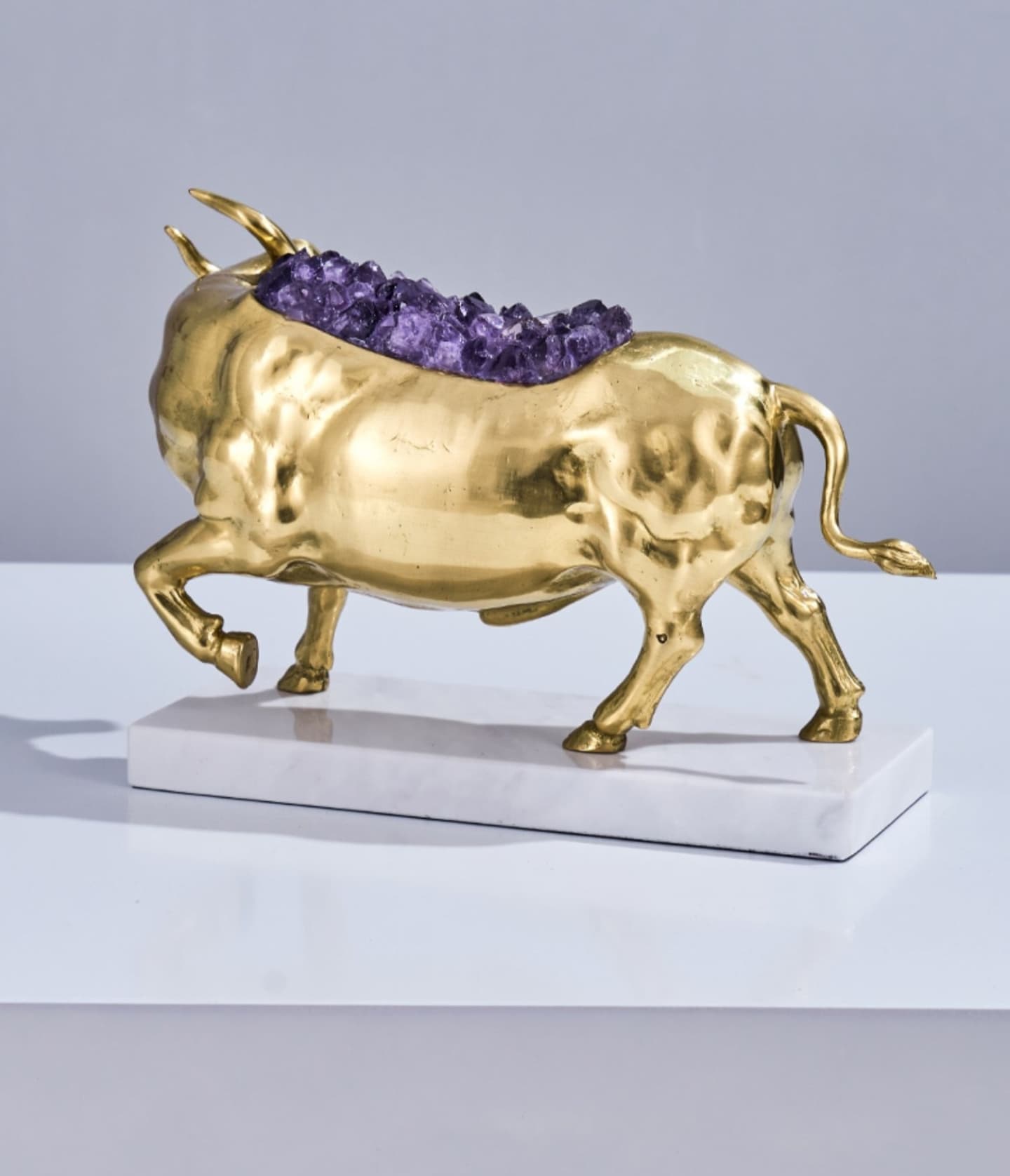 Блестящие быки из благородной латуни и натуральных кристаллов аметиста. Подставка – белоснежный мрамор. Красивый, насыщенный мощной энергией декор. Отлично будет смотреться в домашнем и (или) деловом интерьере. Рекомендуется всем, кто рожден под знаком Тельца, и кто проявляет максимум усилий в достижении своих жизненных целей.