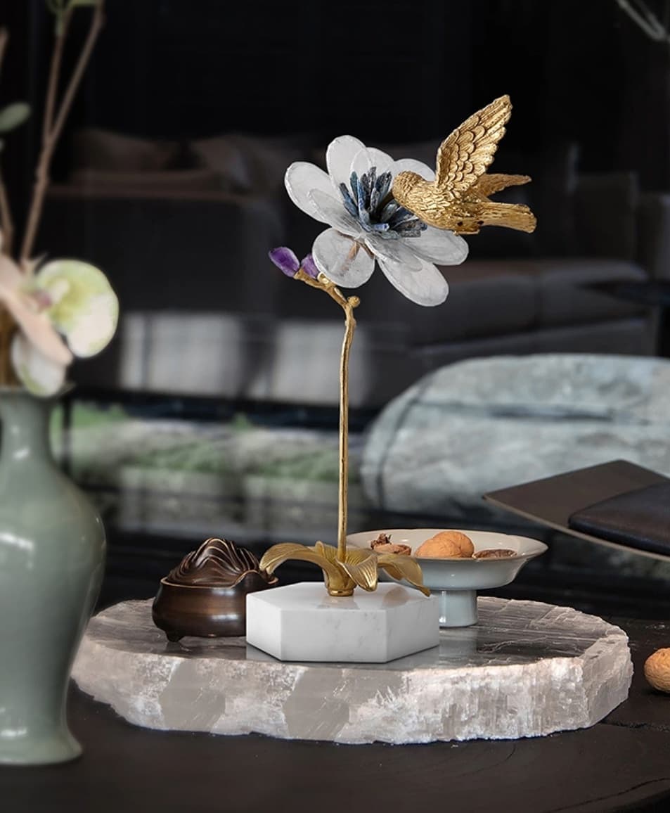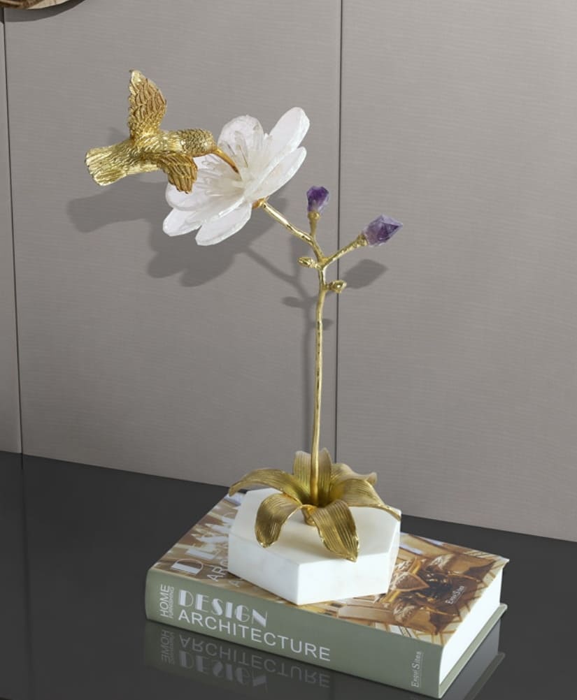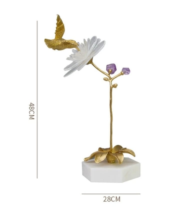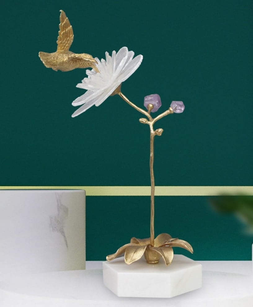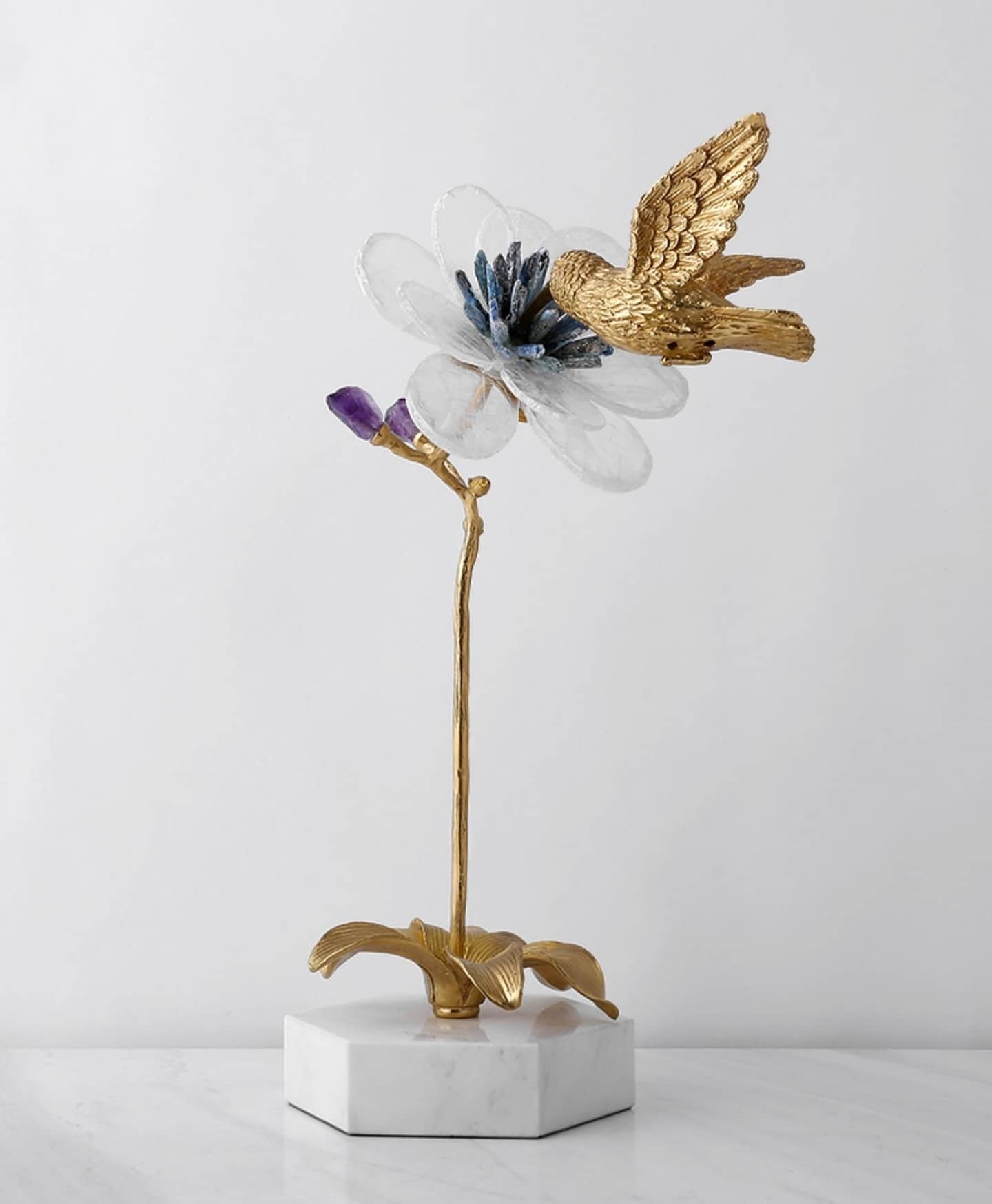 Изящная птичка-колибри в поисках нектара в очаровательном цветке – прелестный декор из благородной латуни, натурального мрамора и отборных кристаллов аметиста, селенита и кварца. Роскошная композиция, которая украсит современный, стильный интерьер – домашний и (или) деловой.