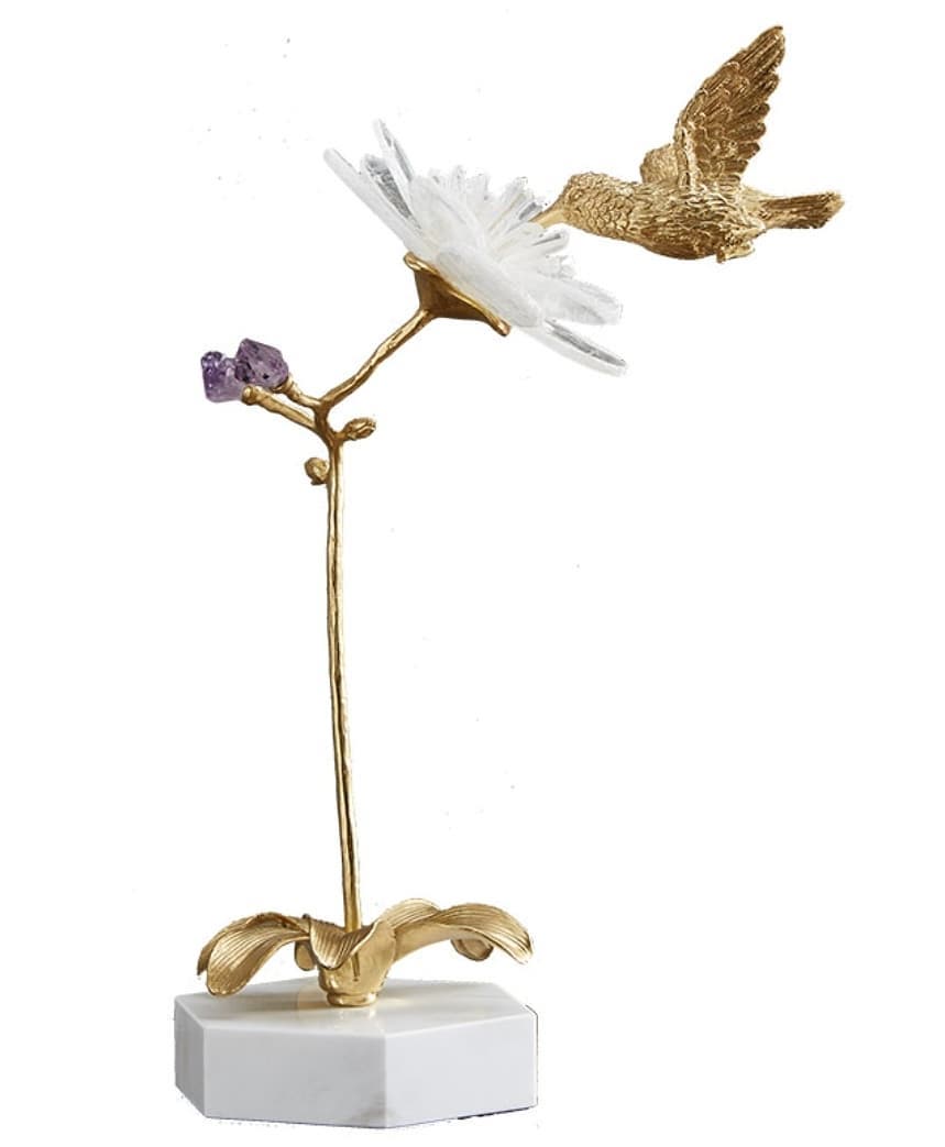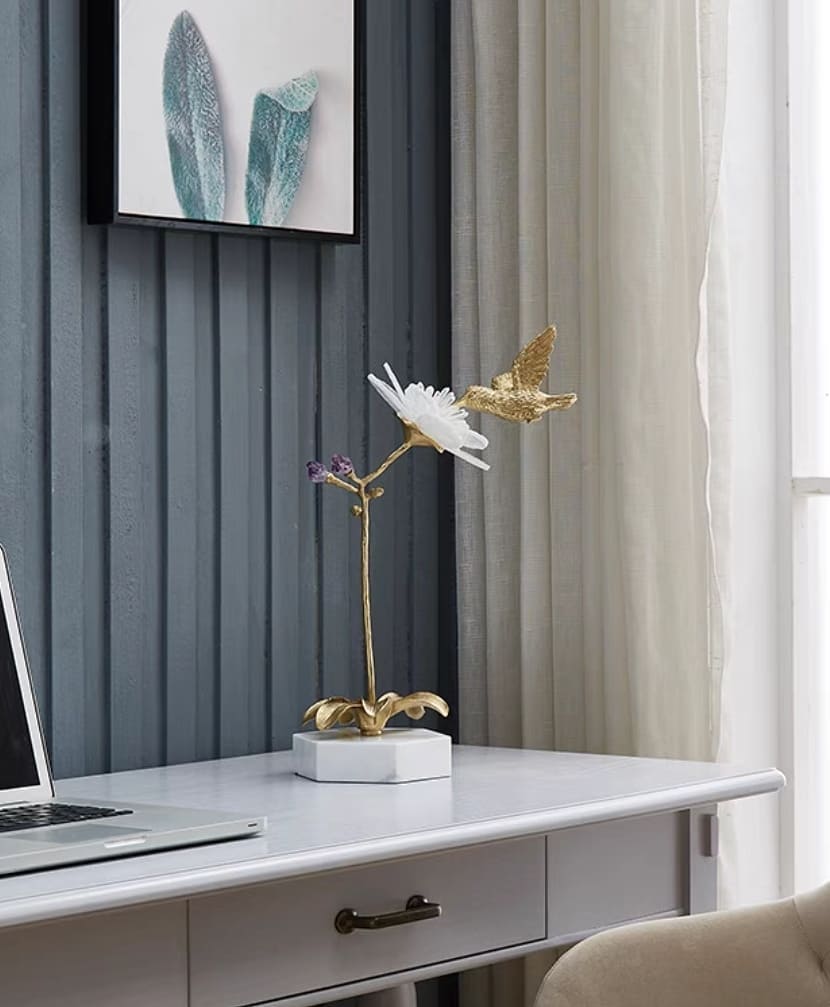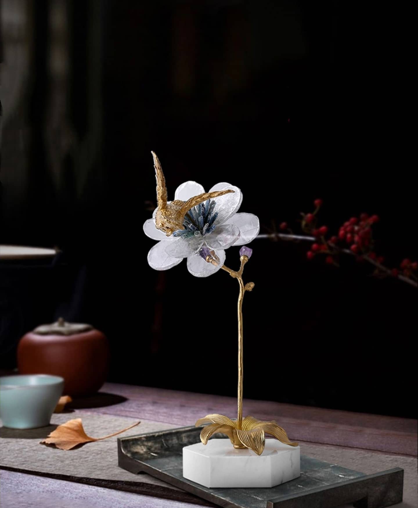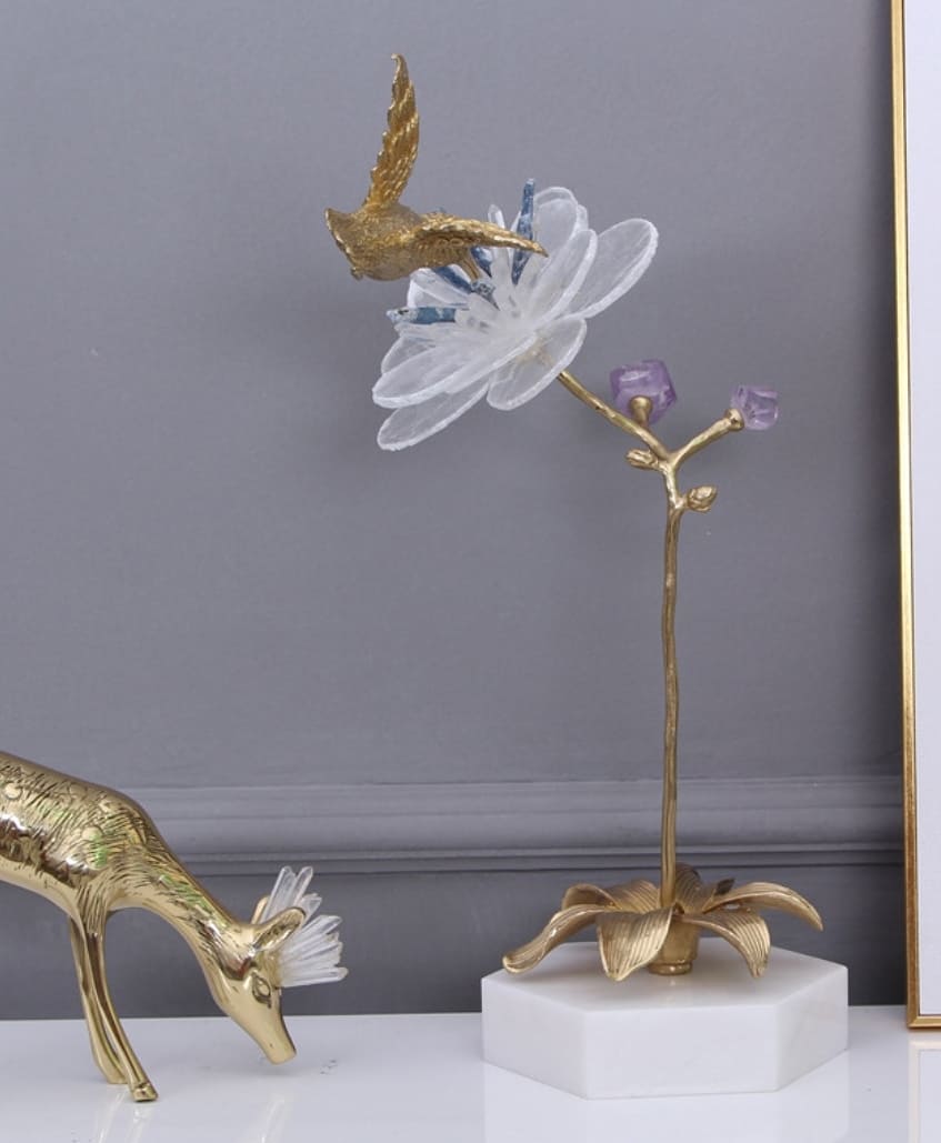 Изящная птичка-колибри в поисках нектара в очаровательном цветке – прелестный декор из благородной латуни, натурального мрамора и отборных кристаллов аметиста, селенита и кварца. Роскошная композиция, которая украсит современный, стильный интерьер – домашний и (или) деловой.