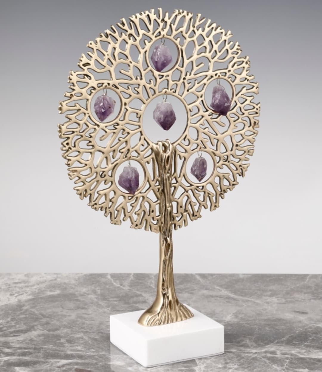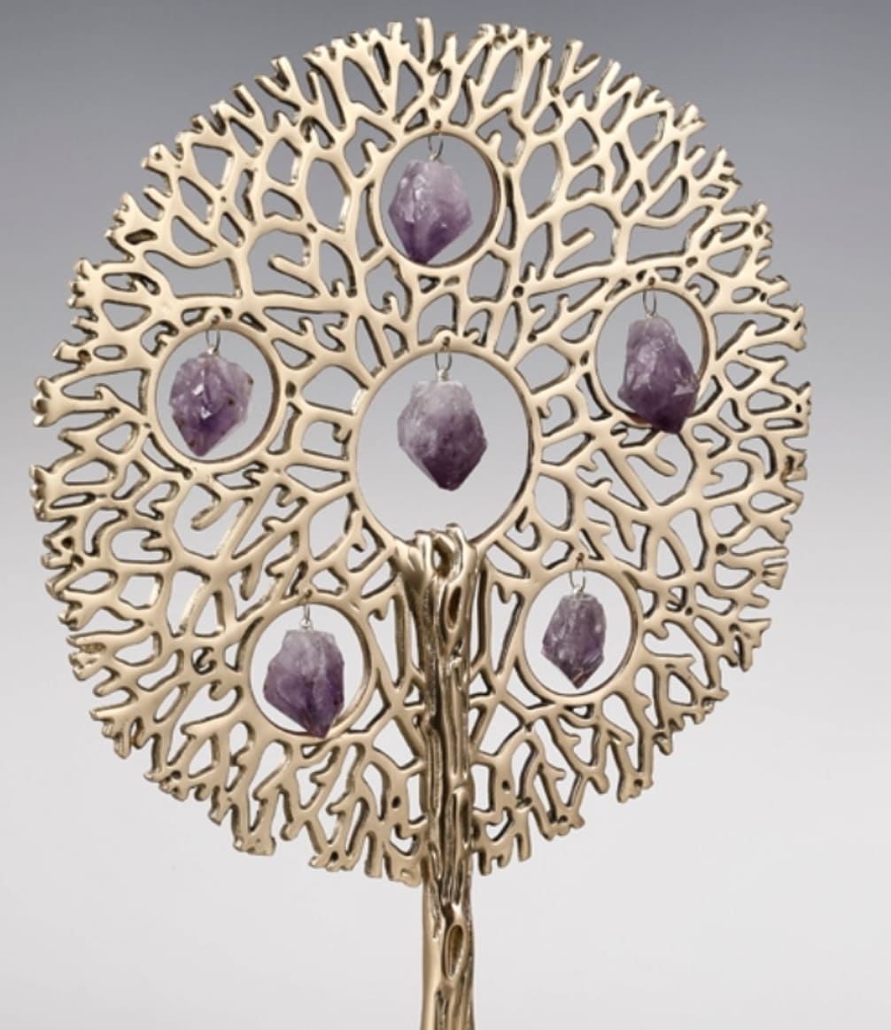 На эту роскошную вещь можно посмотреть с двух точек зрения. Первая – это просто очаровательный декор из натурального аметиста, благородной латуни и мрамора. Декор, от которого не отвести глаз, и который украсит как домашний, так и деловой интерьер. А можно увидеть в нем глубокий символизм мирового дерева, и звезду, как гармоничное сочетание четырех природных стихий и того самого, пятого элемента, который делает человека – человеком.