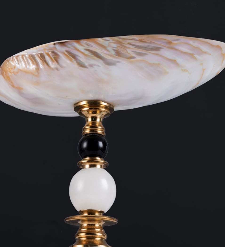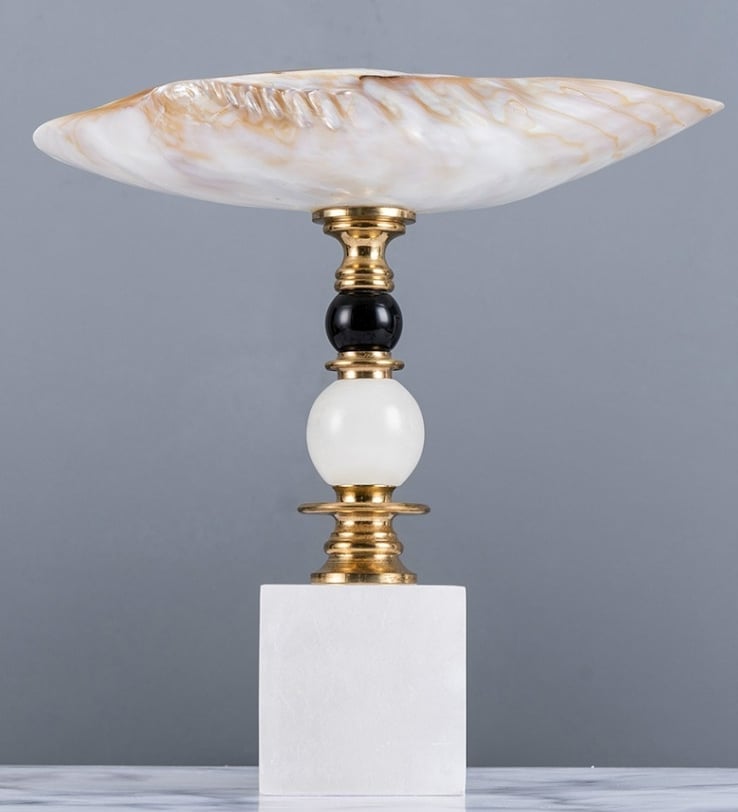 Очаровательная перламутровая раковина, на подставке из благородной латуни и мрамора. Изящный, прекрасный декор, который можно наполнить любимыми украшениями и т.п. вещицами, а можно просто поставить на столик или полочку – в домашнем и (или) деловом интерьере. В обоих случаях – яркий, очень стильный акцент, моментально украсит, преобразит ваше личное пространство.