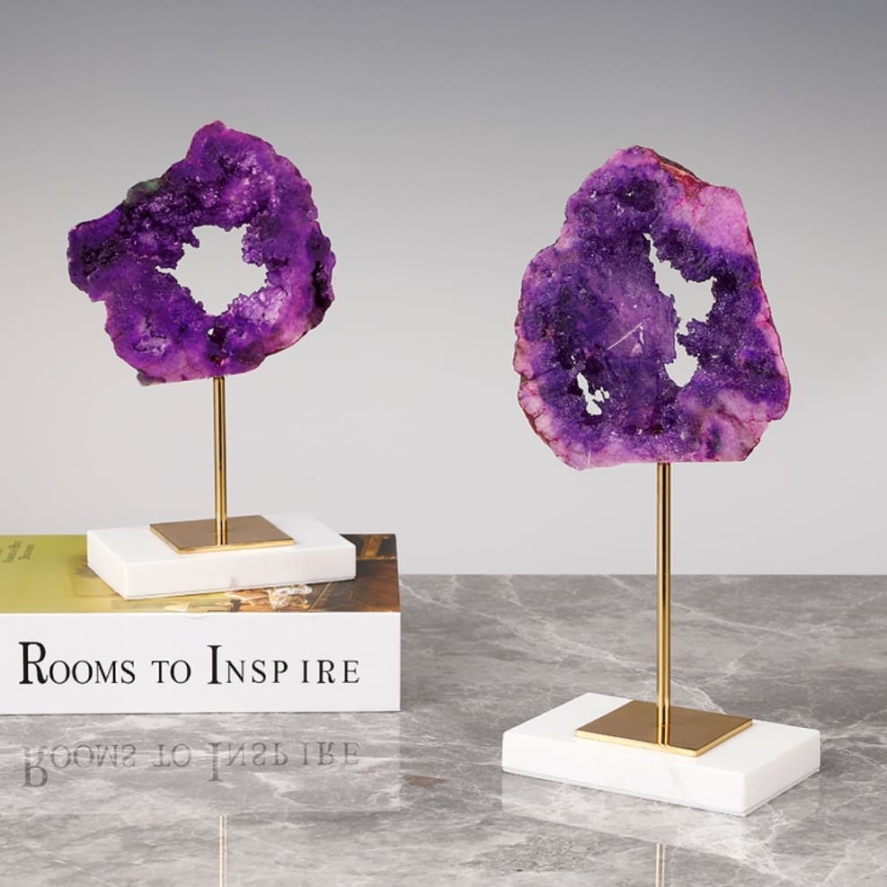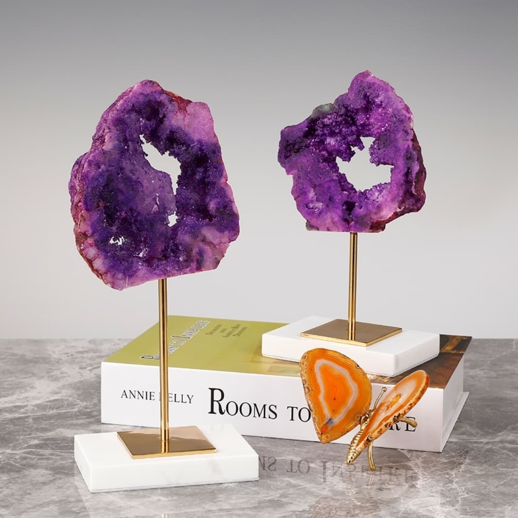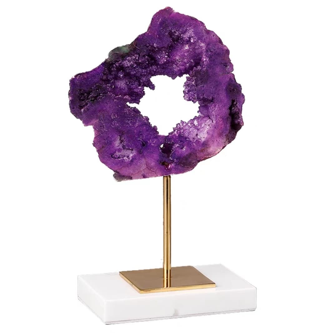 Иногда так классно посмотреть на мир через жеоду натурального аметиста. Особенно, если она стала основной частью роскошного, очаровательного декора. А ещё – благородная латунь и натуральный мрамор – в виде подставочки. Красота, которая украсит интерьер и привнесет в жизнь позитивную магию этого прекрасного камня.