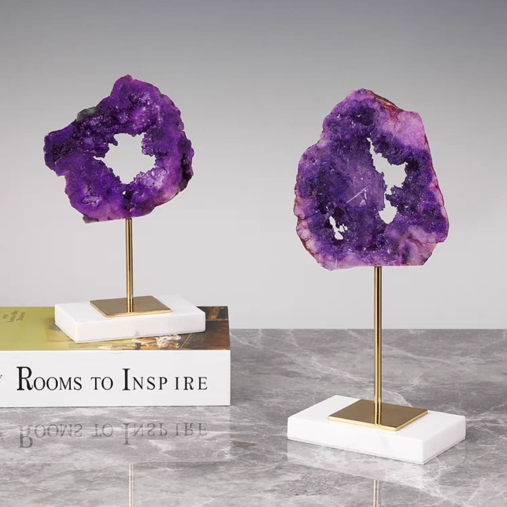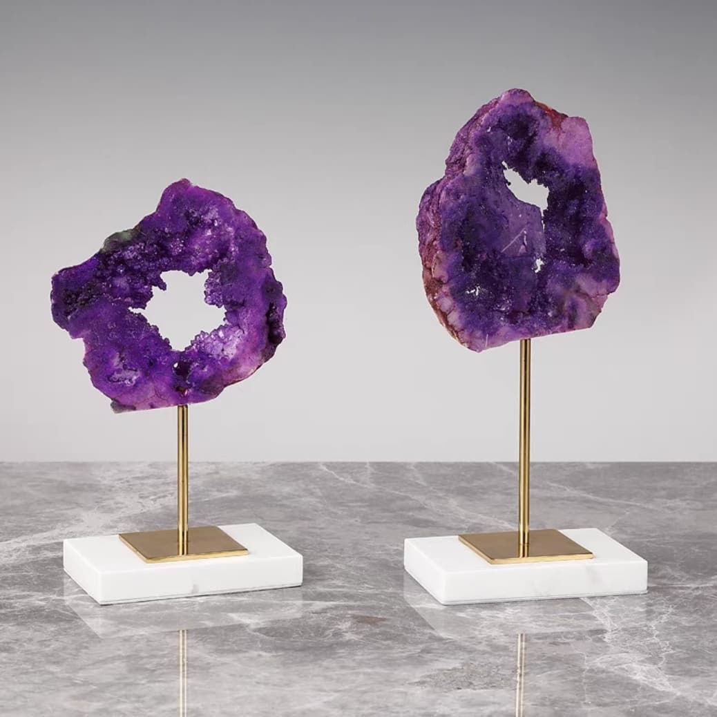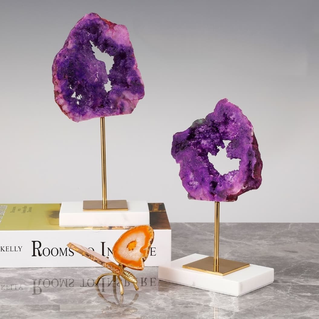 Иногда так классно посмотреть на мир через жеоду натурального аметиста. Особенно, если она стала основной частью роскошного, очаровательного декора. А ещё – благородная латунь и натуральный мрамор – в виде подставочки. Красота, которая украсит интерьер и привнесет в жизнь позитивную магию этого прекрасного камня.