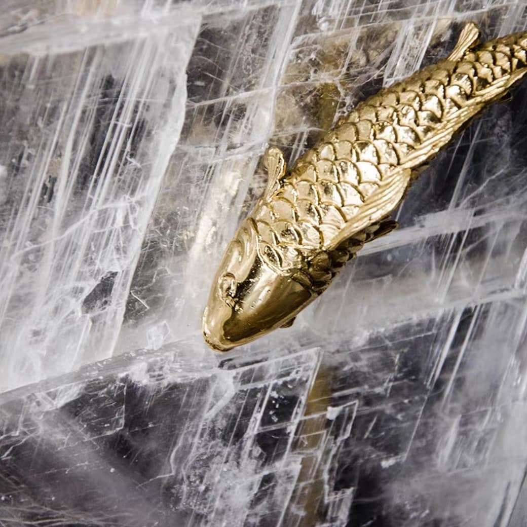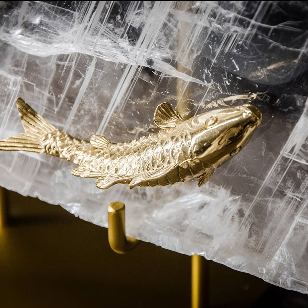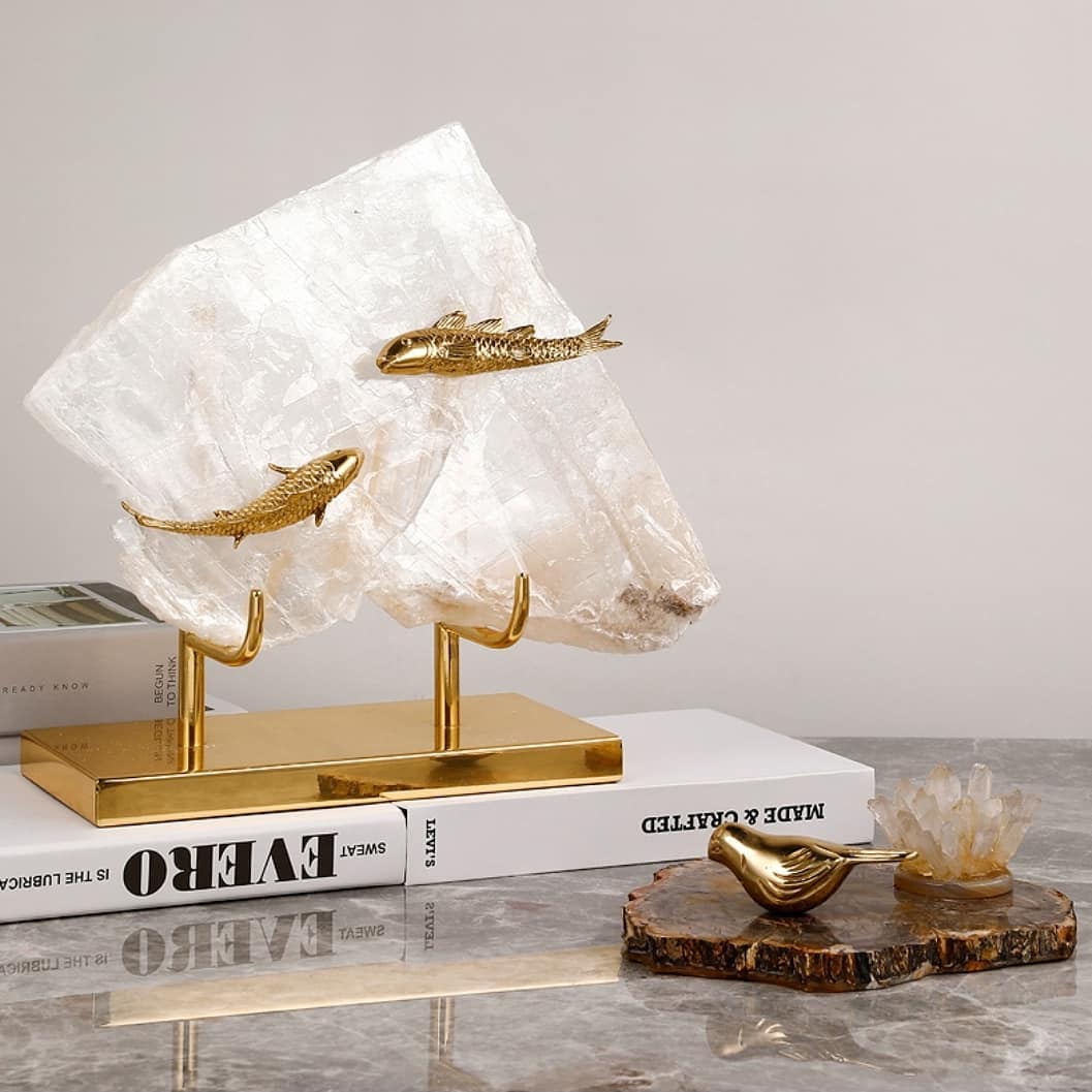 Золотые рыбки на чистейшем, белоснежном кварце. Отличный, яркий декор, который прекрасно впишется в домашний и (или) деловой интерьер, и не только у тех, кто любит рыбалку или занимается ею в промышленных масштабах. Шикарная линейка декора с рыбкам, но есть вариант и без них.