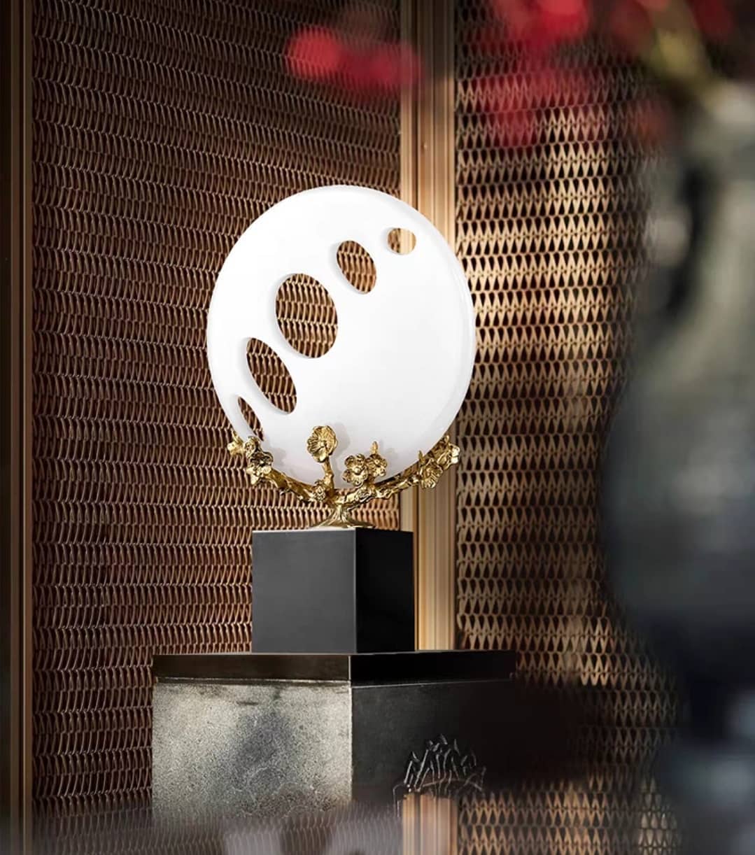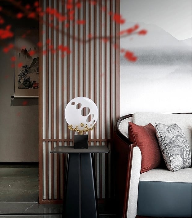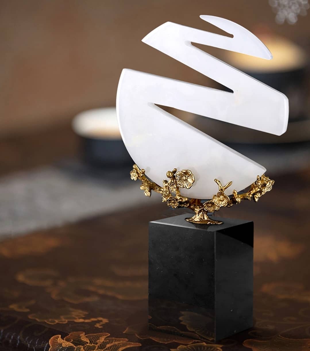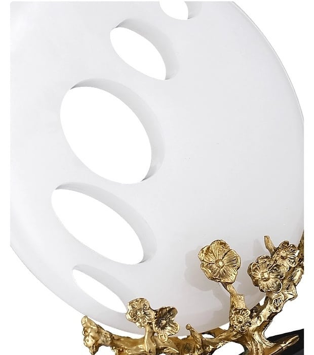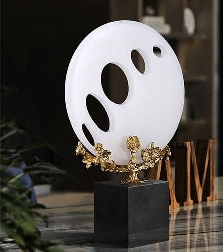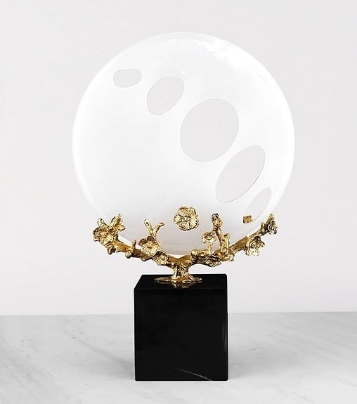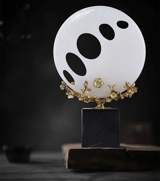 Шикарные ажурные шары из натурального нефрита, как символ неба, на деревьях из благородной латуни, и всё это великолепие – на мраморной, контрастной по цвету, подставке.