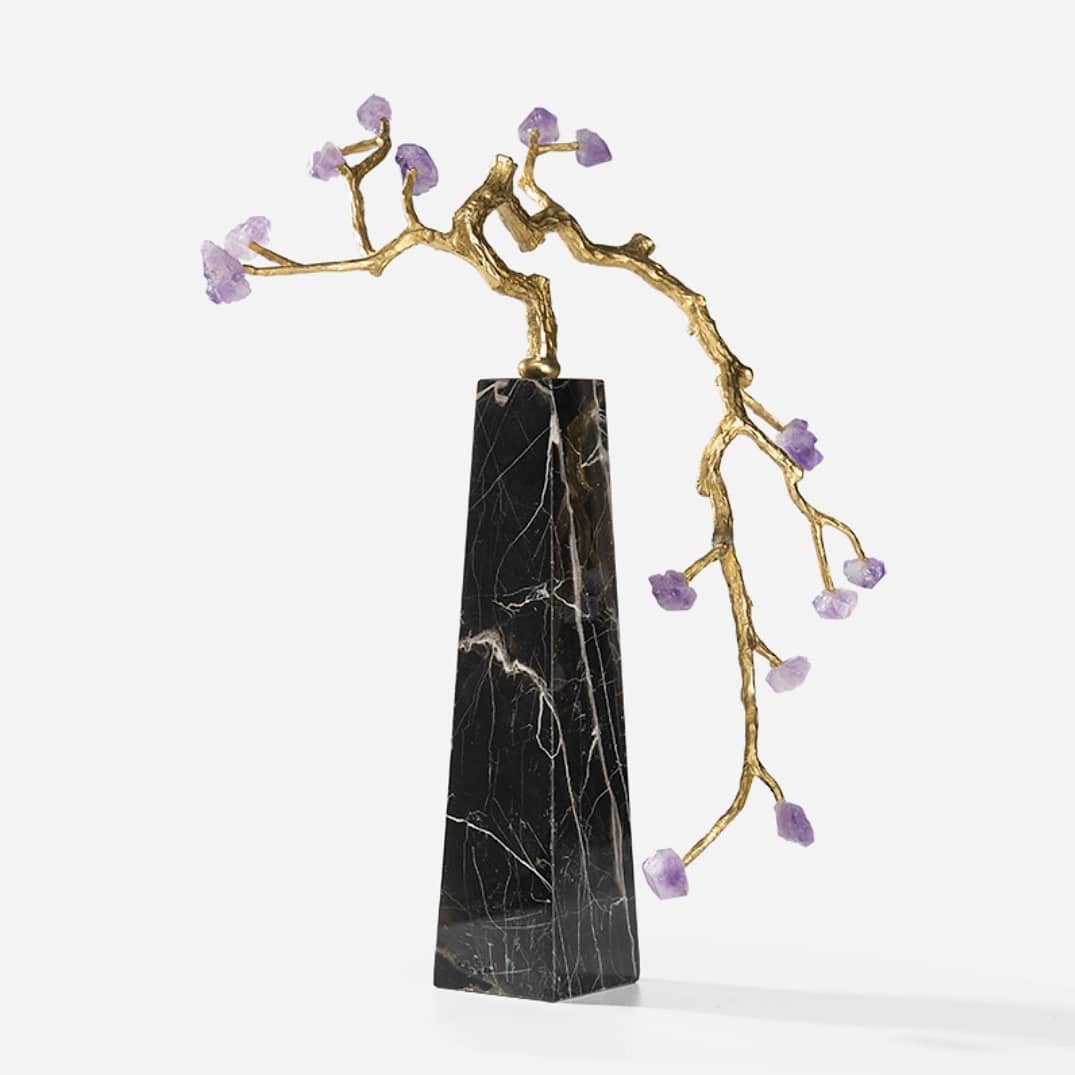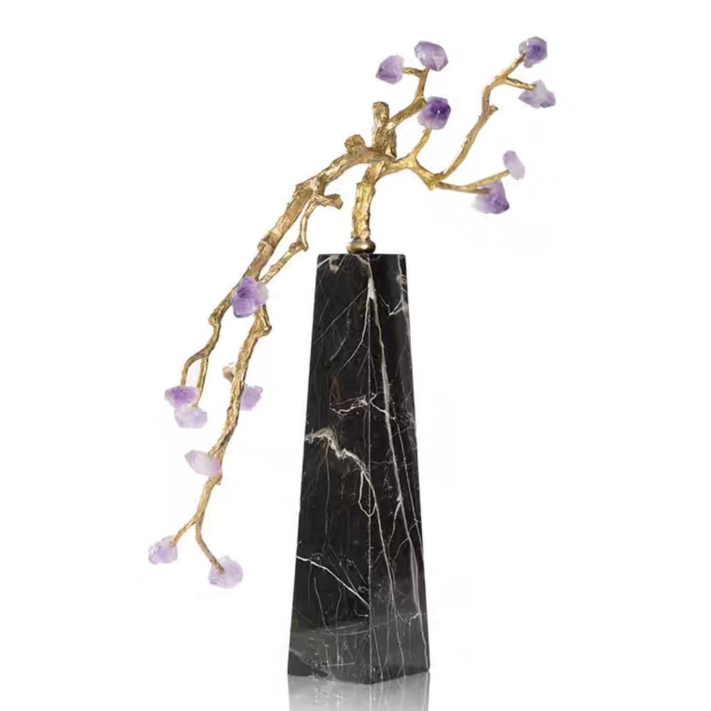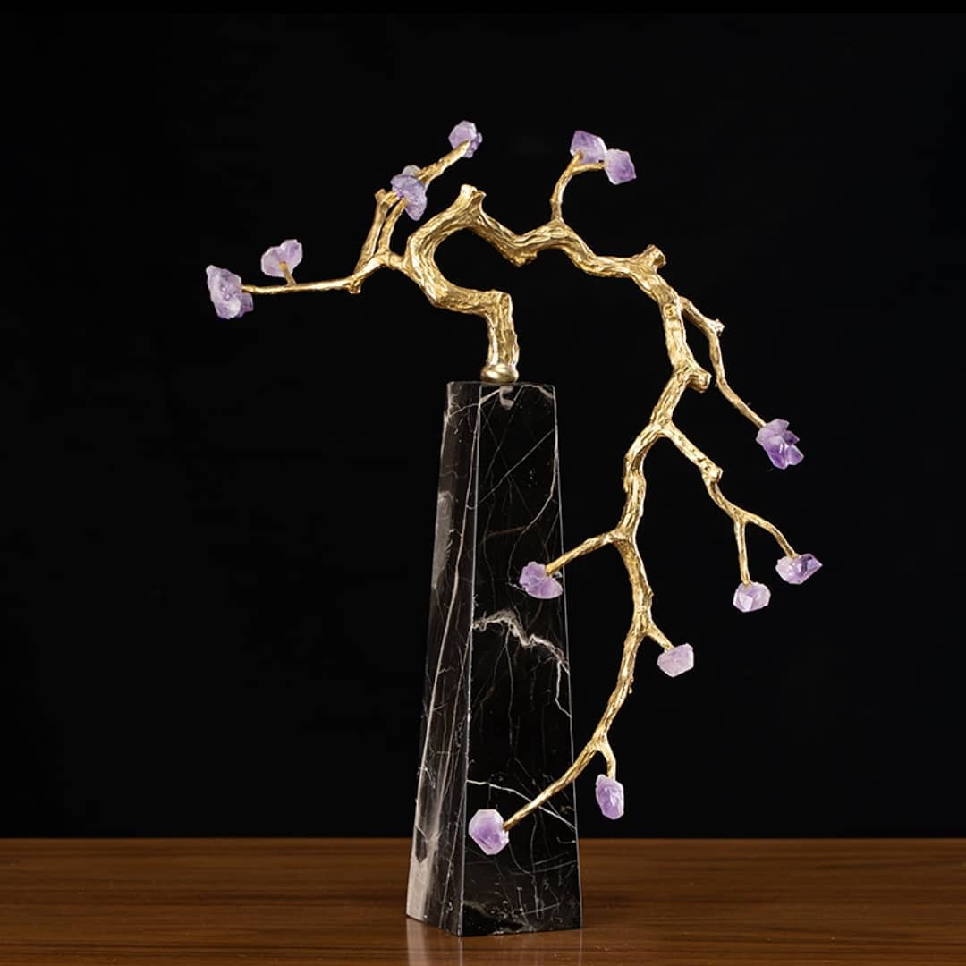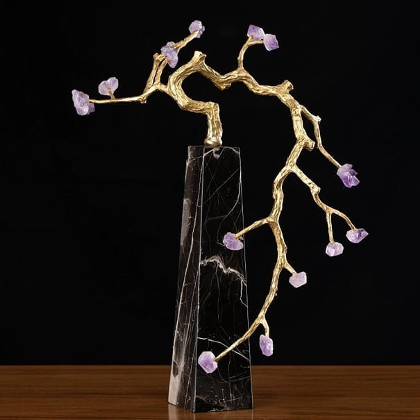 Изящное, нежное деревце из благородной латуни и очаровательных кристаллов аметиста. Подставка – натуральный черный мрамор с прожилками. Шикарный декор, который украсит ваш интерьер – домашний и (или) деловой. Прекрасный акцент в вашем личном пространстве!
