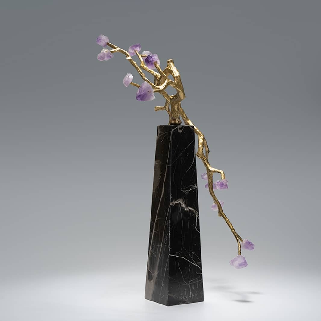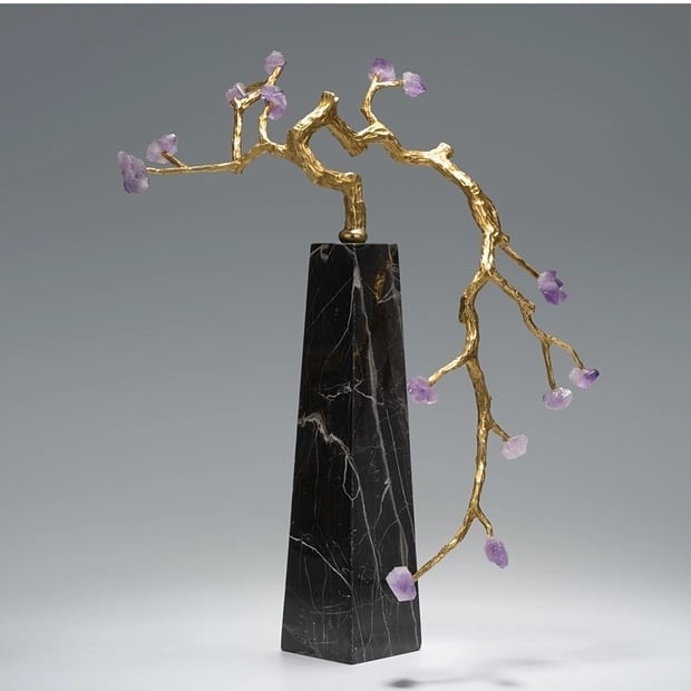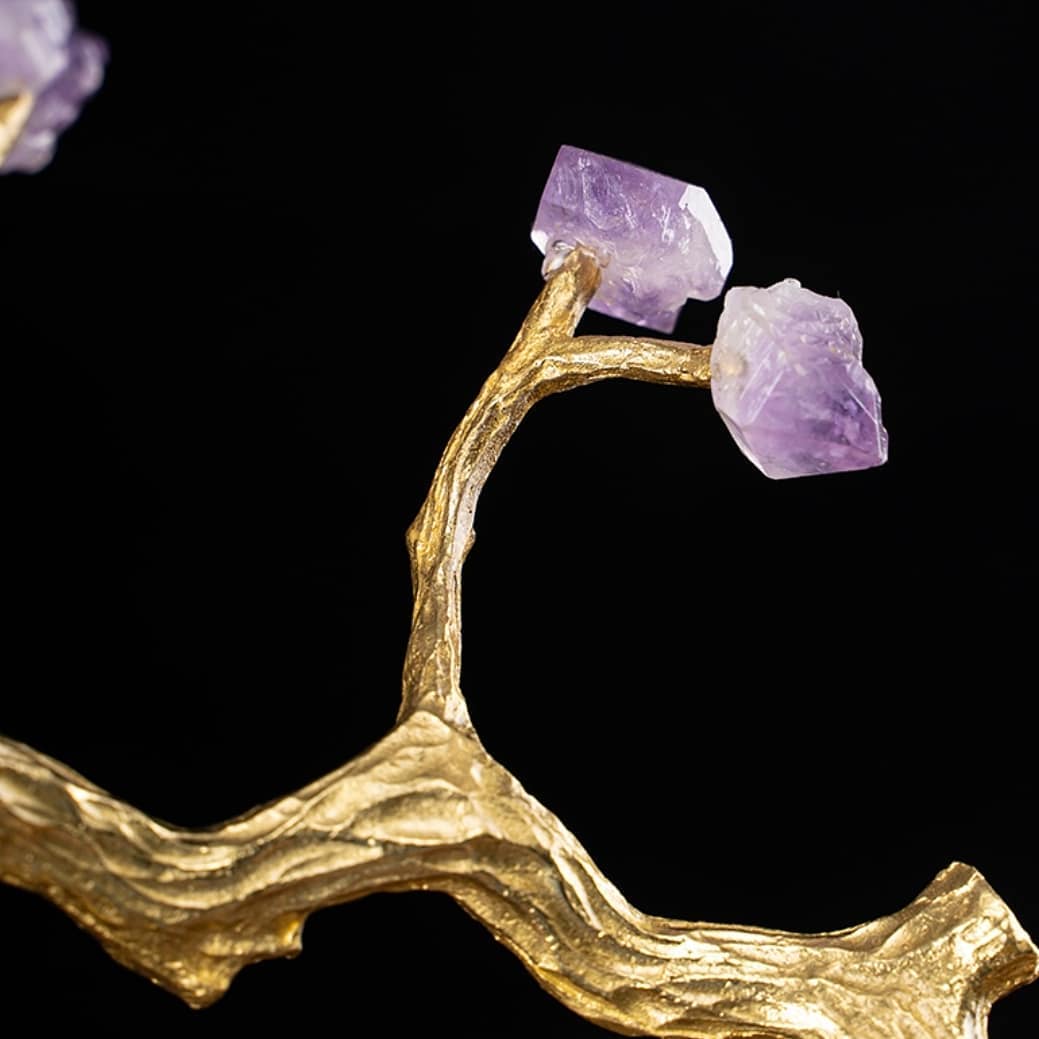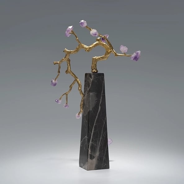 Изящное, нежное деревце из благородной латуни и очаровательных кристаллов аметиста. Подставка – натуральный черный мрамор с прожилками. Шикарный декор, который украсит ваш интерьер – домашний и (или) деловой. Прекрасный акцент в вашем личном пространстве!
