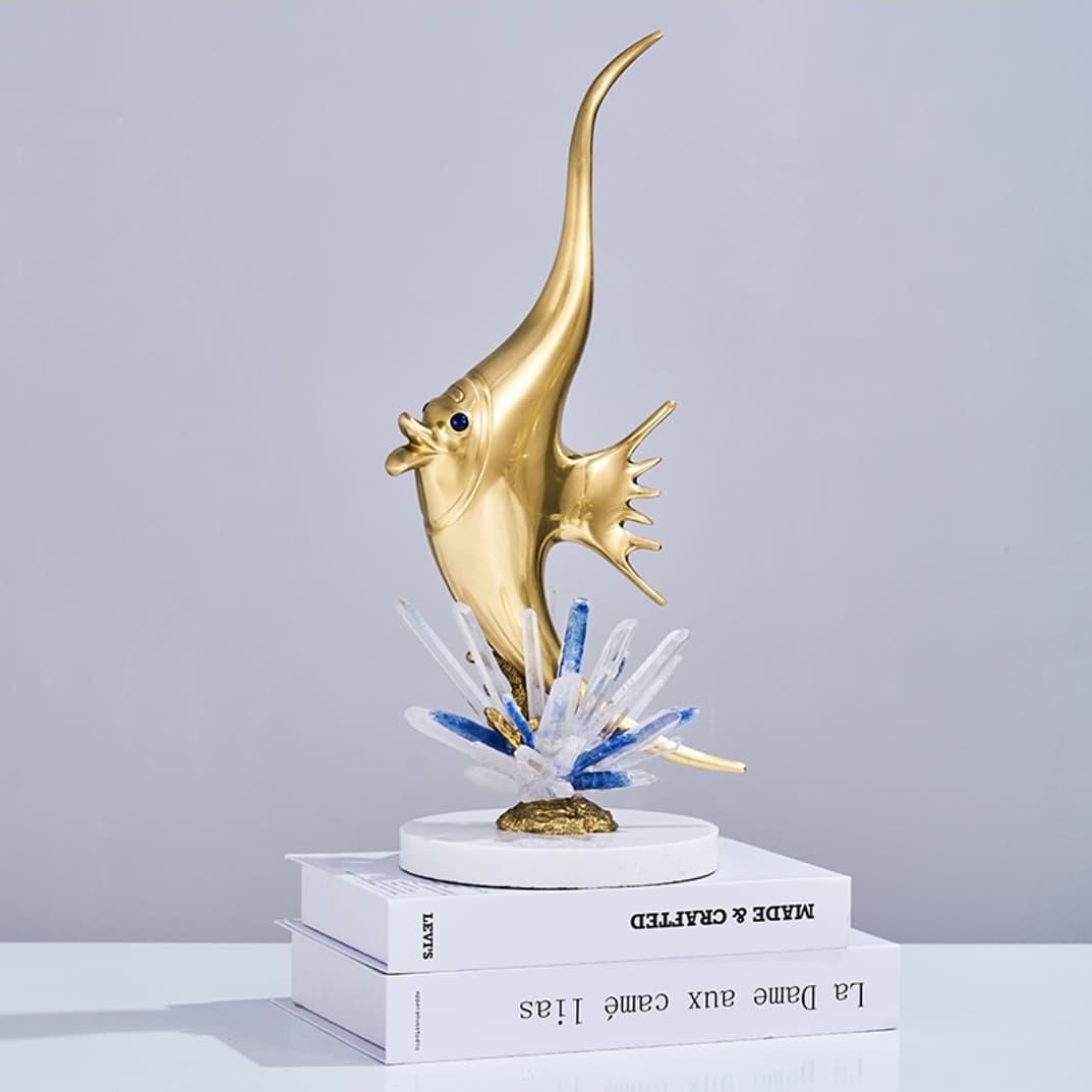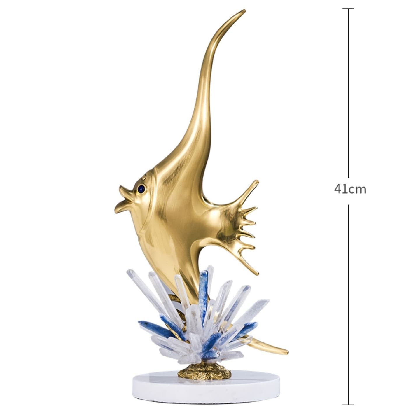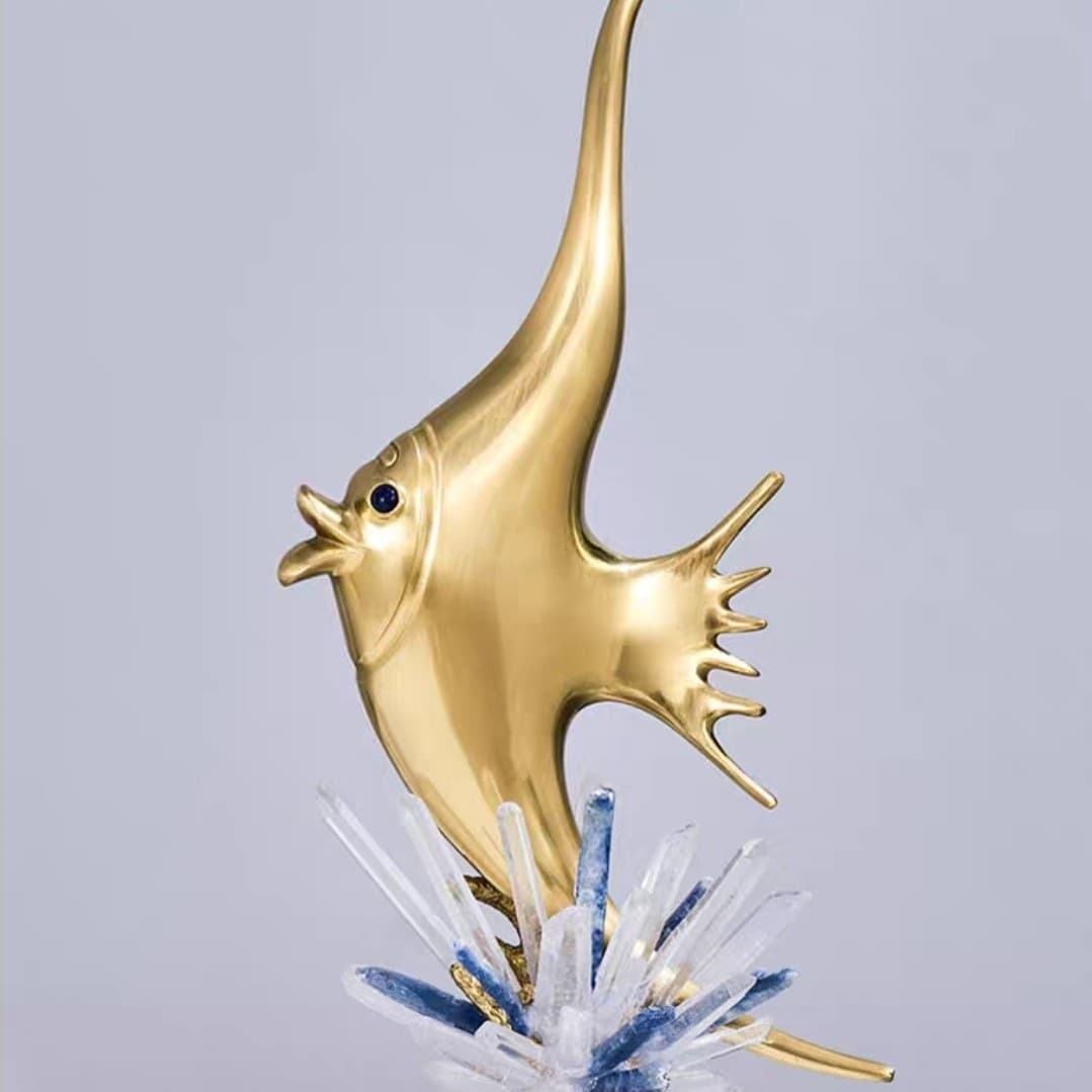 Роскошные рыбки из благородной латуни, на подставке из натурального мрамора, и в окружении очаровательных кристаллов горного хрустали и содалита. Шикарный декор для тех, кто родился под знаком Рыб, для тех, чей бизнес связан с морской стихией, красотами подводного царства и т.д. А ещё для тех, кто просто ценит изящные, красивые и яркие вещи.