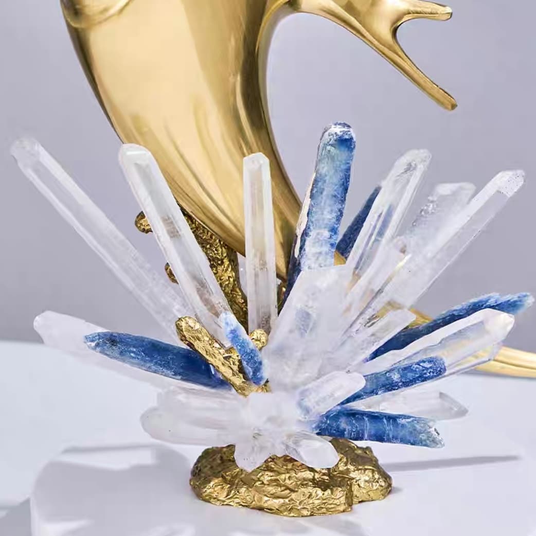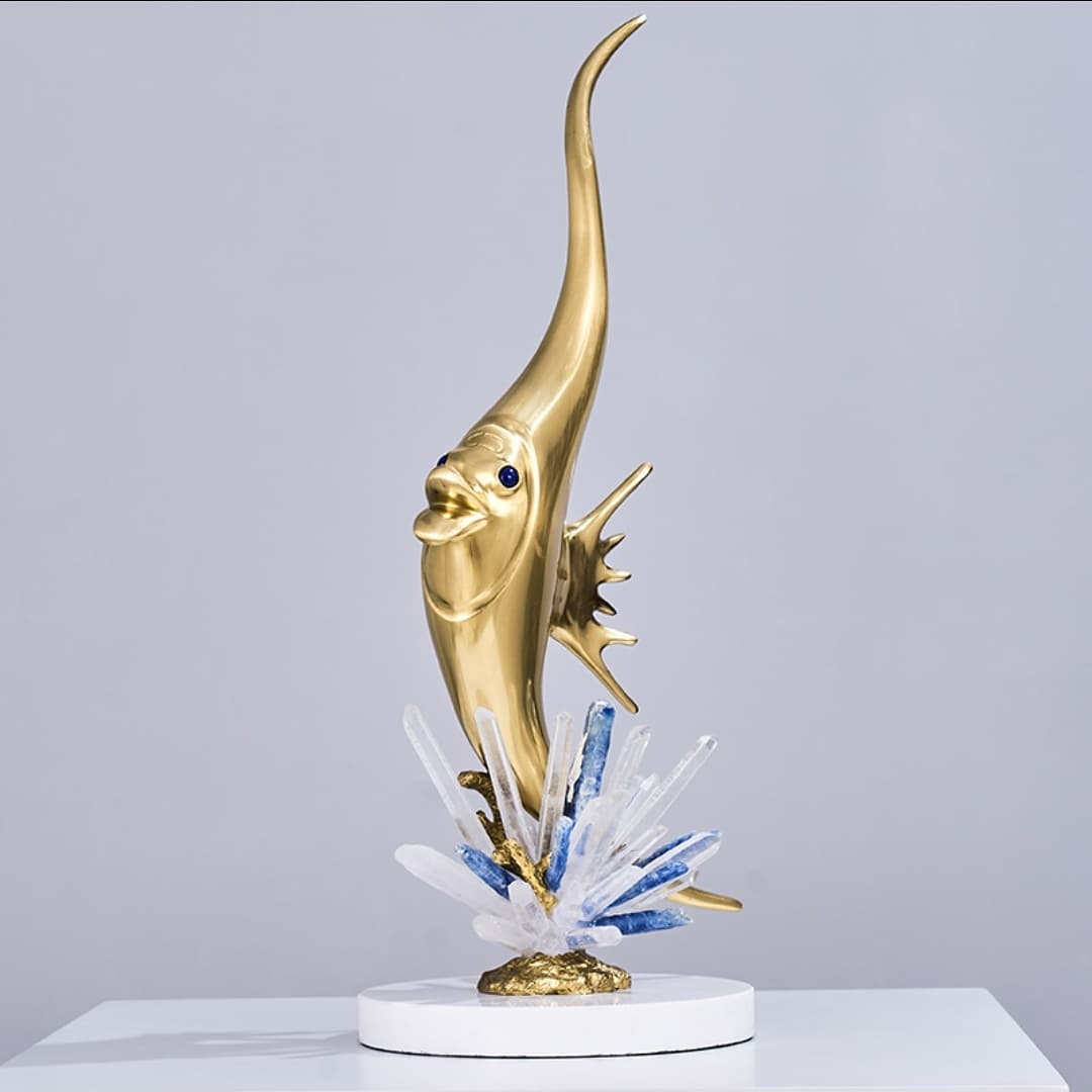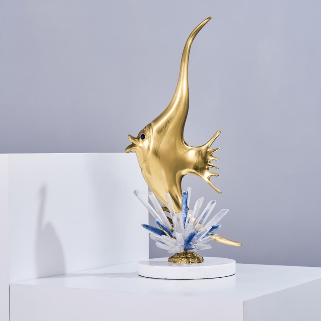 Роскошные рыбки из благородной латуни, на подставке из натурального мрамора, и в окружении очаровательных кристаллов горного хрустали и содалита. Шикарный декор для тех, кто родился под знаком Рыб, для тех, чей бизнес связан с морской стихией, красотами подводного царства и т.д. А ещё для тех, кто просто ценит изящные, красивые и яркие вещи.