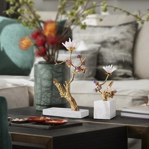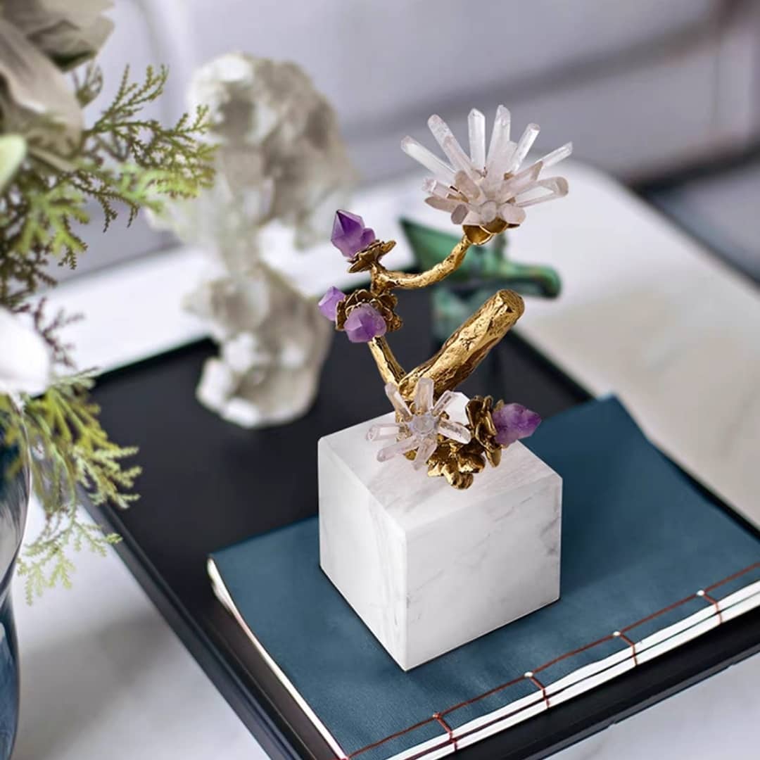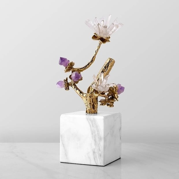 Блестящее трио очаровательных цветов. Декор из натуральных, отборных кристаллов аметиста, чистейшего горного хрустали, мрамора и благородной латуни. Шикарное украшение для стильного домашнего и (или) делового интерьера. Яркий, позитивный акцент в вашем личном пространстве.