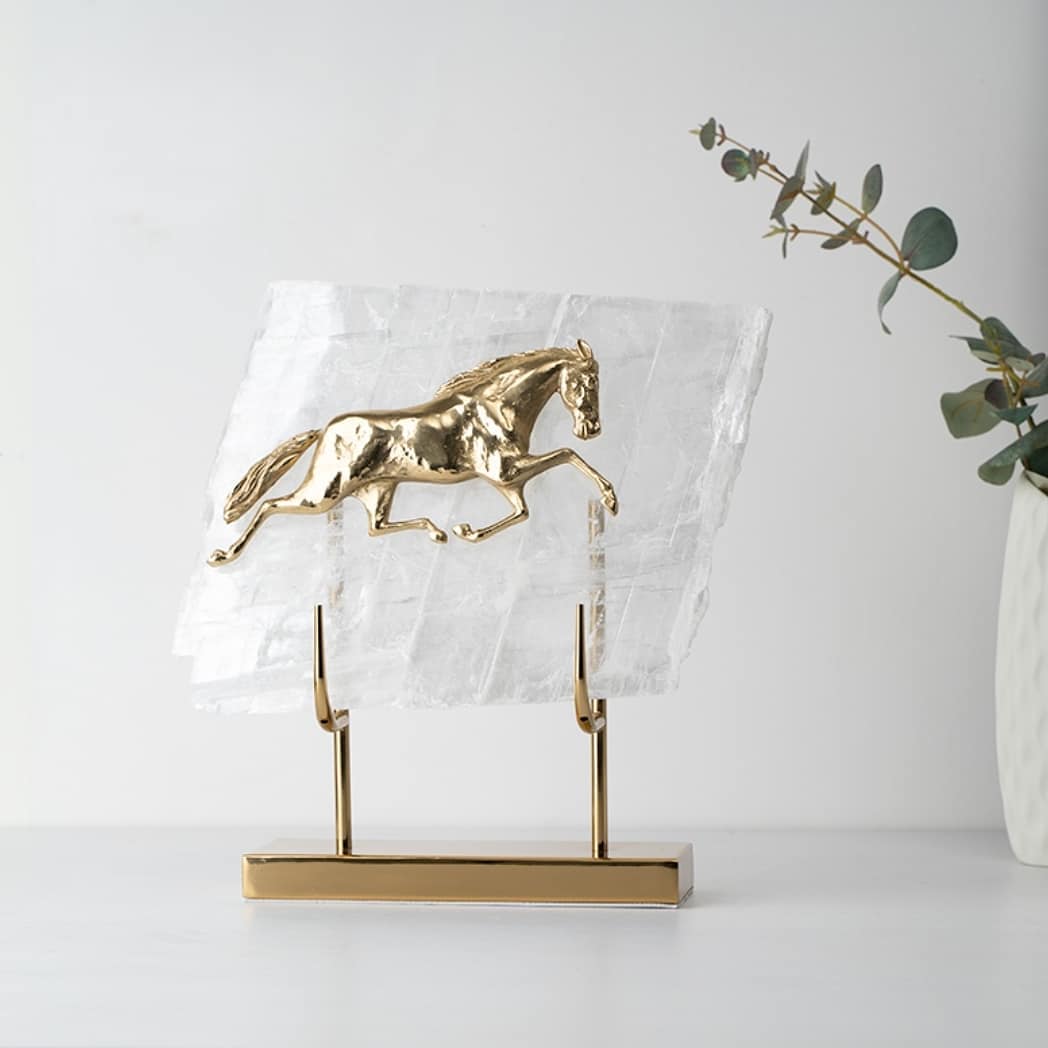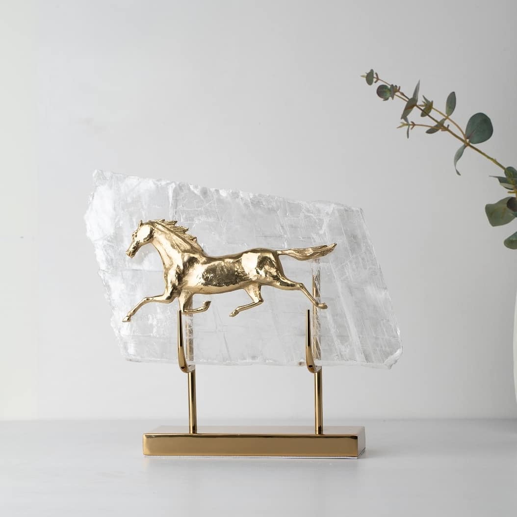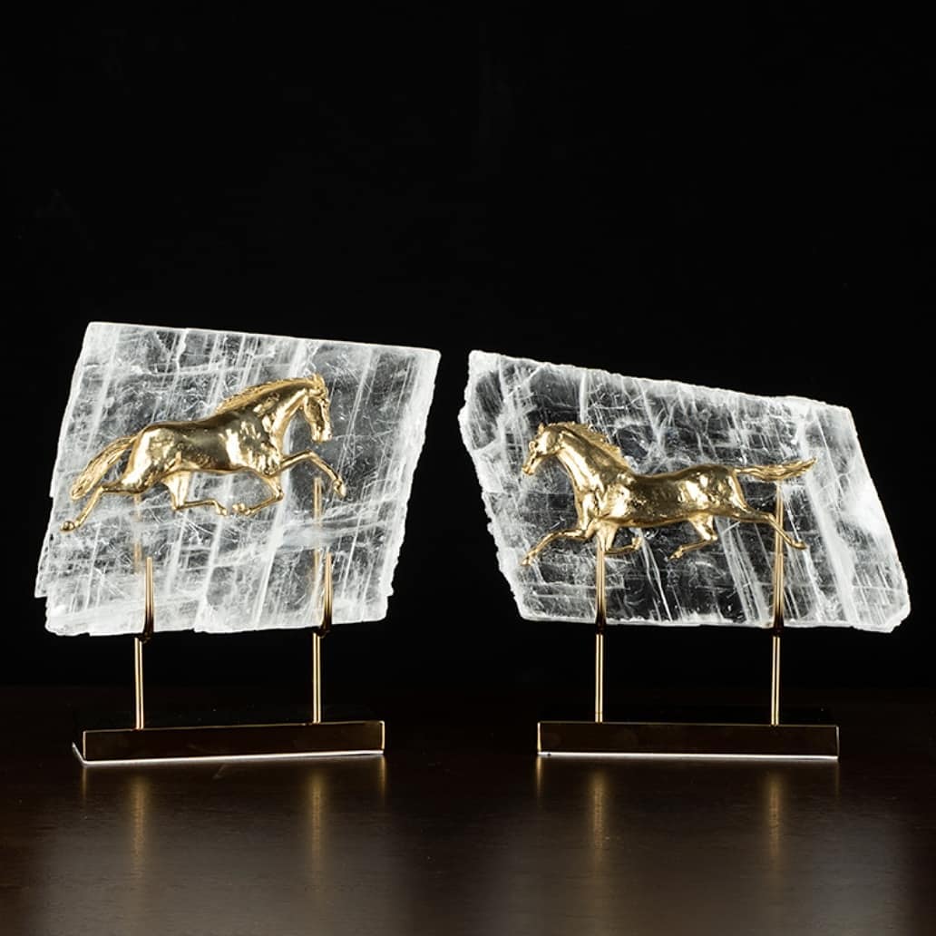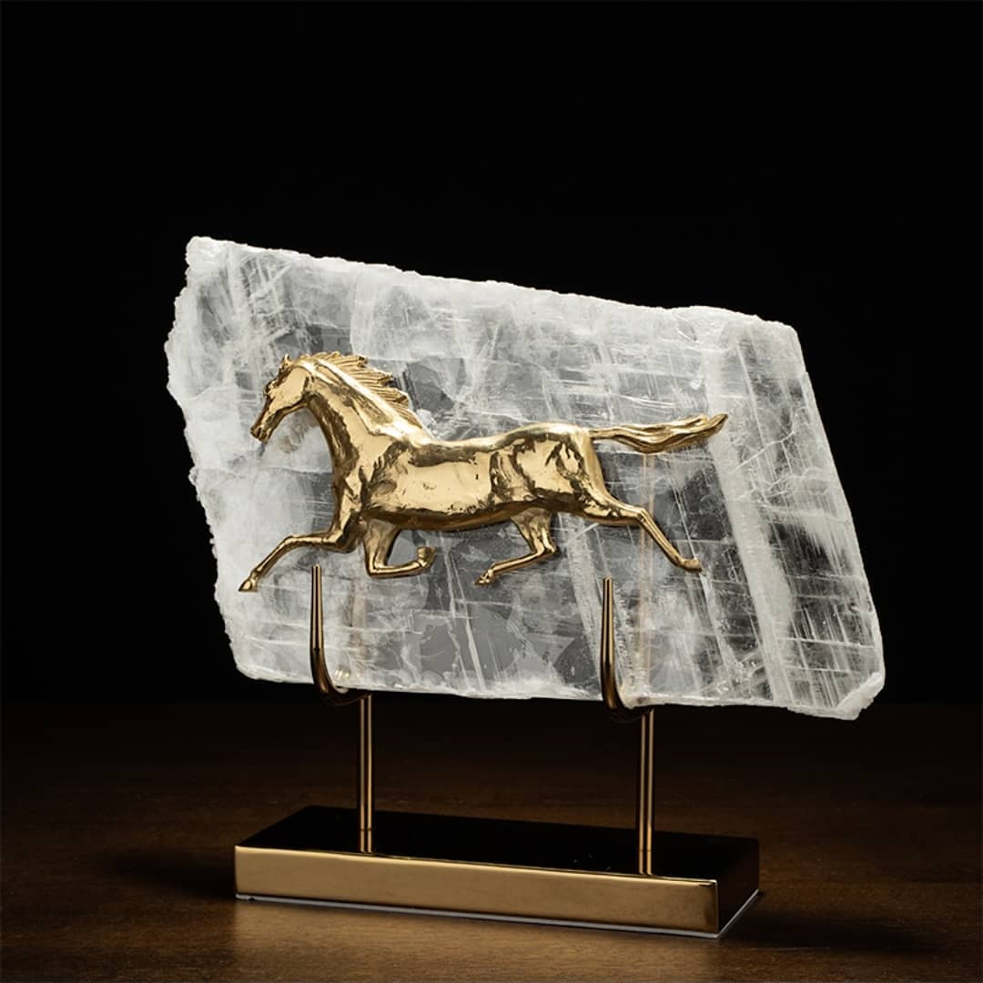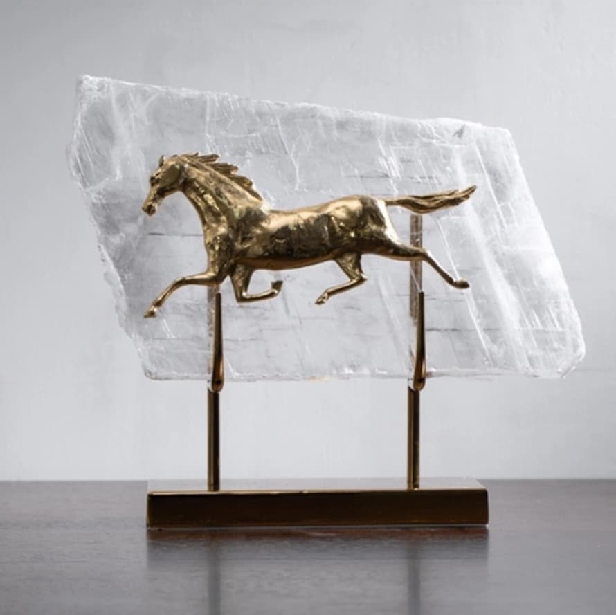 Шикарный декор, в котором материалы отлично сочетаются и дополняют друг друга. Экспрессия движения очаровательной лошадки и освежающая, «ледяная» статика кварца – контраст, порождающий и сильные эмоции, и вдохновляющую мотивацию для достижения личных целей.