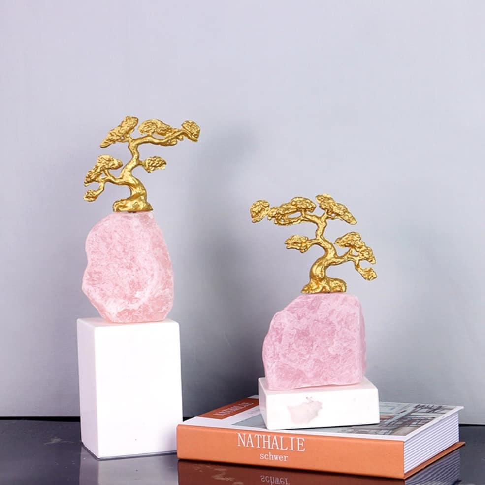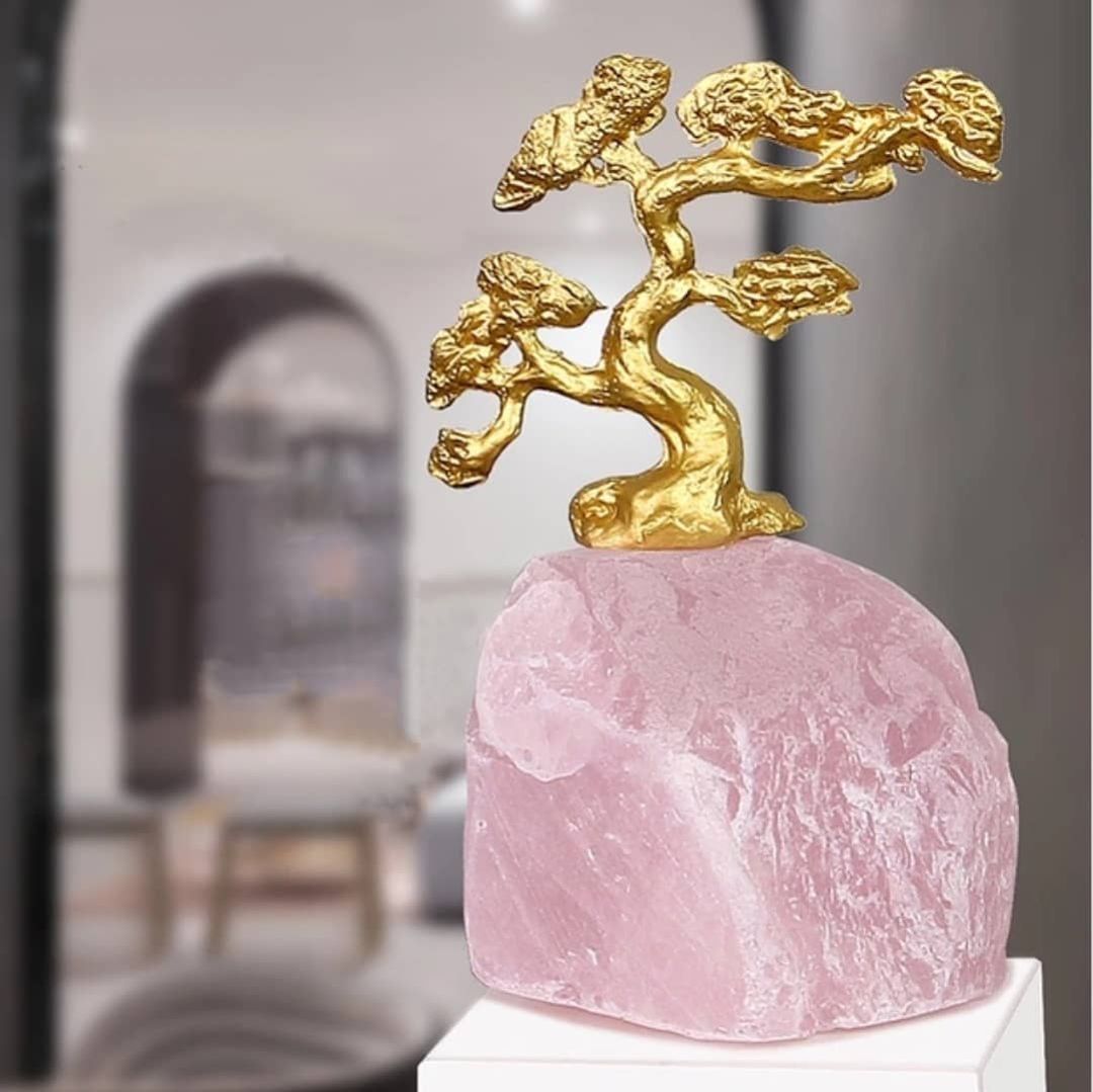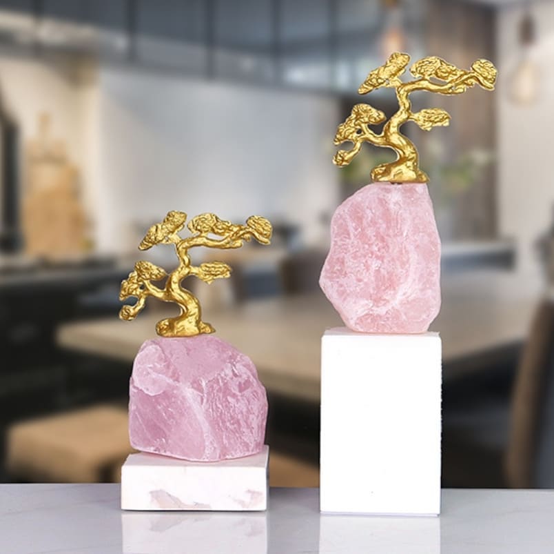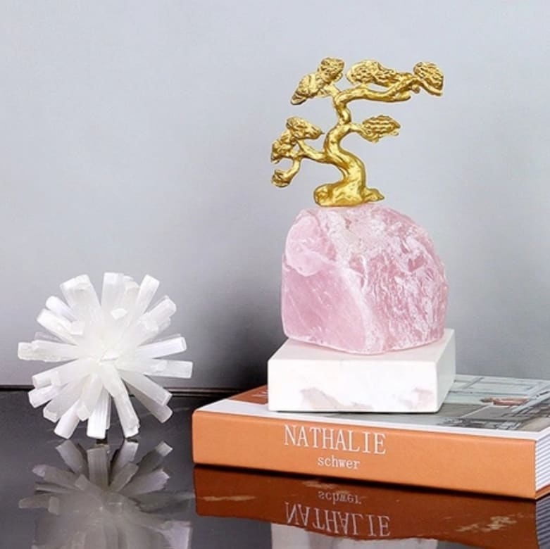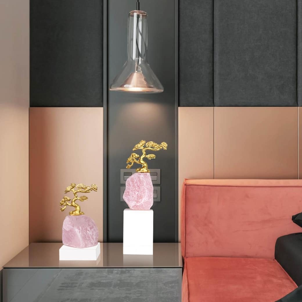 В роскошном декоре, который мы предлагаем вашему вниманию – целых два древних, мощных символа – Мировое древо, и Мировая гора. Очаровательный розовый кварц, благородная латунь, белоснежный мрамор.