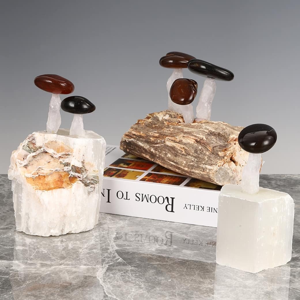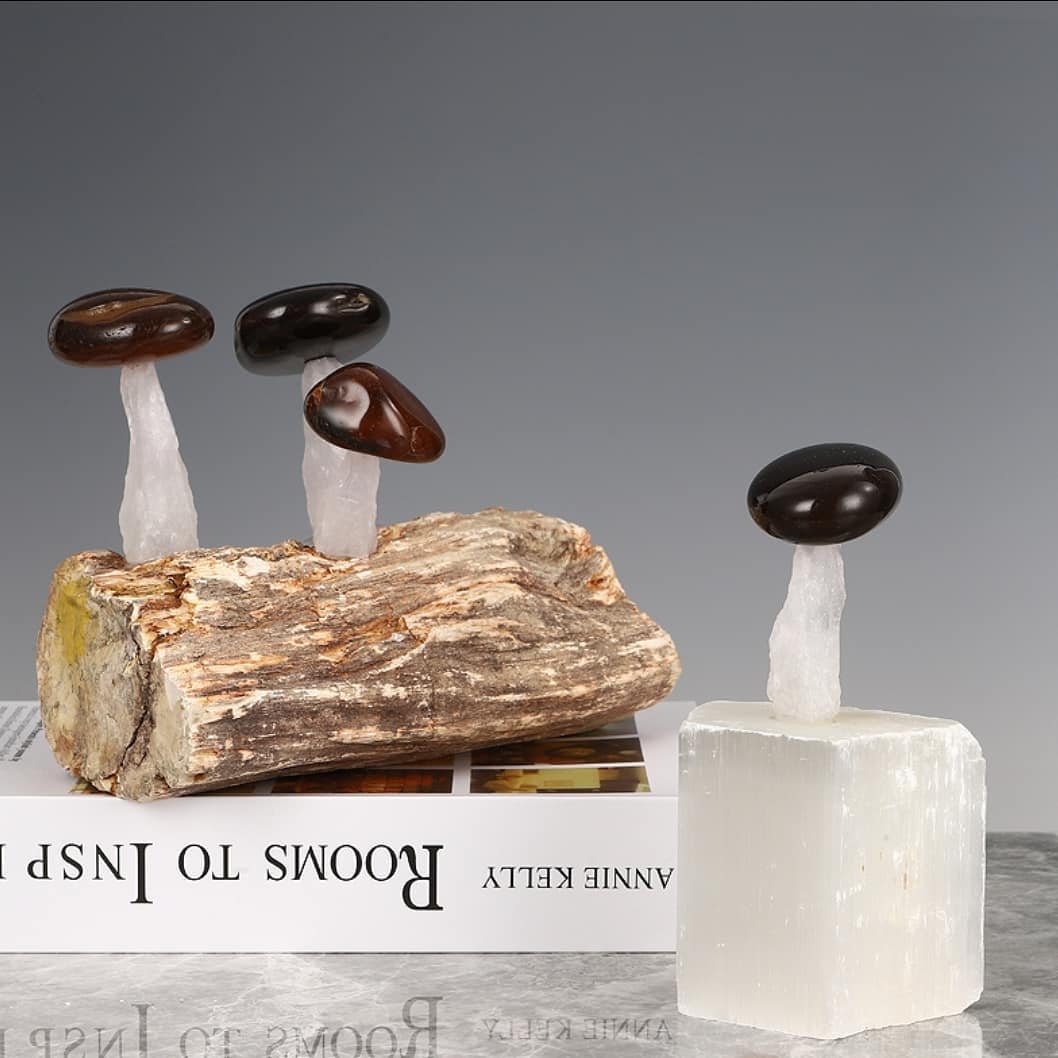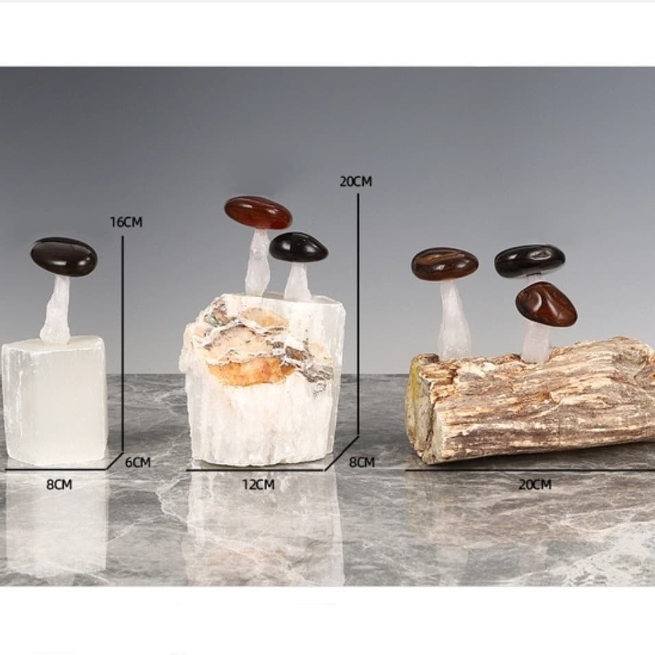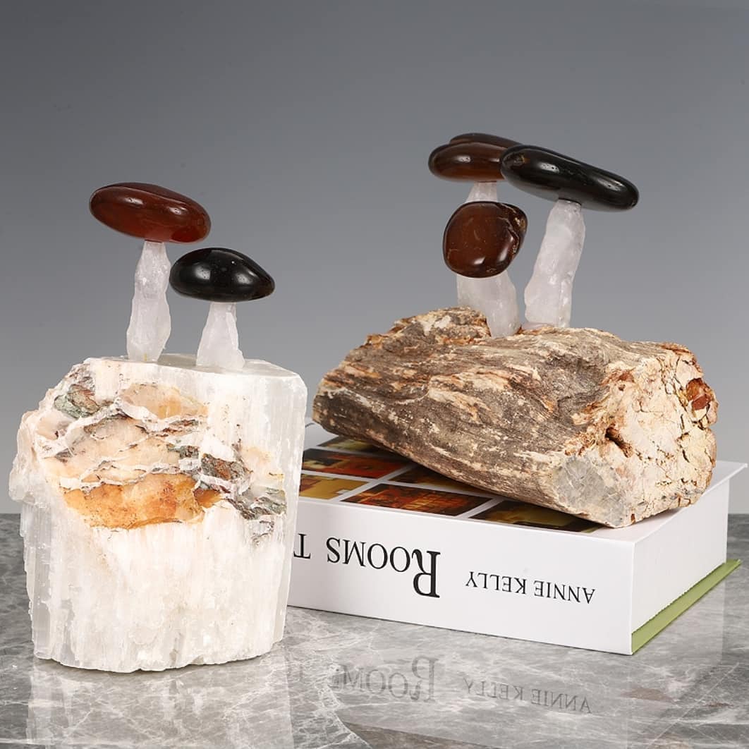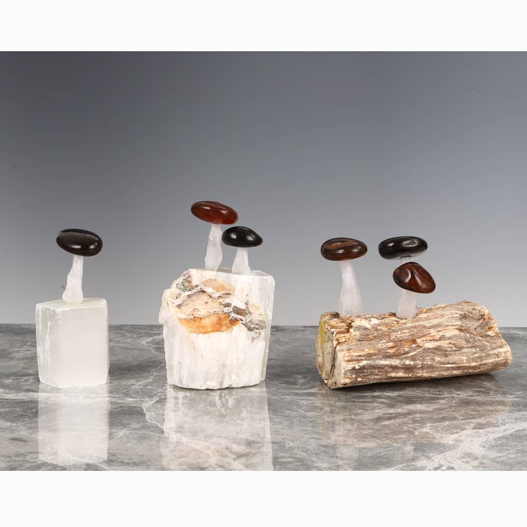 Шикарный декор! Супер-грибочки со шляпками из натуральных самоцветов – черного и красного агата. Ножки у них из белоснежного кварца, а растут они и на кварце, и на окаменелом дереве, возрастом более двух сотен миллионов лет. Отличное, раритетное и невероятно головокружительное украшение для солидного и стильного интерьера.