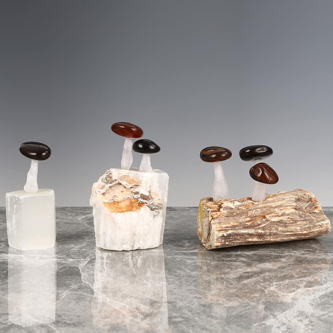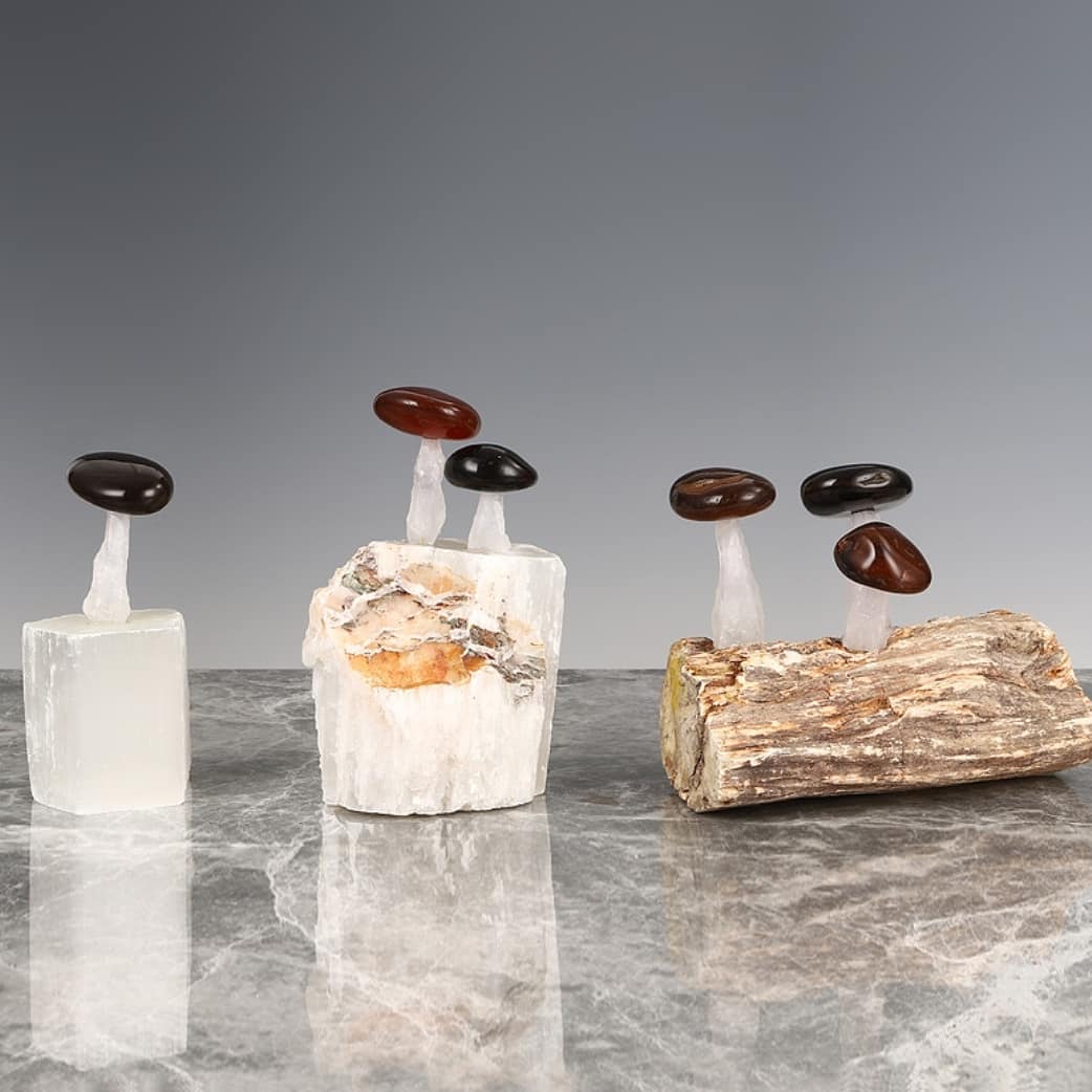 Статуэтка Грибочки из агата на подставке из окаменелого дерева
