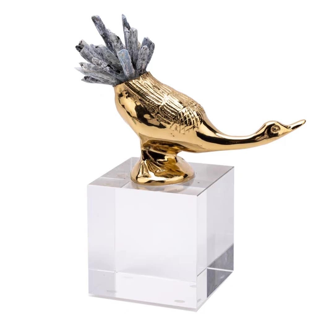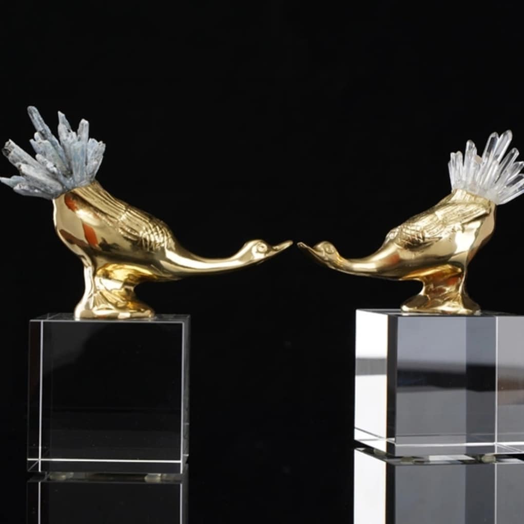 Красивый и яркий взгляд на знаменитых уточек, которые с давних пор считаются символом счастливой семьи и помогают избавиться от одиночества. Благородная латунь и отборные кристаллы чистейшего горного хрусталя и селенита. Талисман, усиленный магией самоцветов – и оригинальный, яркий декор для вашего интерьера.