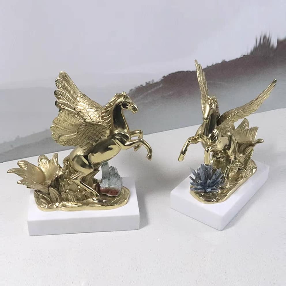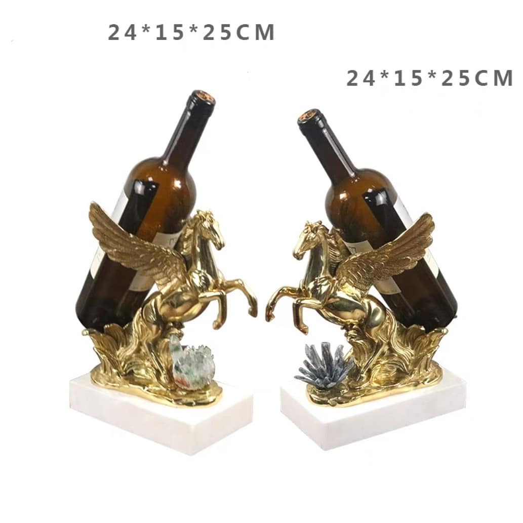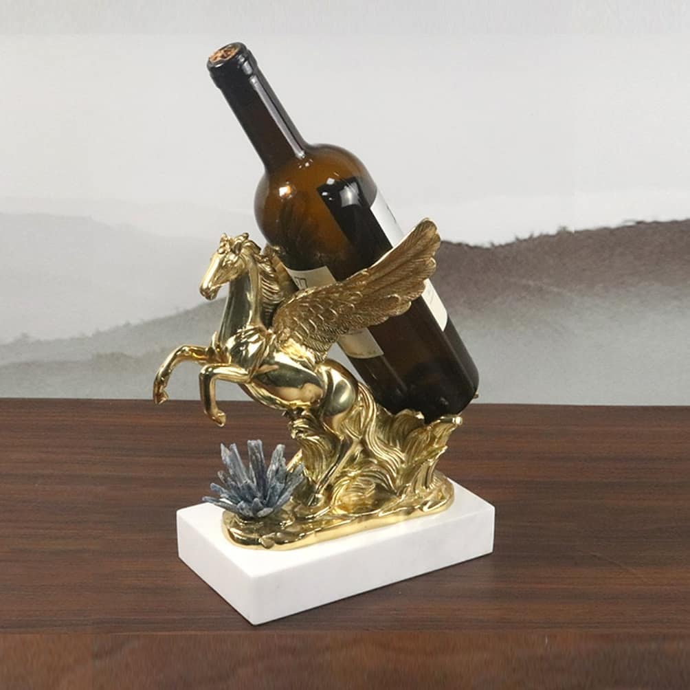 Декоративный держатель для вина от Monsterior Gems. И в нём прекрасно всё! Роскошный пегас из благородной латуни, натуральные кристаллы селенита и подставка из мрамора. Вдохновляющий декор, словно высокая поэзия, обретшая материальные формы. Шикарное украшение для праздников, банкетов и повседневной жизни.