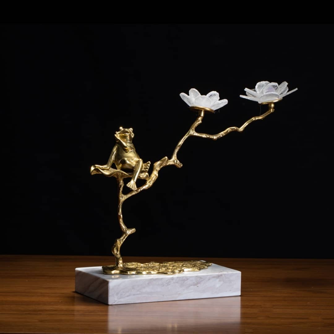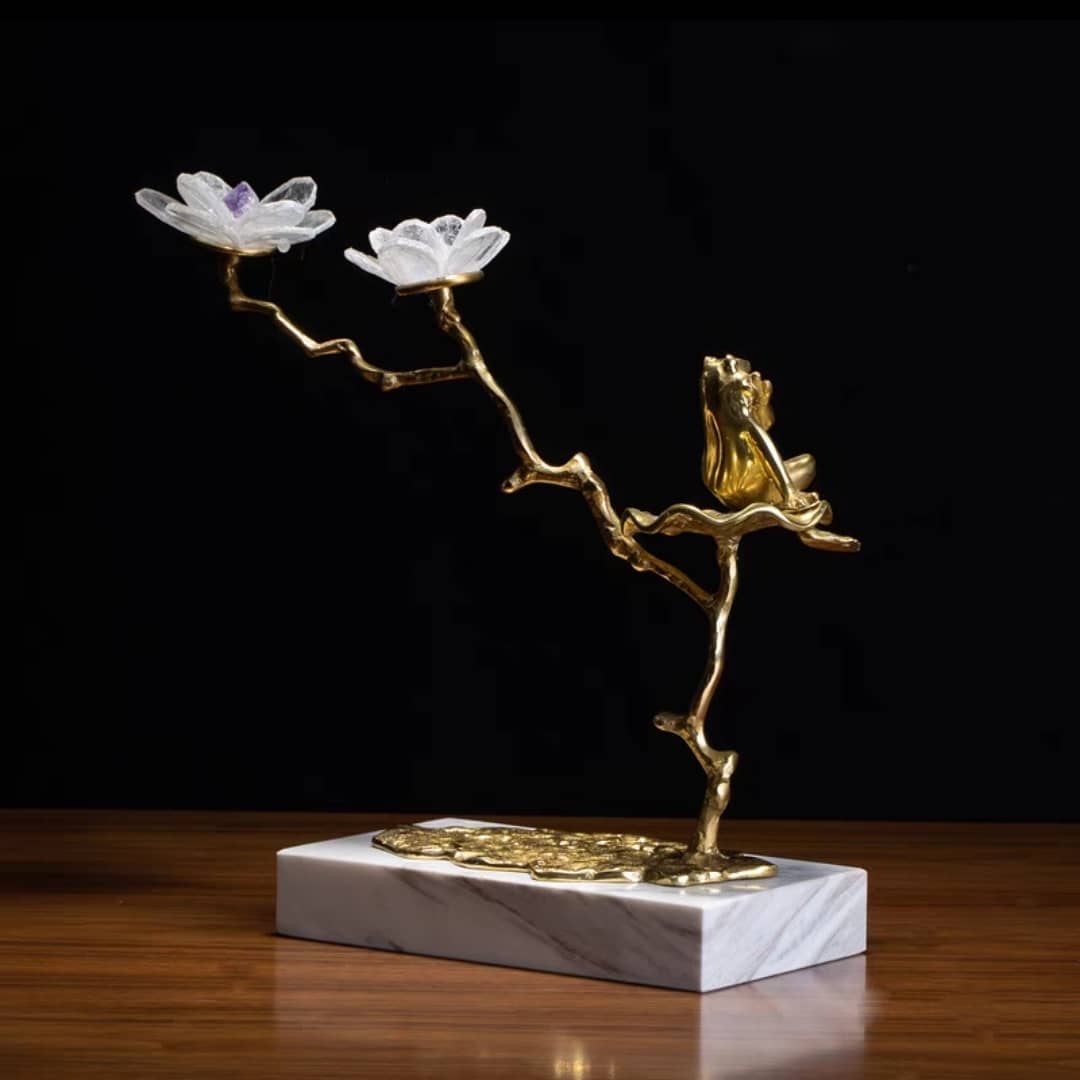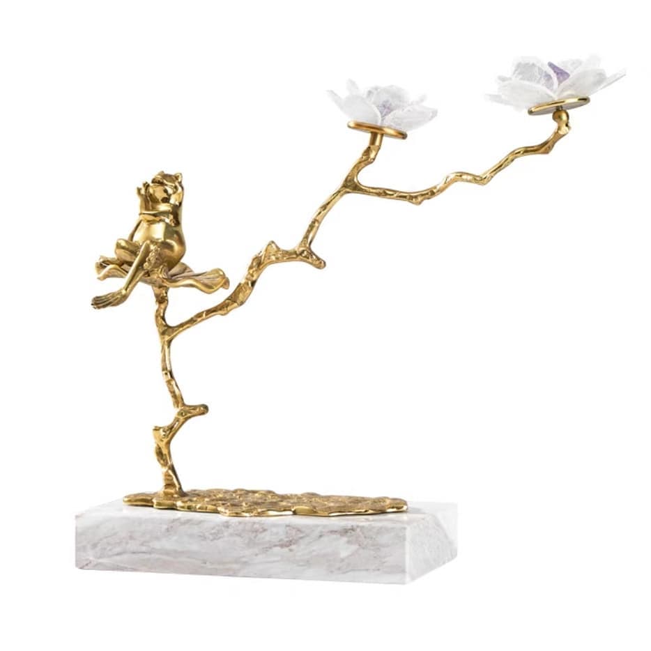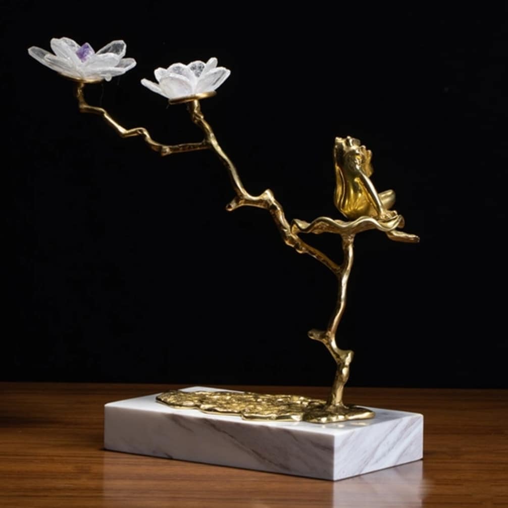 Очаровательная Благородная латунь, натуральный кварц и мрамор. Классный и оригинальный декор, создающий позитивное «денежная» лягушка, восседающая на прекрасном фэнтезийном деревце. настроение. Симпатичная лягушка и цветочки отлично впишутся в современный стильный интерьер – домашний и (или) деловой.