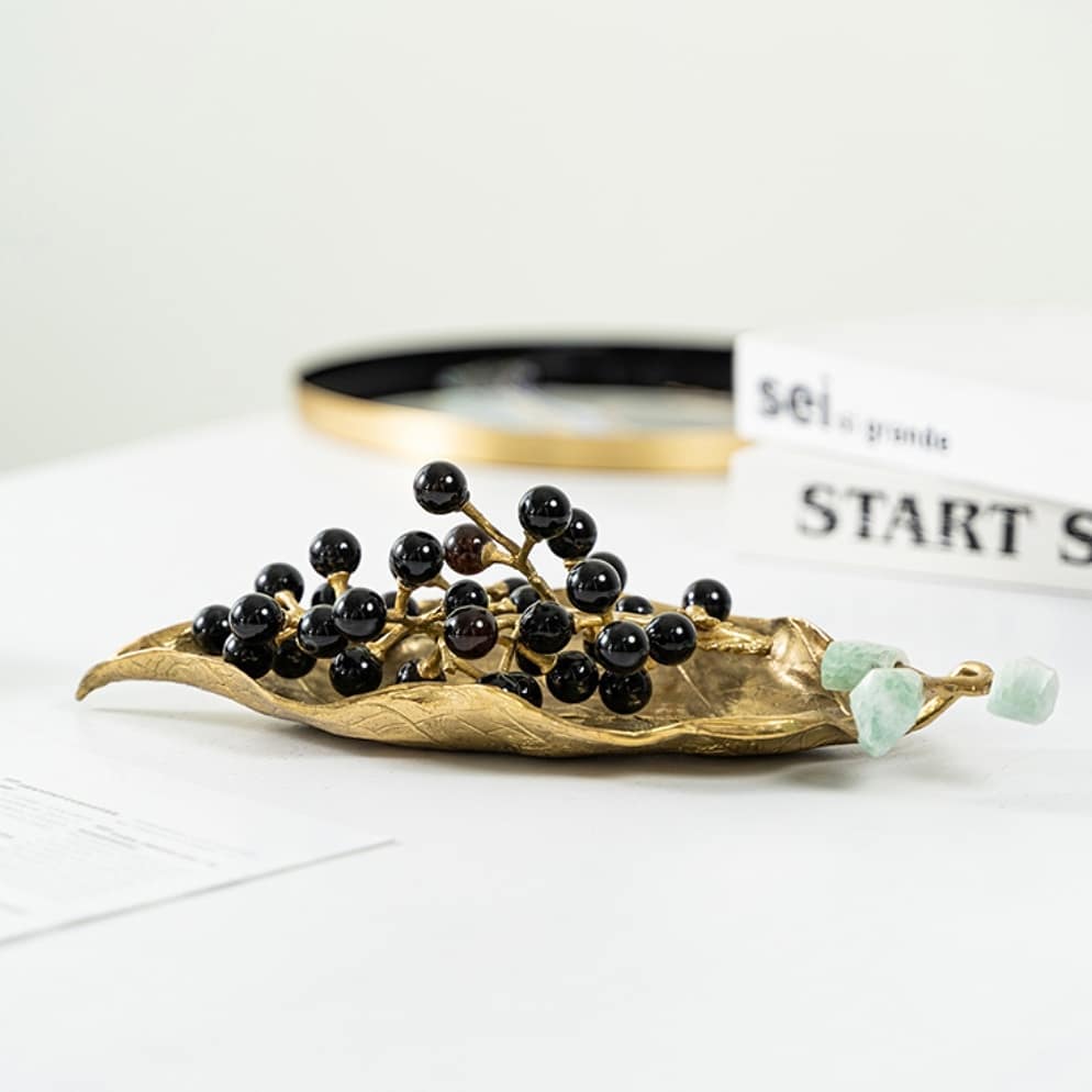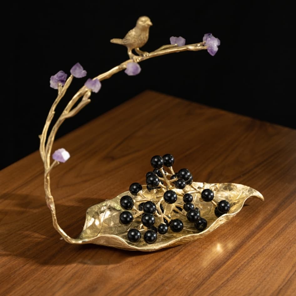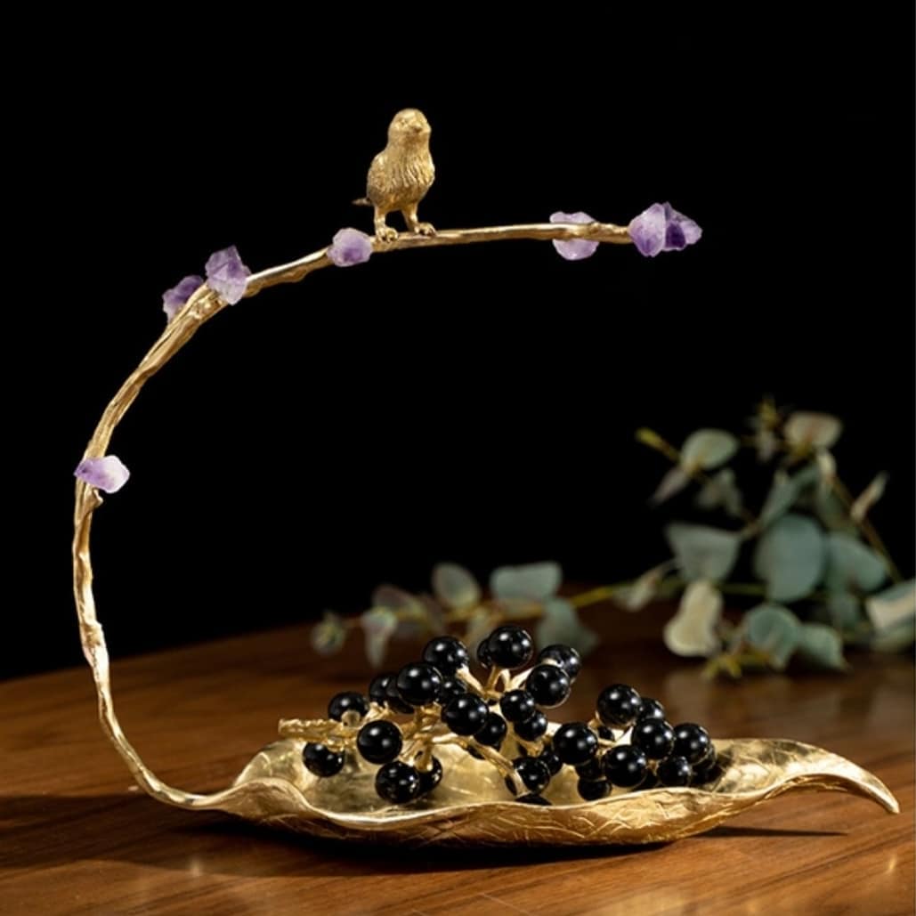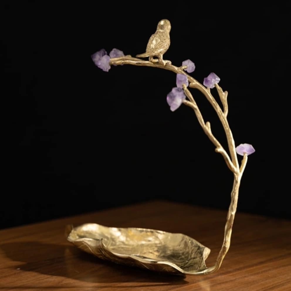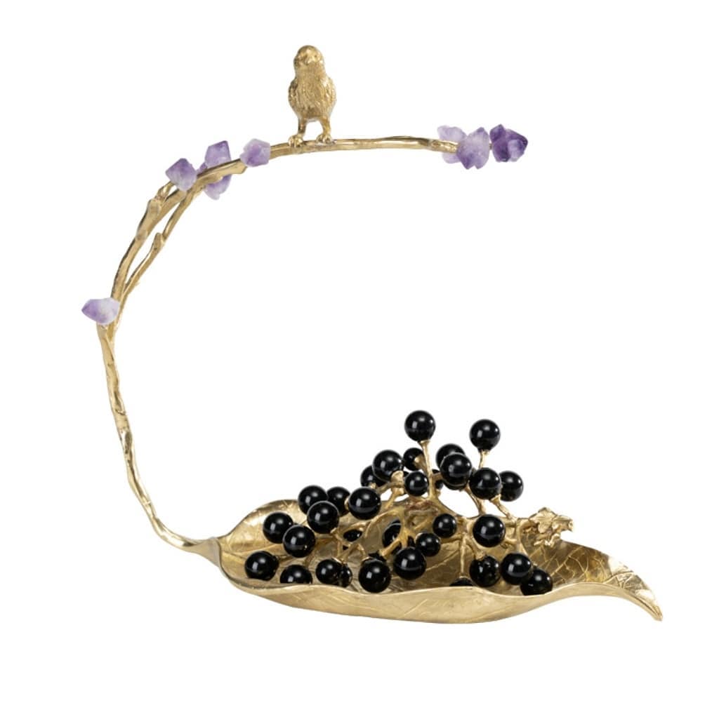 Линейка яркого и практичного декора! Птичка на латунно-аметистовой веточке, с «листиком», в который можно положить любимые украшения, ключи и т.п. Очаровательные ягоды из легендарного обсидиана и отдельный «листик» с кристаллами флюорита.