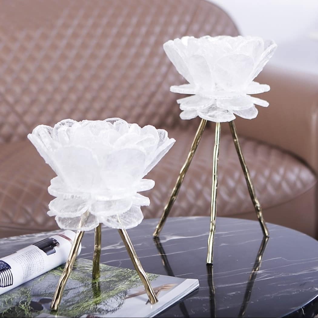Белоснежный цветок-подсвечник из натурального кварца и благородной латуни. Очаровательный и практичный декор, который украсит ваш интерьер, добавит в него стильного романтизма и уюта. Отлично подходит для свечей самых разных цветов. А игра огненных бликов на «льдинках» кварцевых лепестков – завораживает!